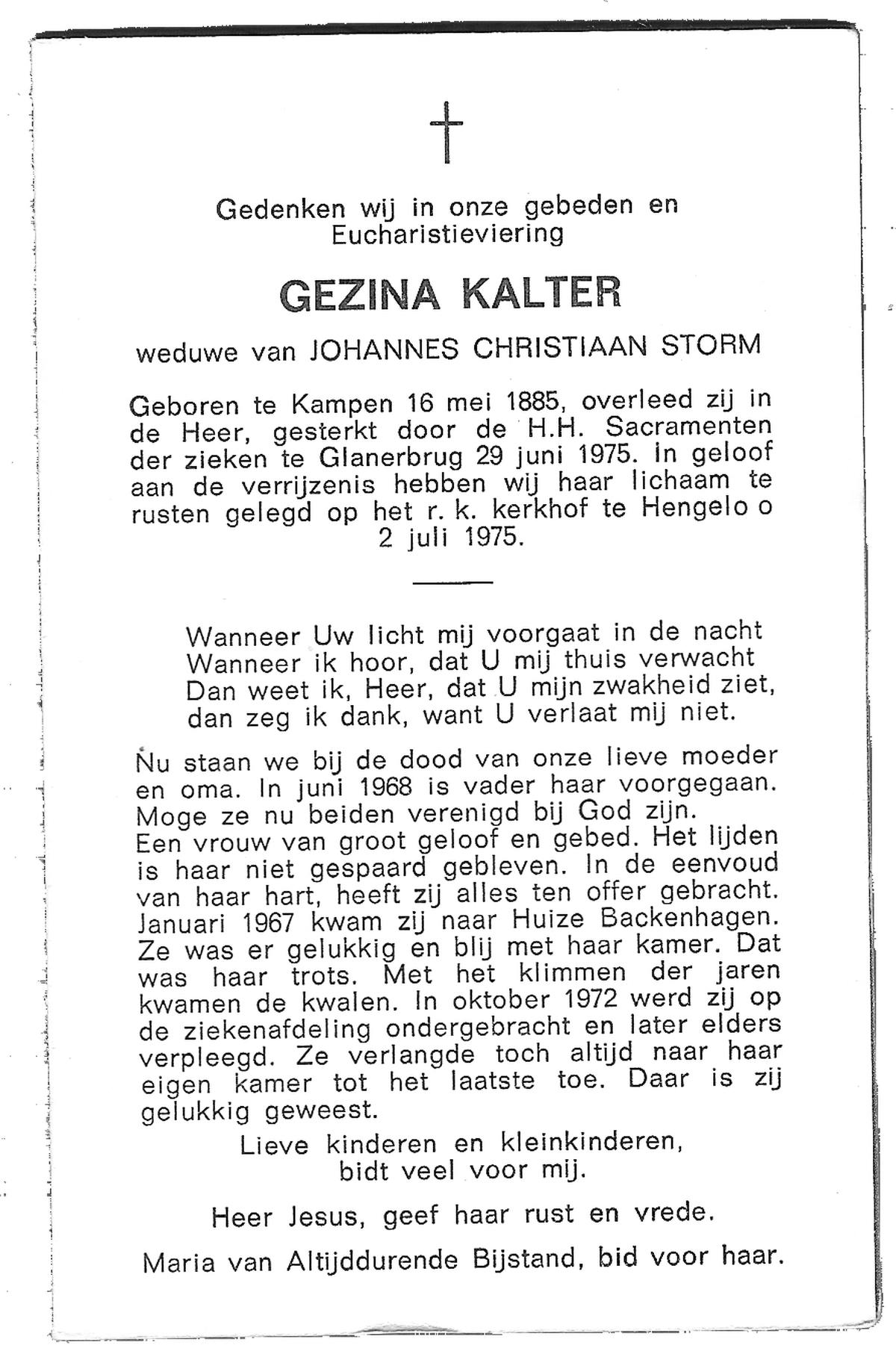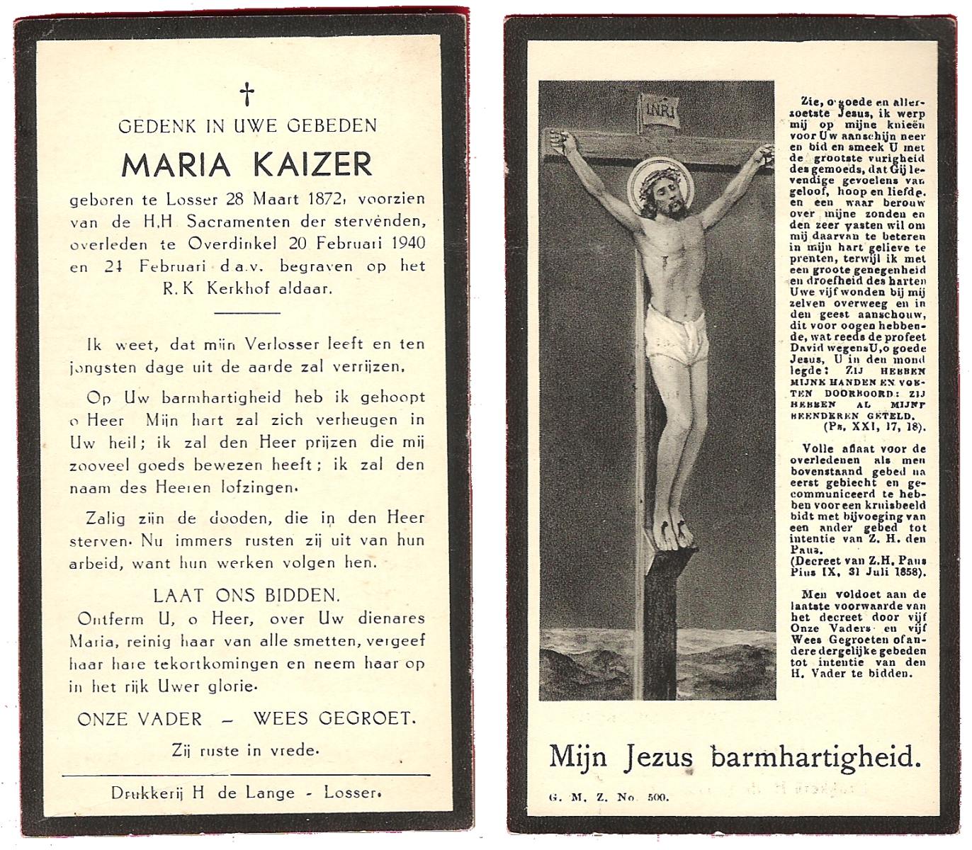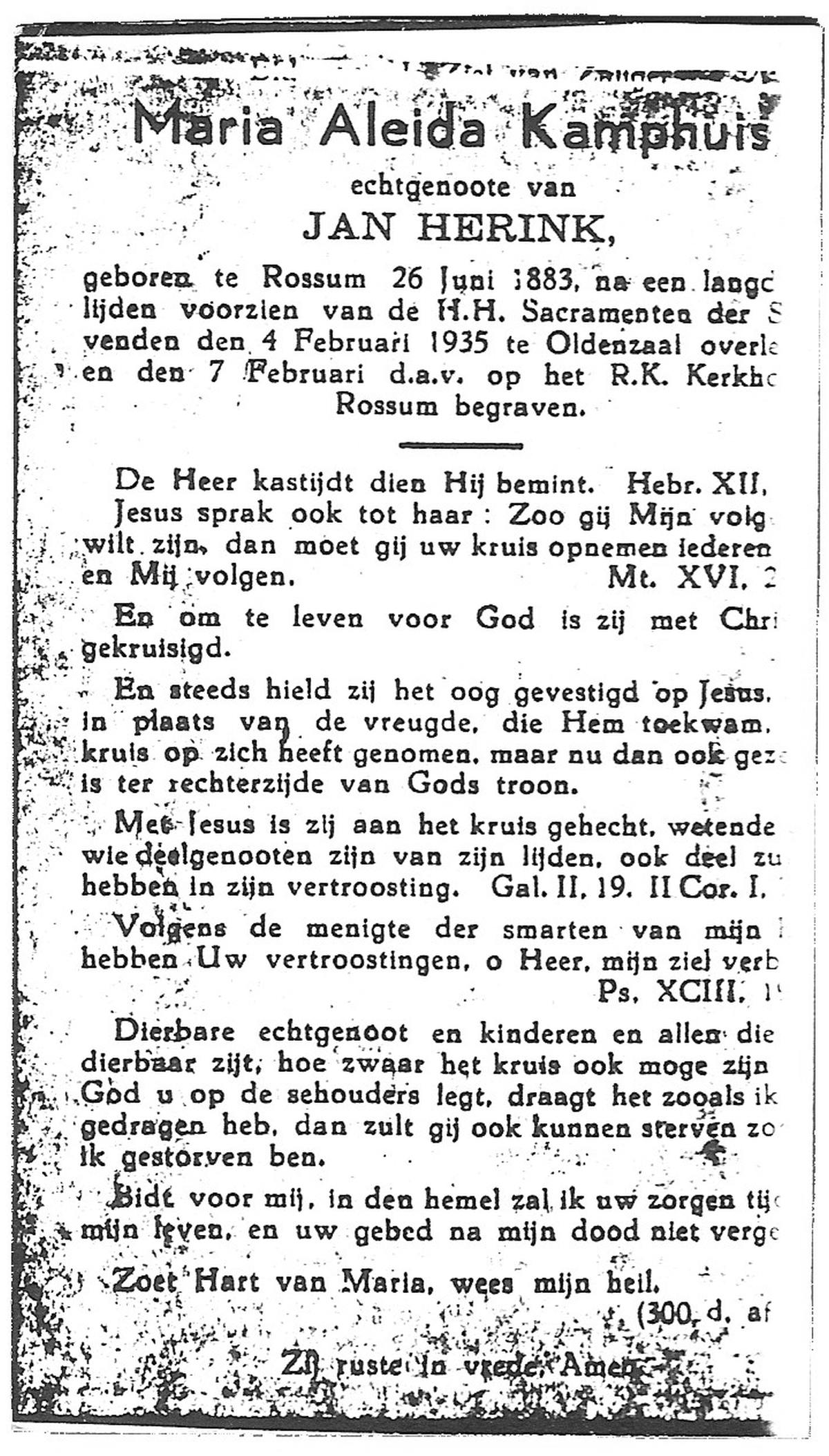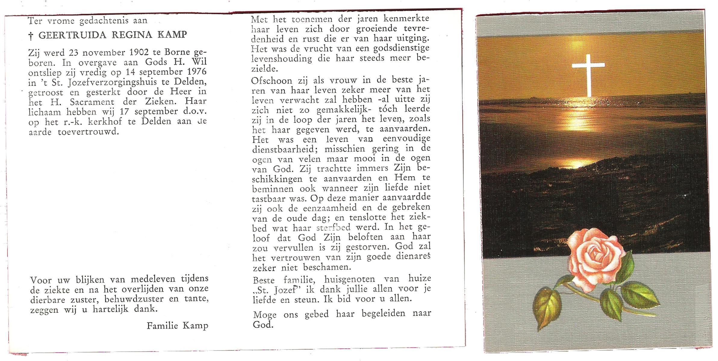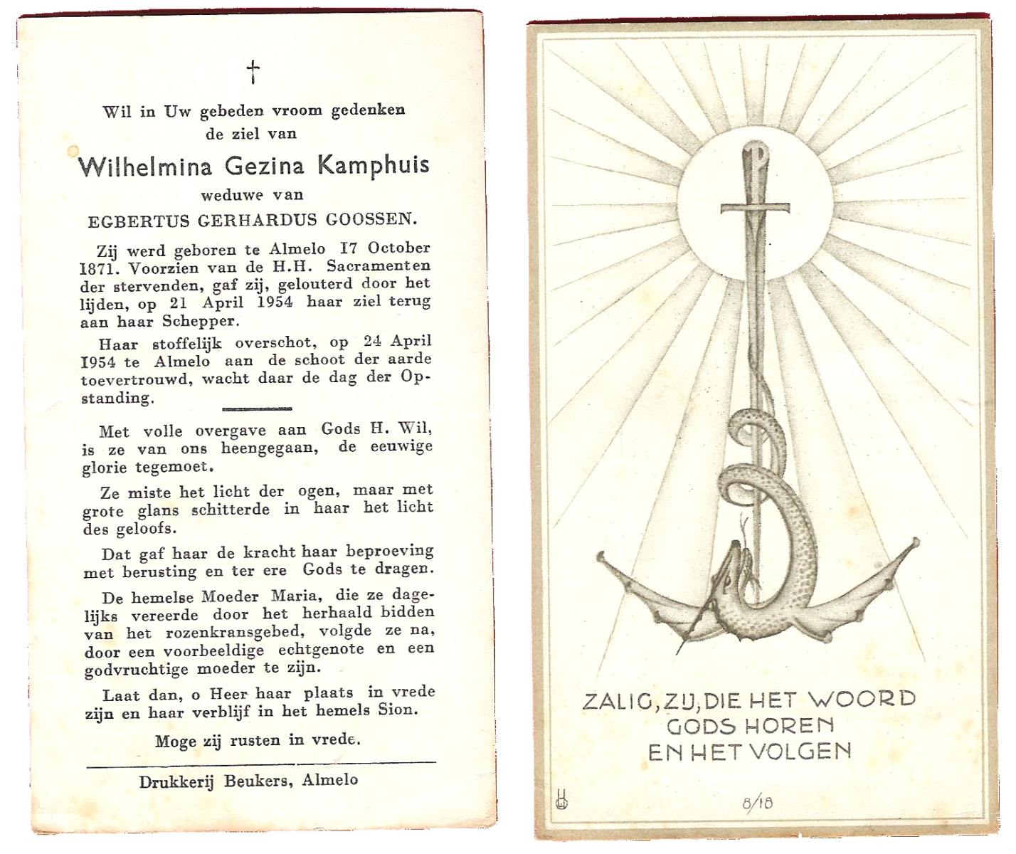 KAMPKUIPER, Gezina Maria, geboren op 23-05-1876 te Almelo, overleden op 5-4-1962 te Mariaparochie op 85-jarige leeftijd, begraven op 9-4-1962 te Mariaparochie.