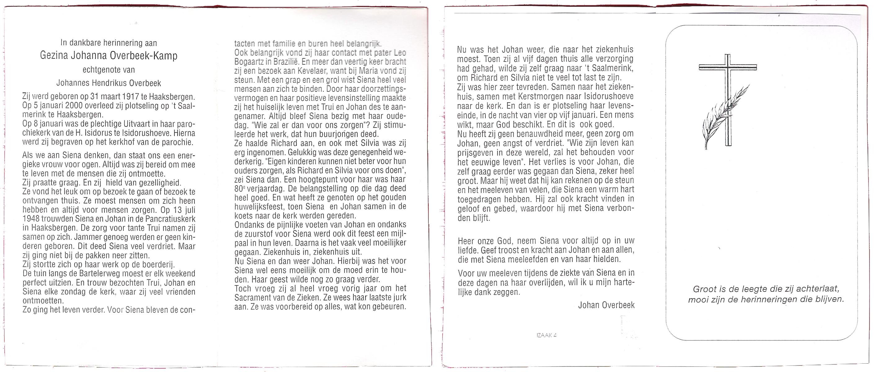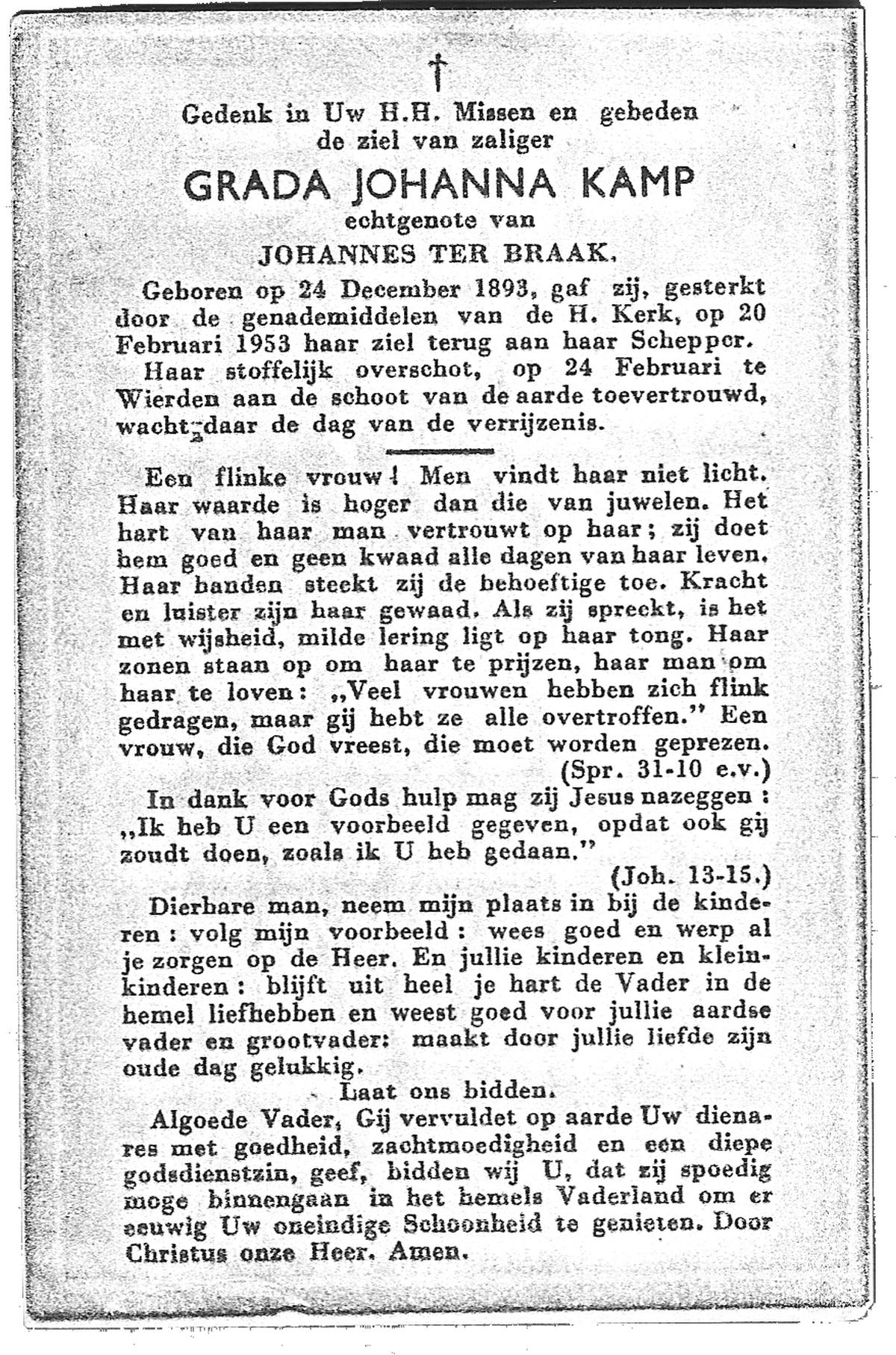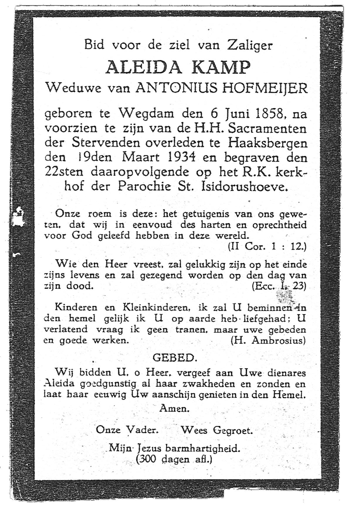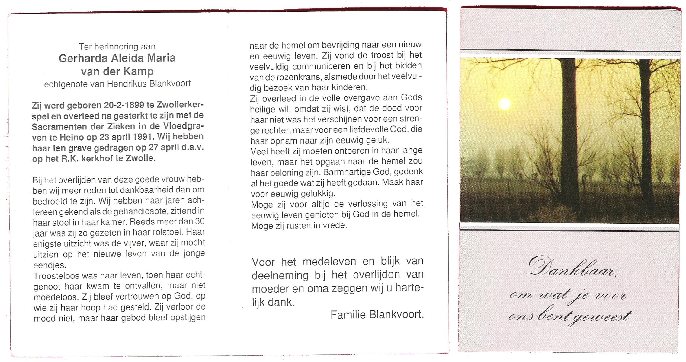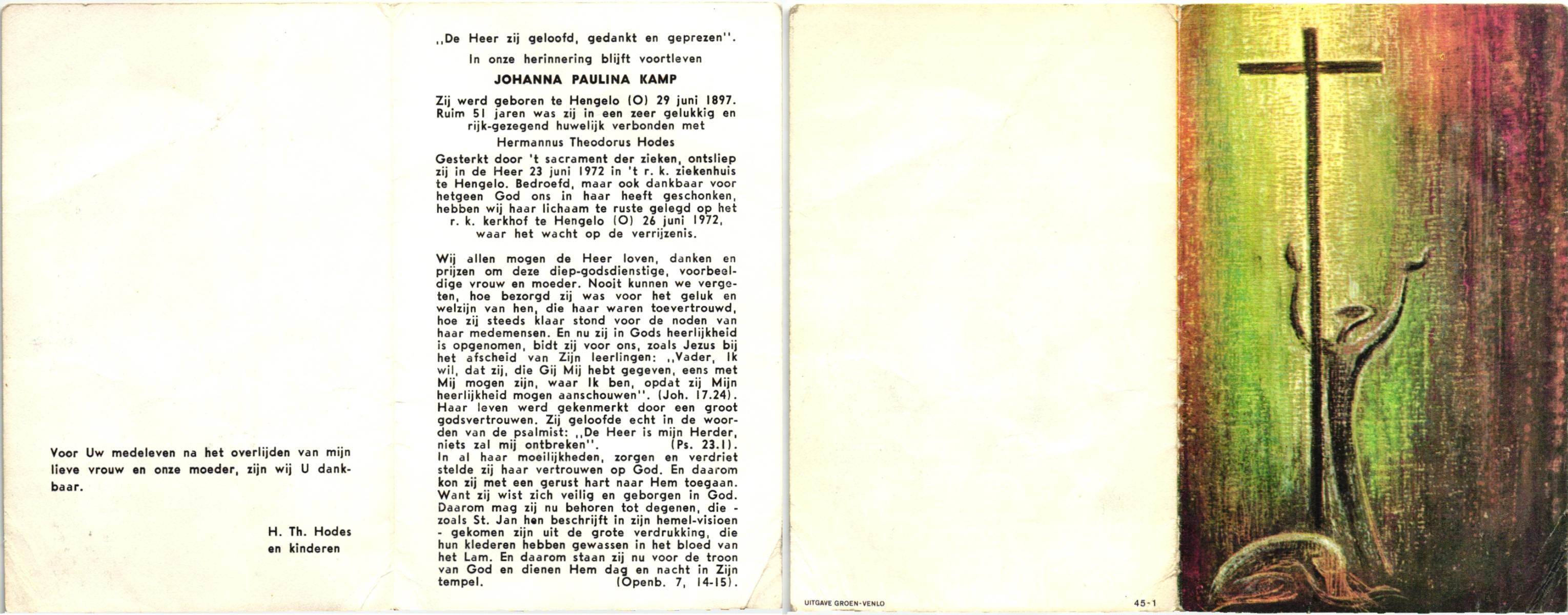 KAMPKUIPER, Gezina Maria, geboren op 23-05-1876 te Almelo, overleden op 5-4-1962 te Mariaparochie op 85-jarige leeftijd, begraven op 9-4-1962 te Mariaparochie.