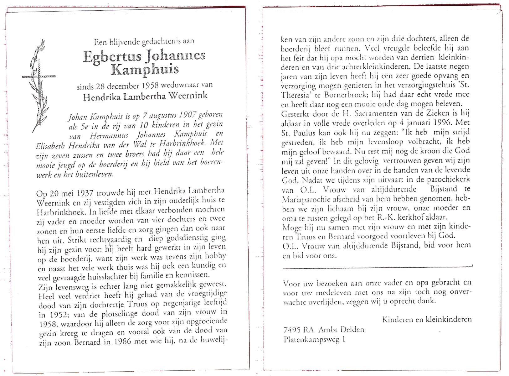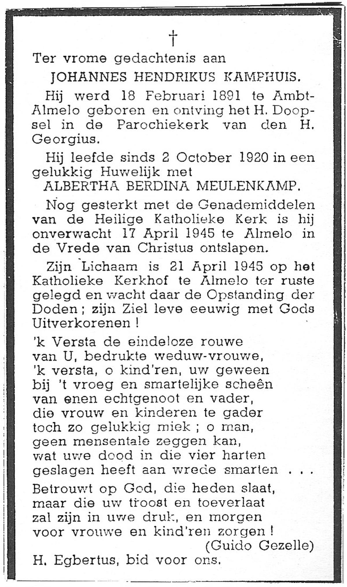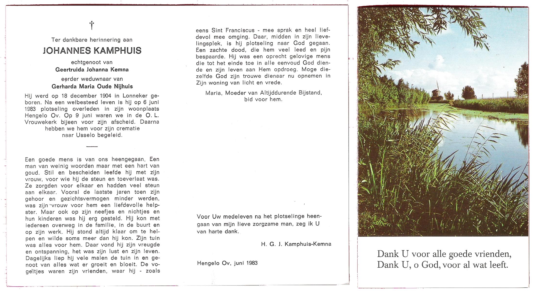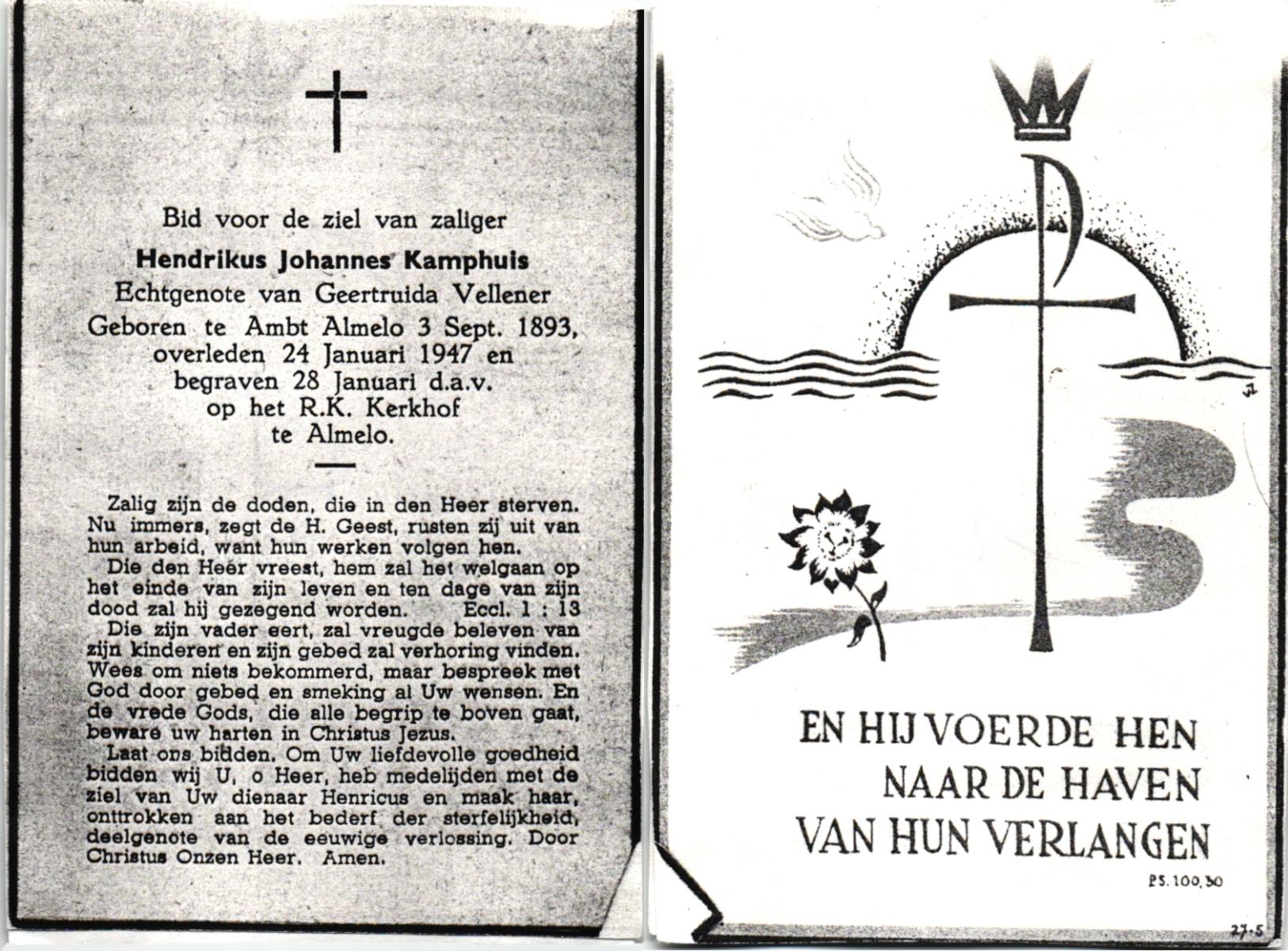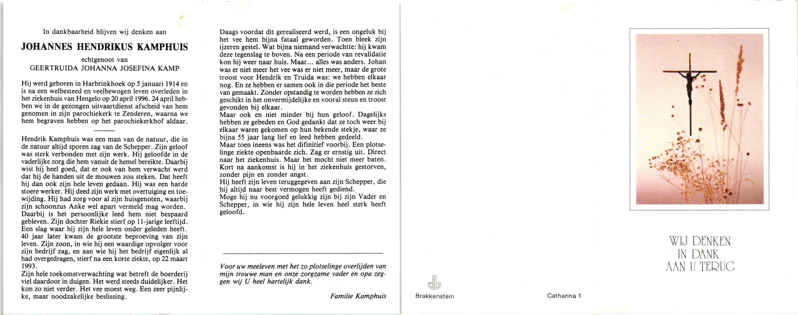 KAMPHUIS, , Johannes Hendrikus, geboren op 5-1-1914 te Harbrinkhoek, overleden op 20-4-1996 te Hengelo (O) op 82-jarige leeftijd, begraven op 24-4-1996 te Zenderen.