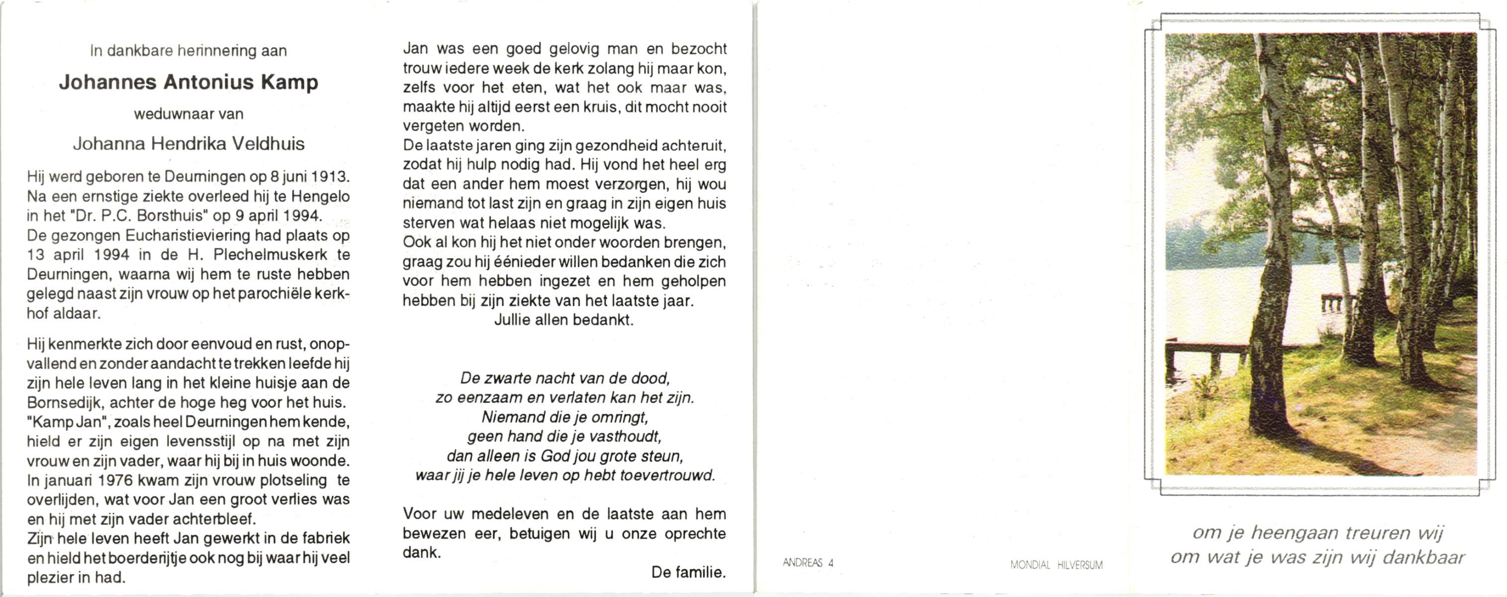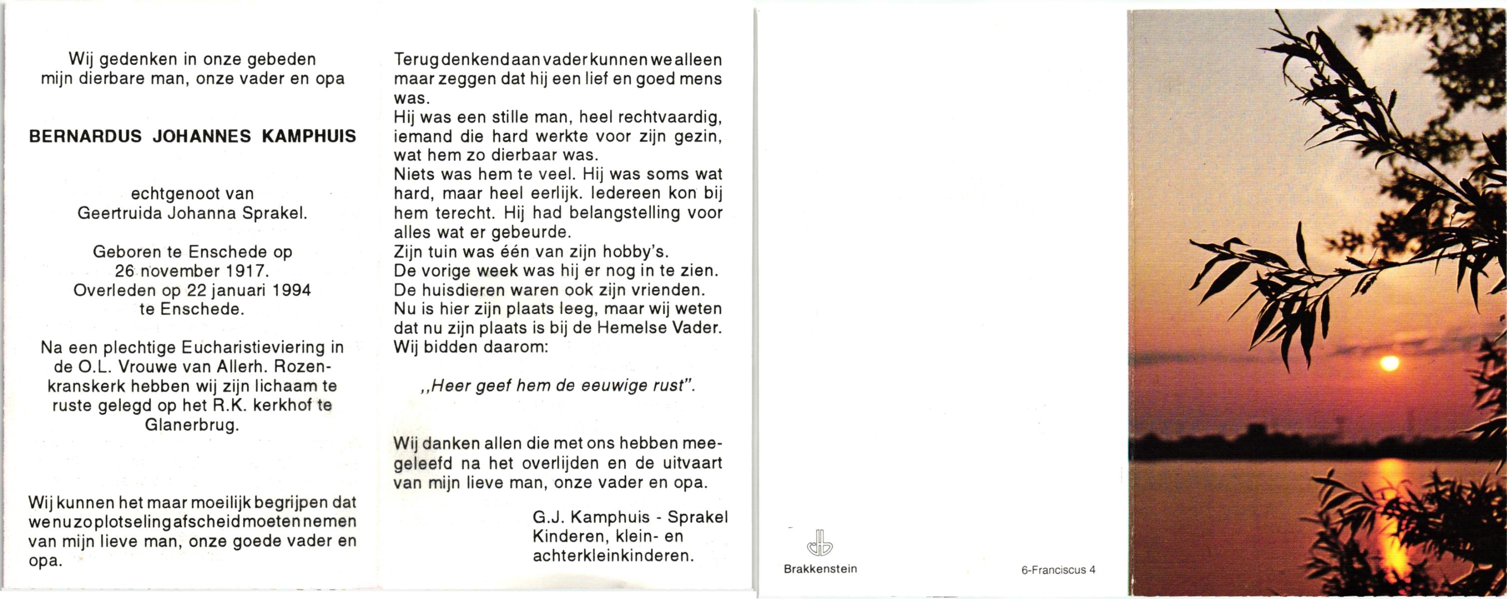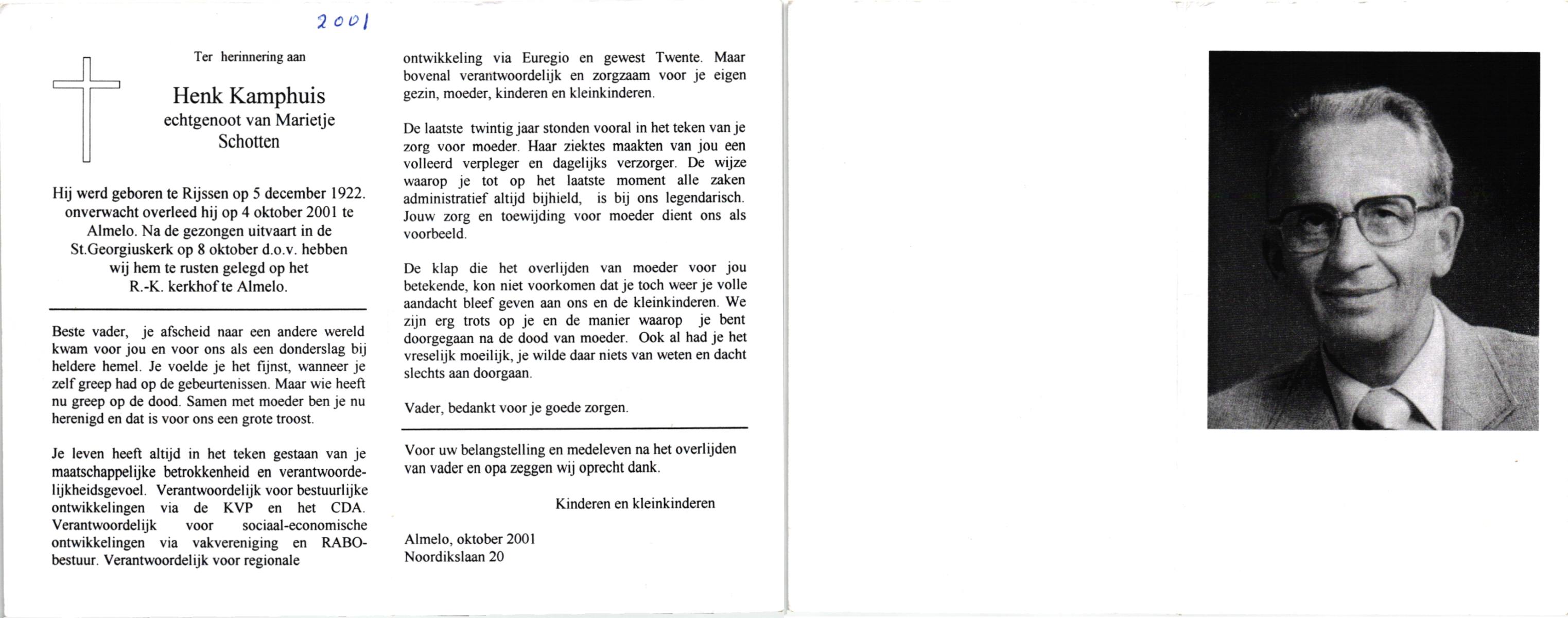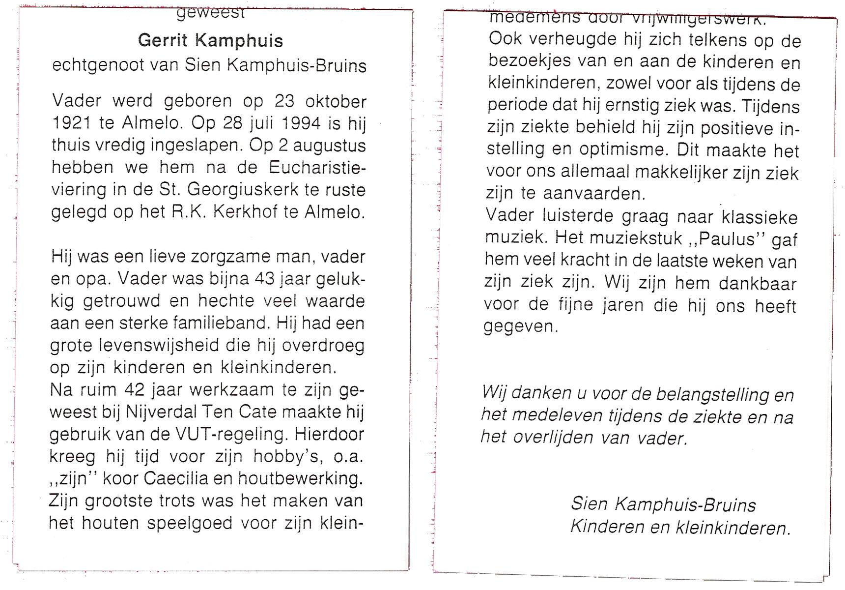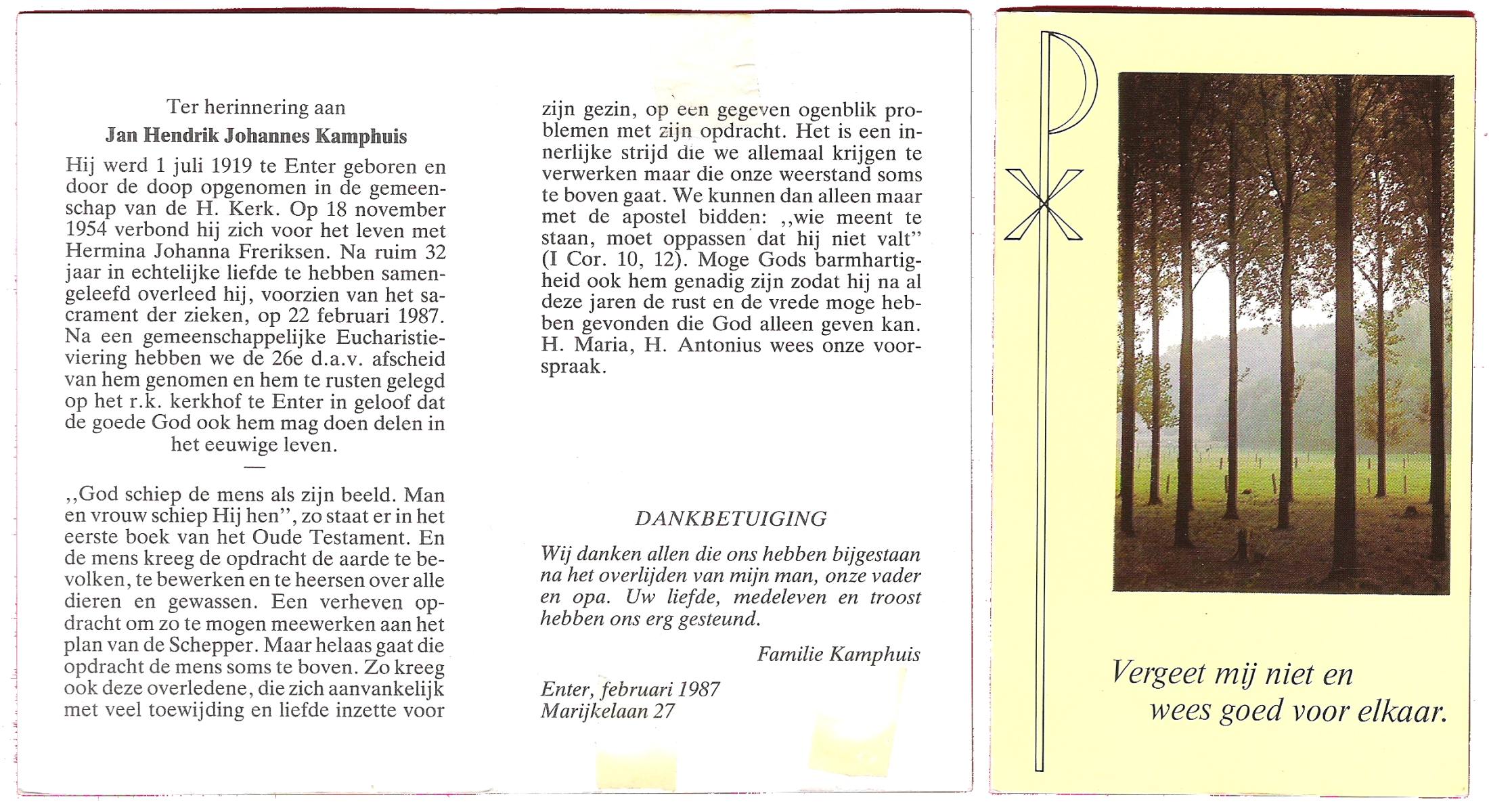 KAMPHUIS, , Johannes Hendrikus, geboren op 5-1-1914 te Harbrinkhoek, overleden op 20-4-1996 te Hengelo (O) op 82-jarige leeftijd, begraven op 24-4-1996 te Zenderen.