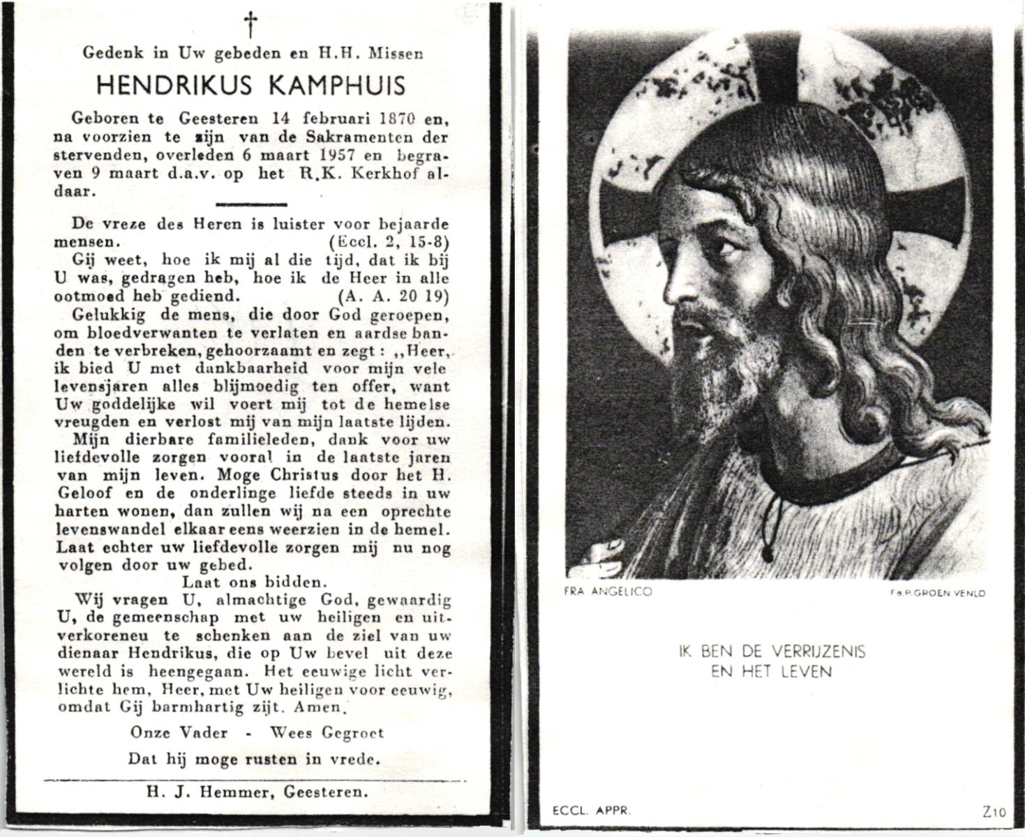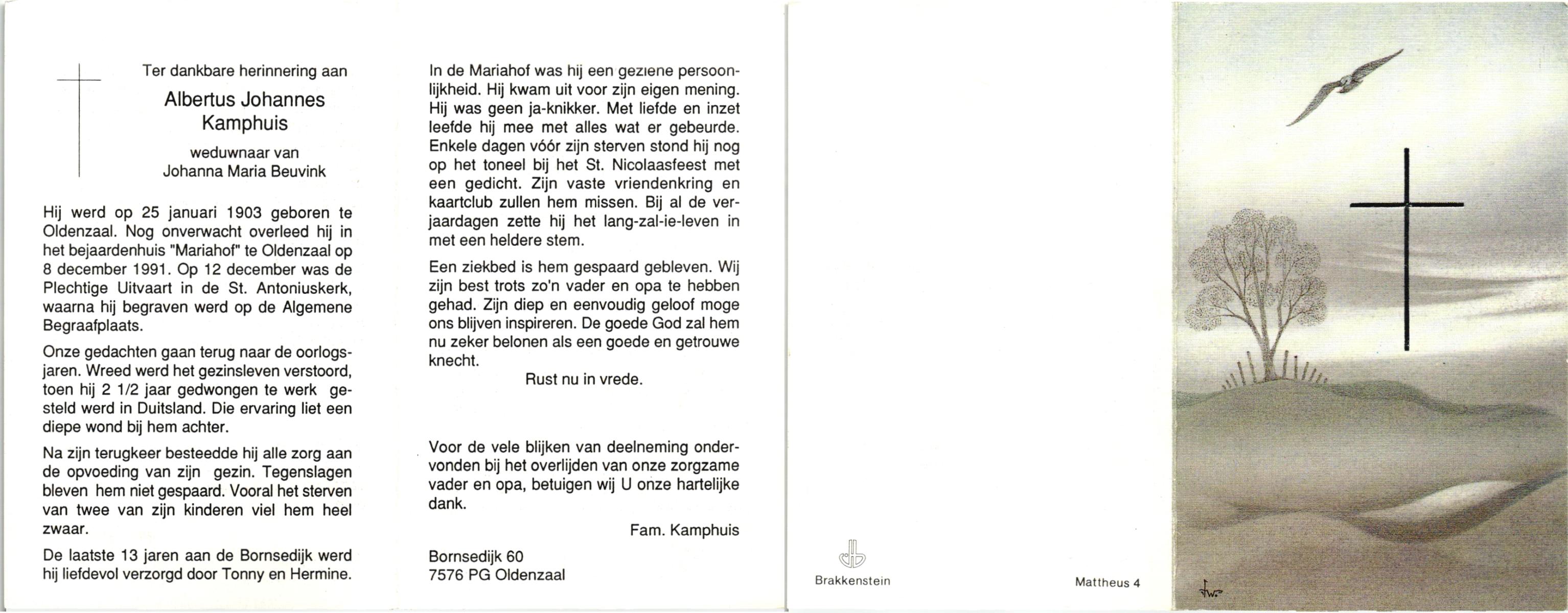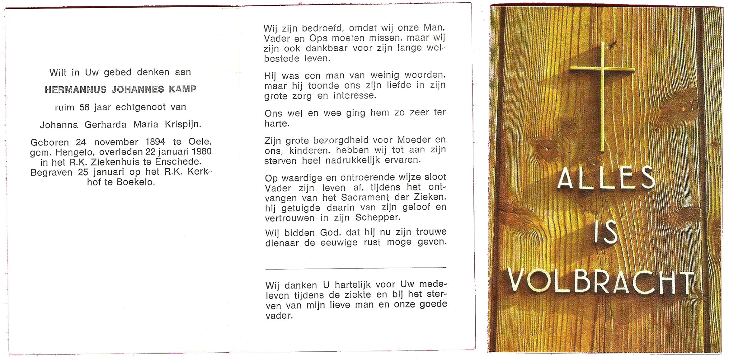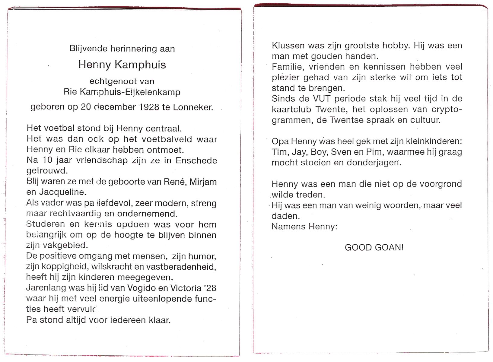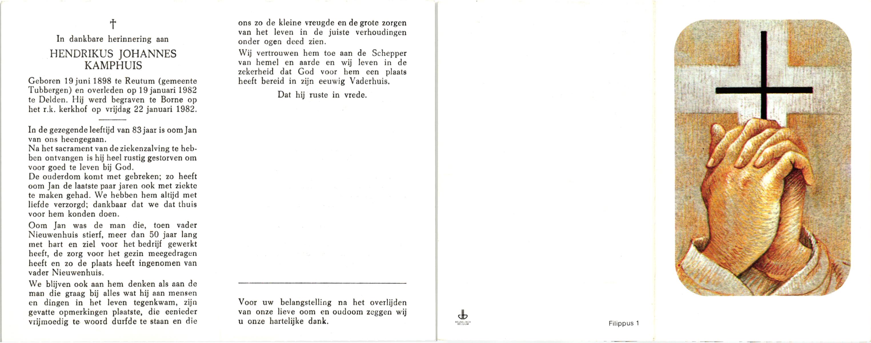 KAMPHUIS, , Johannes Hendrikus, geboren op 5-1-1914 te Harbrinkhoek, overleden op 20-4-1996 te Hengelo (O) op 82-jarige leeftijd, begraven op 24-4-1996 te Zenderen.