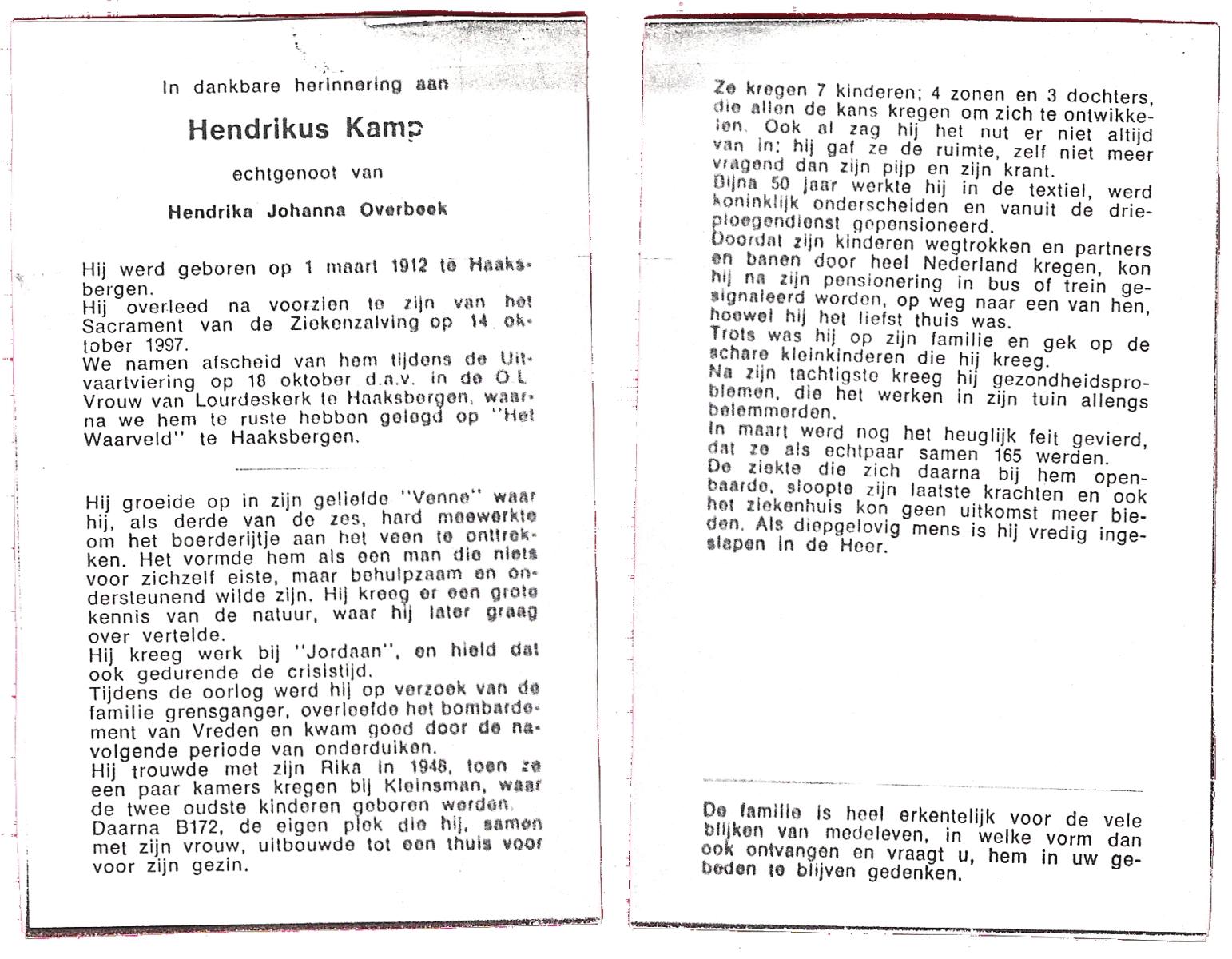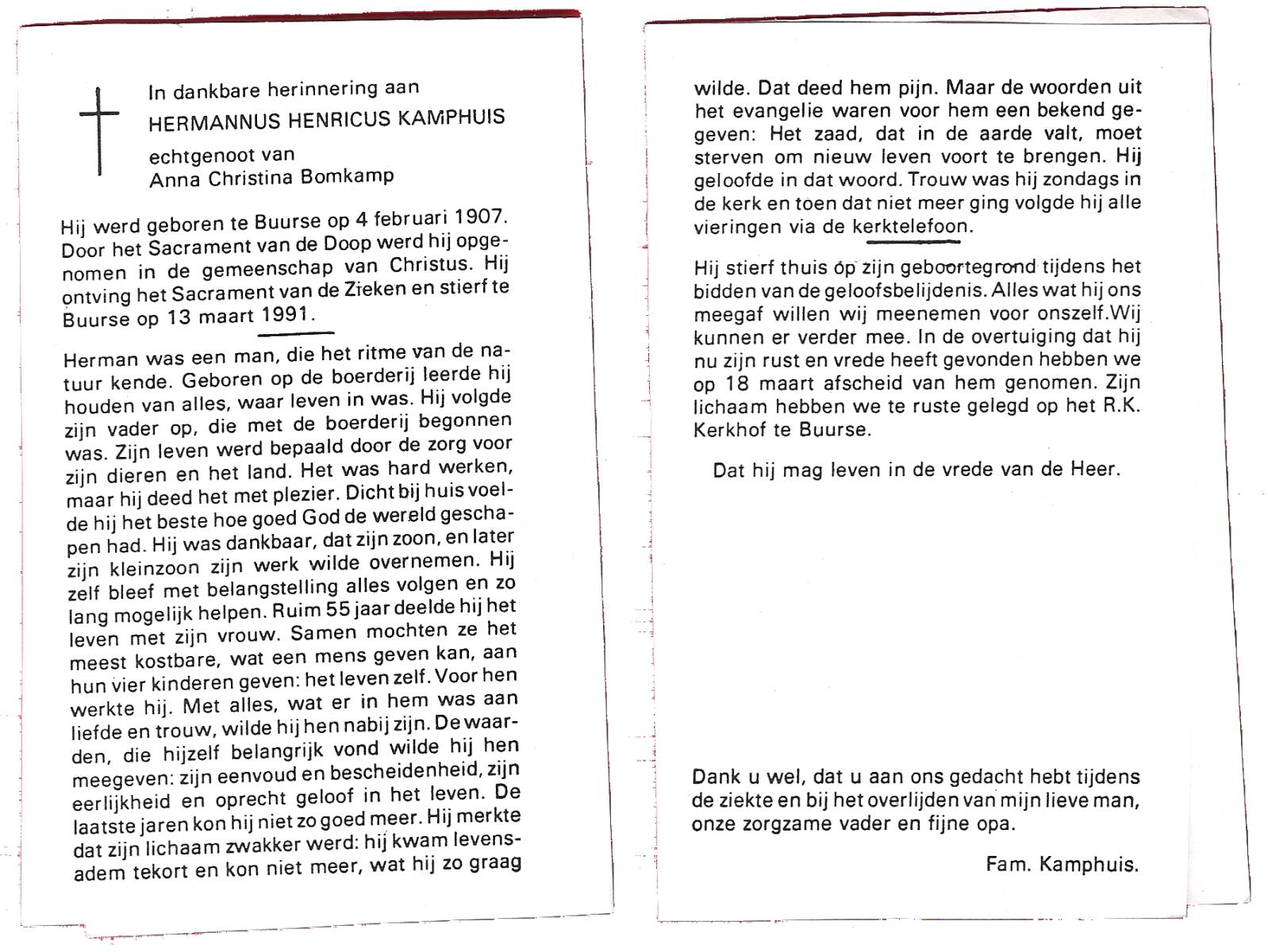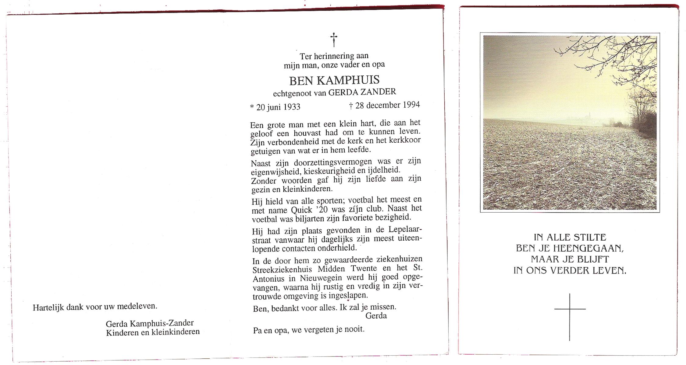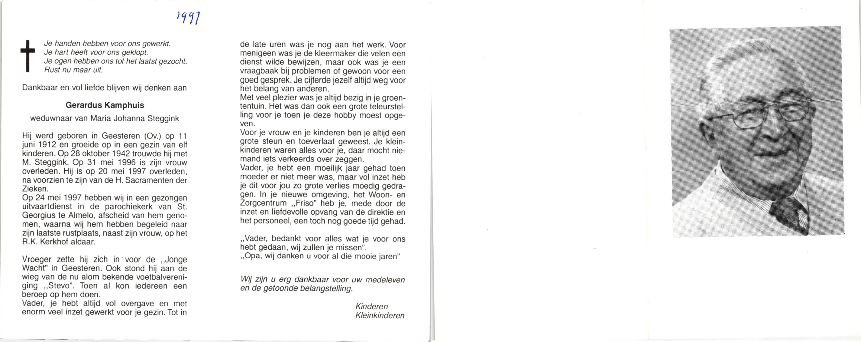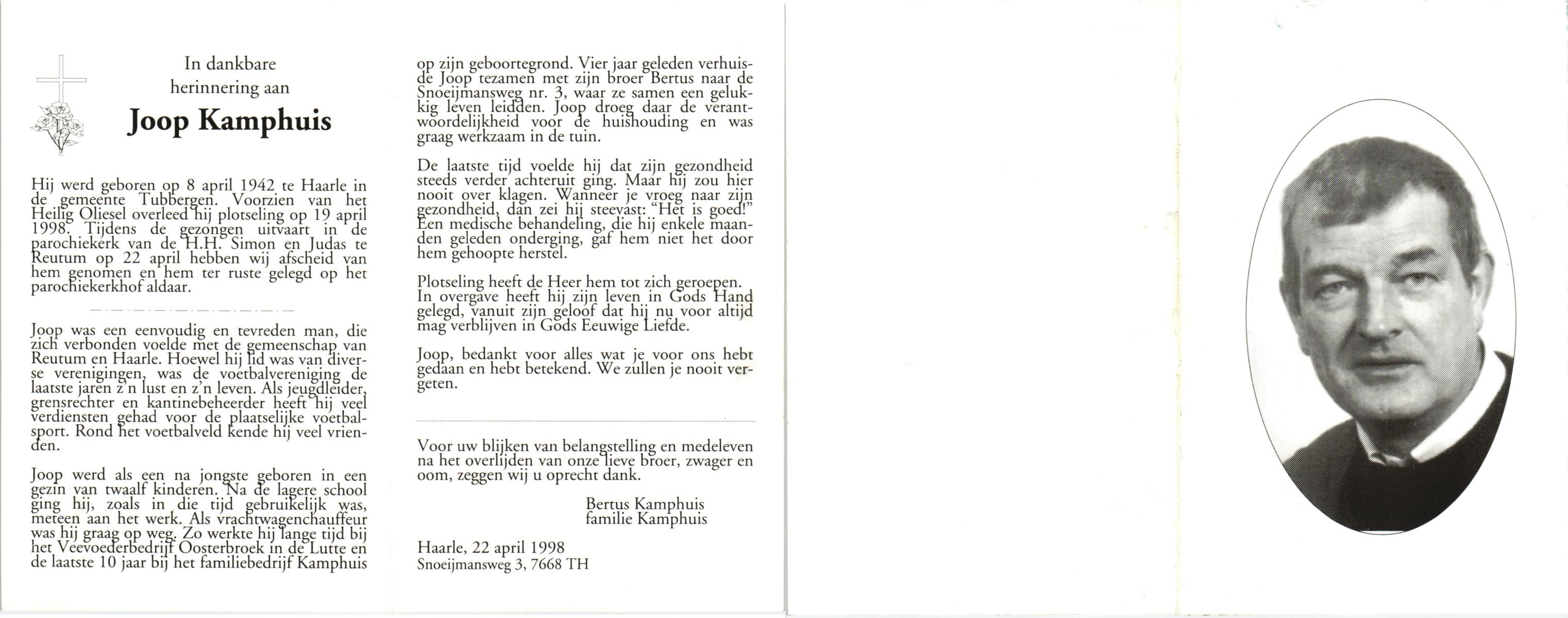 KAMPHUIS, , Johannes Hendrikus, geboren op 5-1-1914 te Harbrinkhoek, overleden op 20-4-1996 te Hengelo (O) op 82-jarige leeftijd, begraven op 24-4-1996 te Zenderen.
