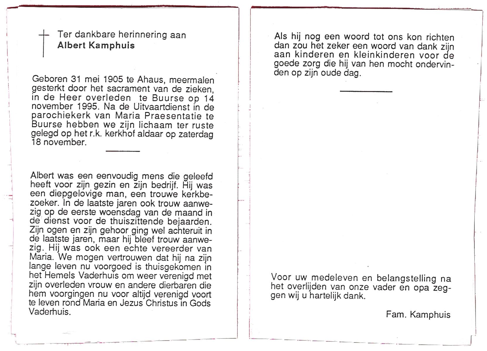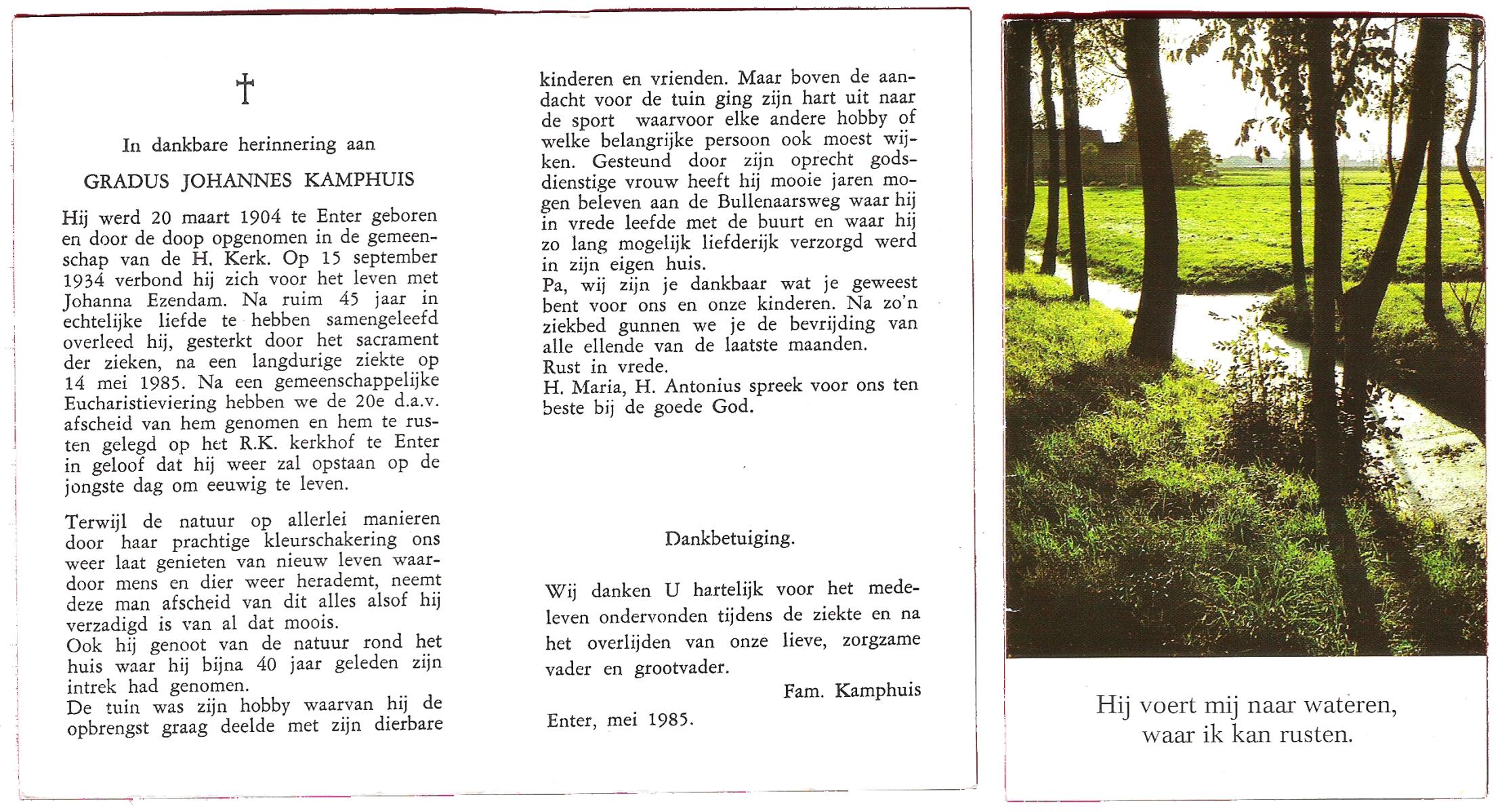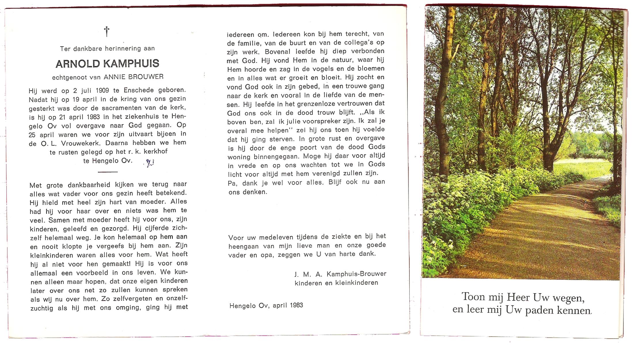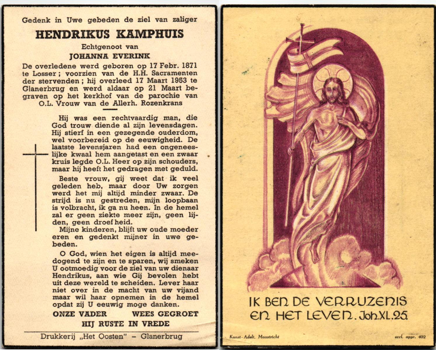 KAMPHUIS, , Johannes Hendrikus, geboren op 5-1-1914 te Harbrinkhoek, overleden op 20-4-1996 te Hengelo (O) op 82-jarige leeftijd, begraven op 24-4-1996 te Zenderen.