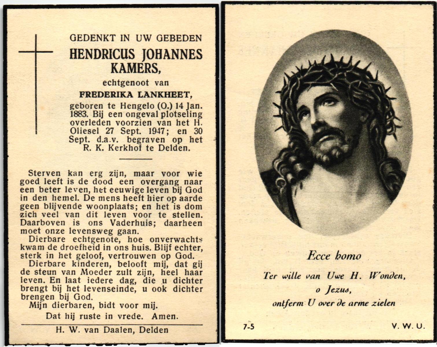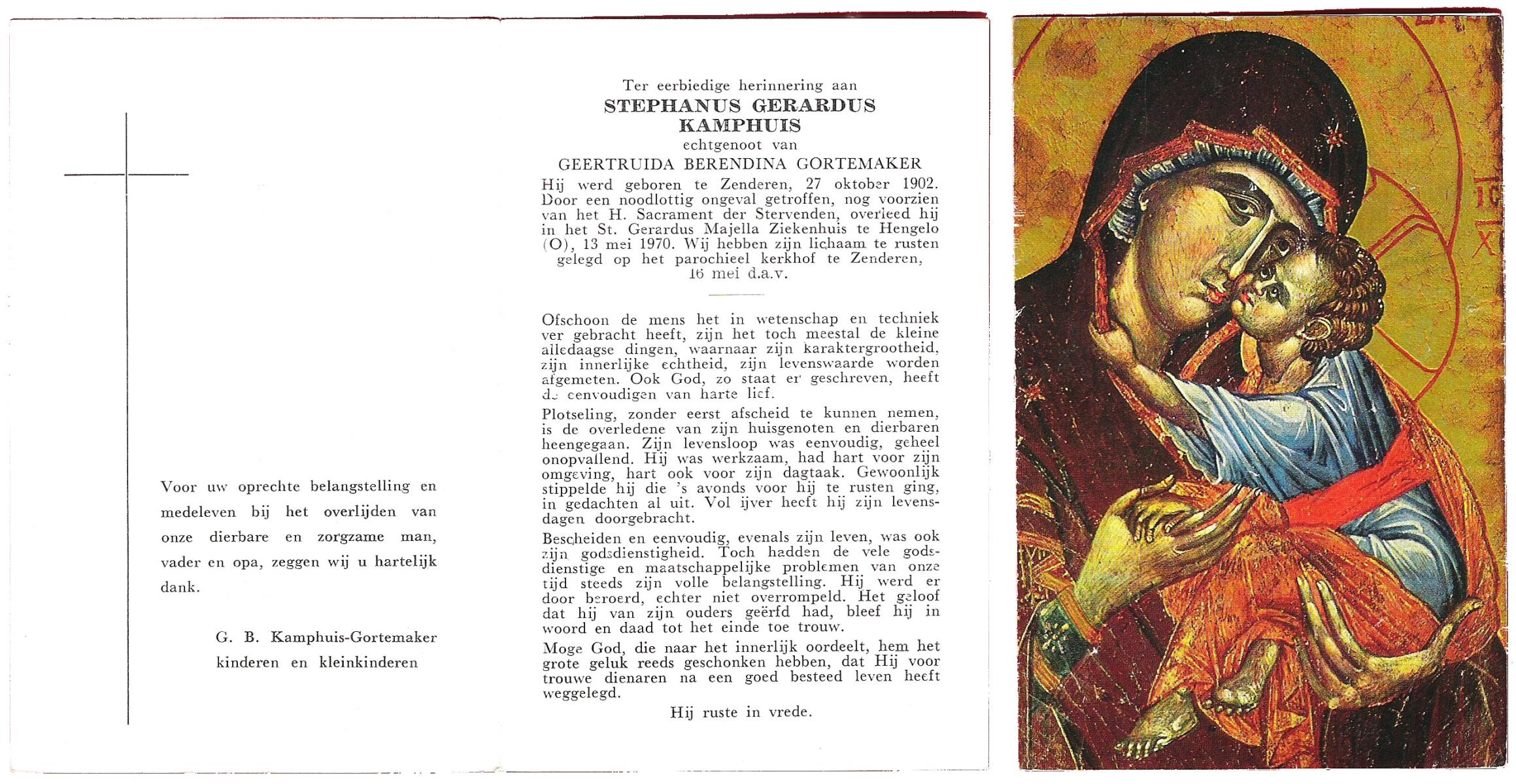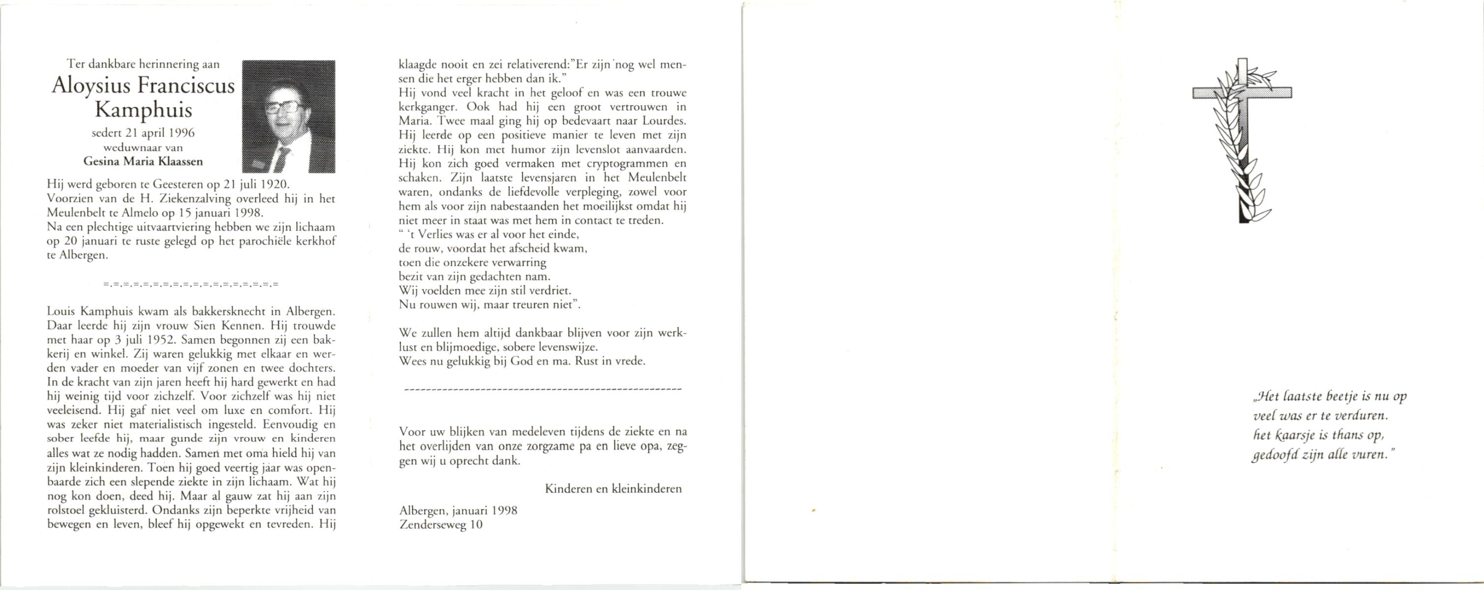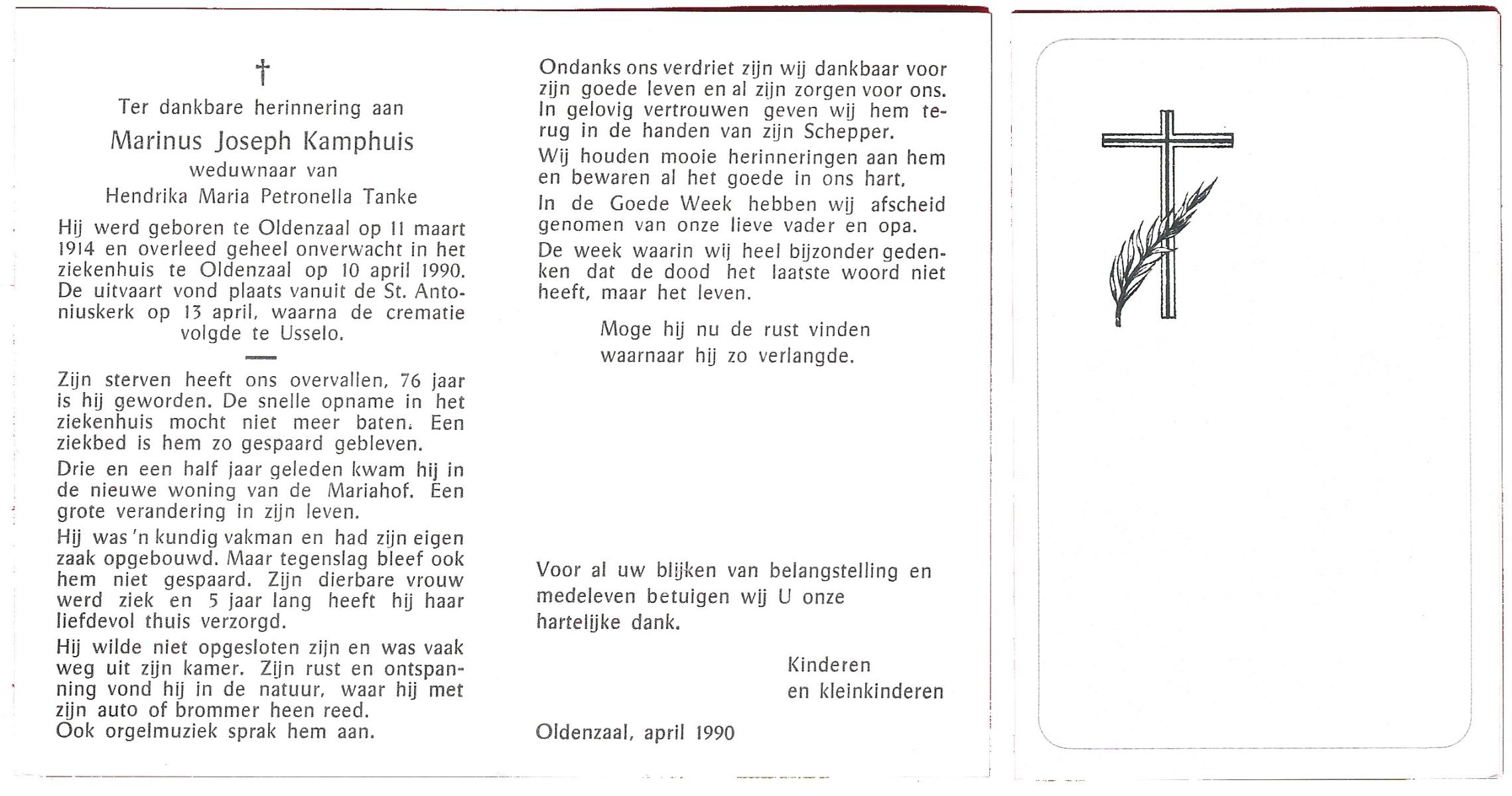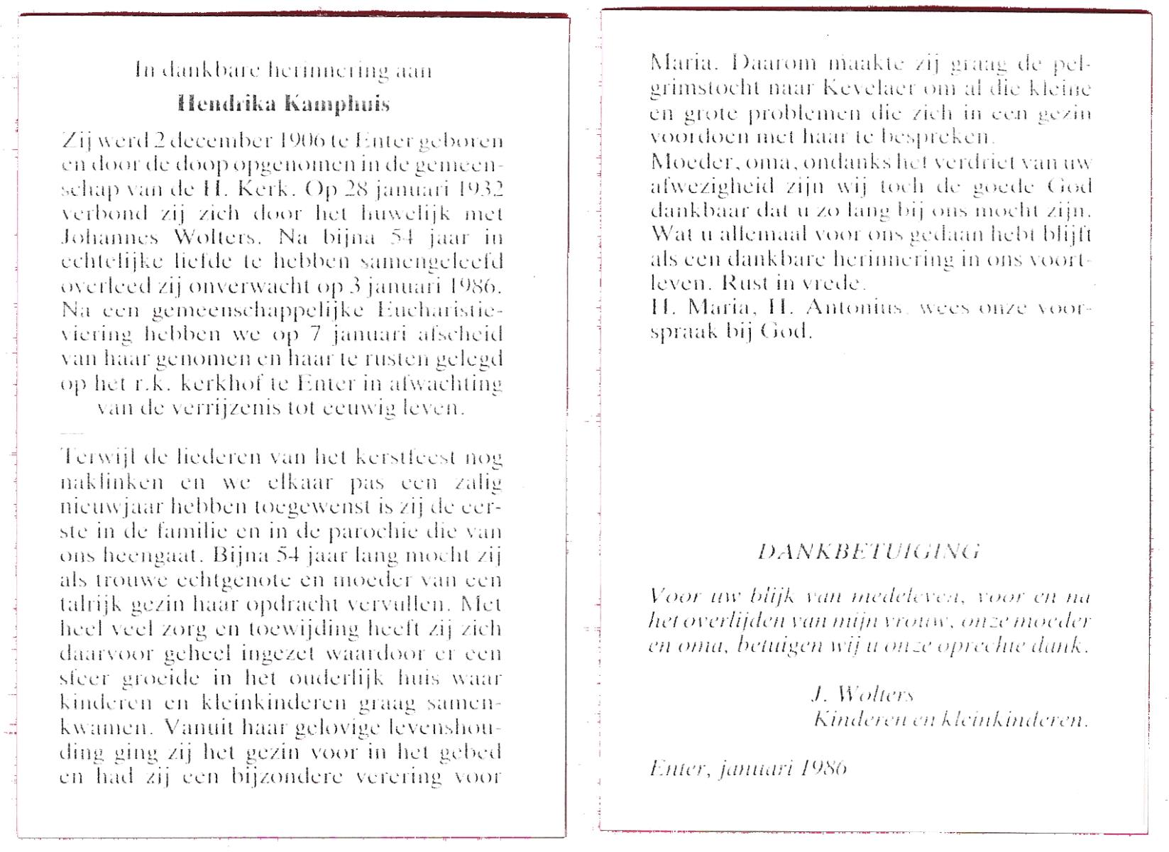 KAMPHUIS, , Johannes Hendrikus, geboren op 5-1-1914 te Harbrinkhoek, overleden op 20-4-1996 te Hengelo (O) op 82-jarige leeftijd, begraven op 24-4-1996 te Zenderen.
