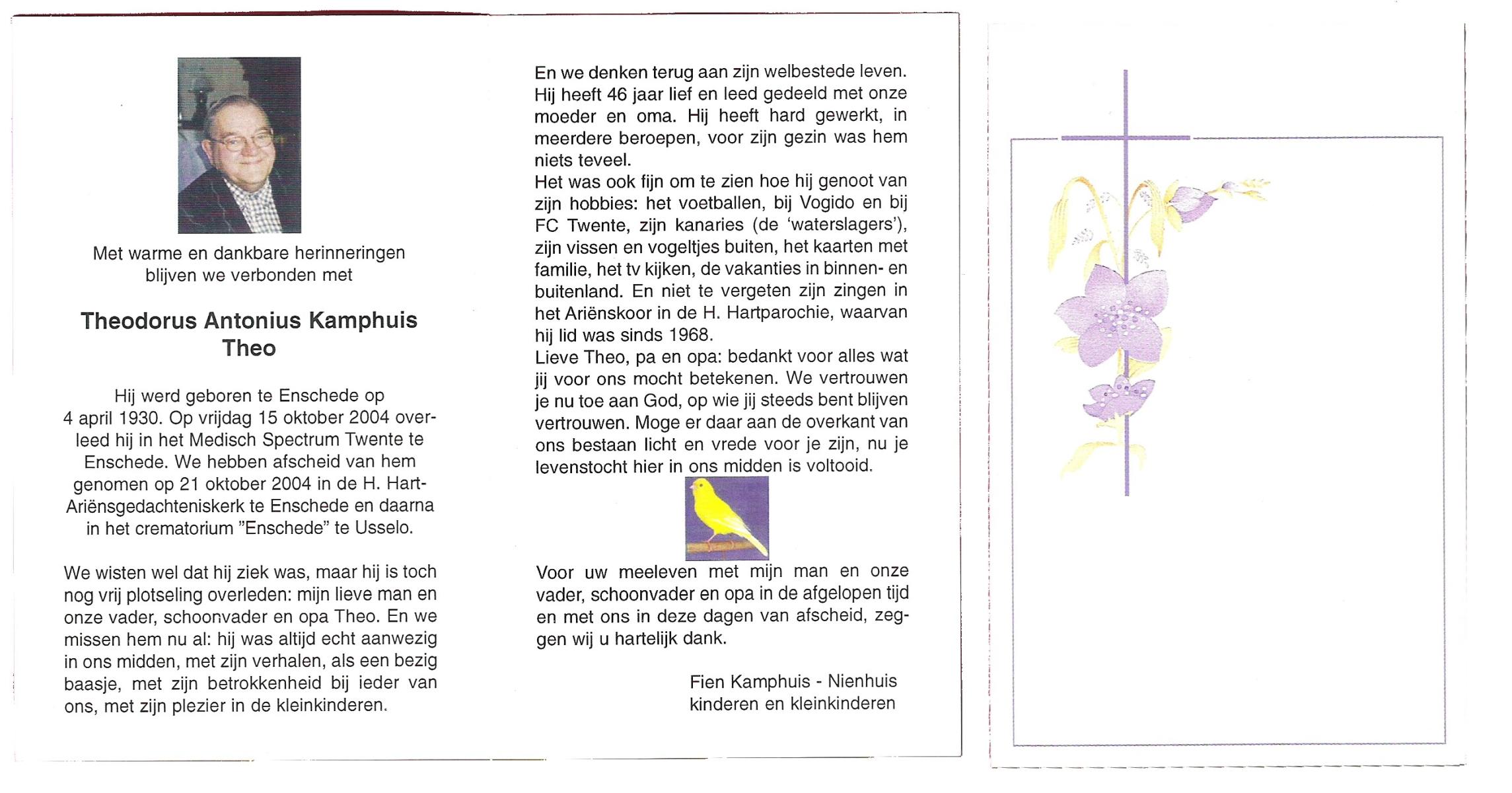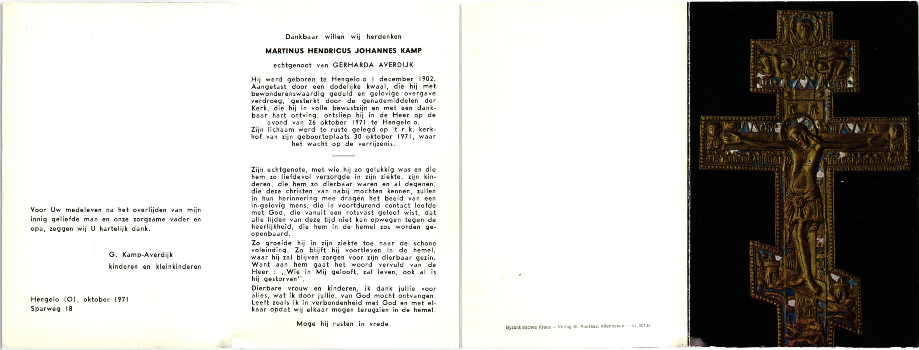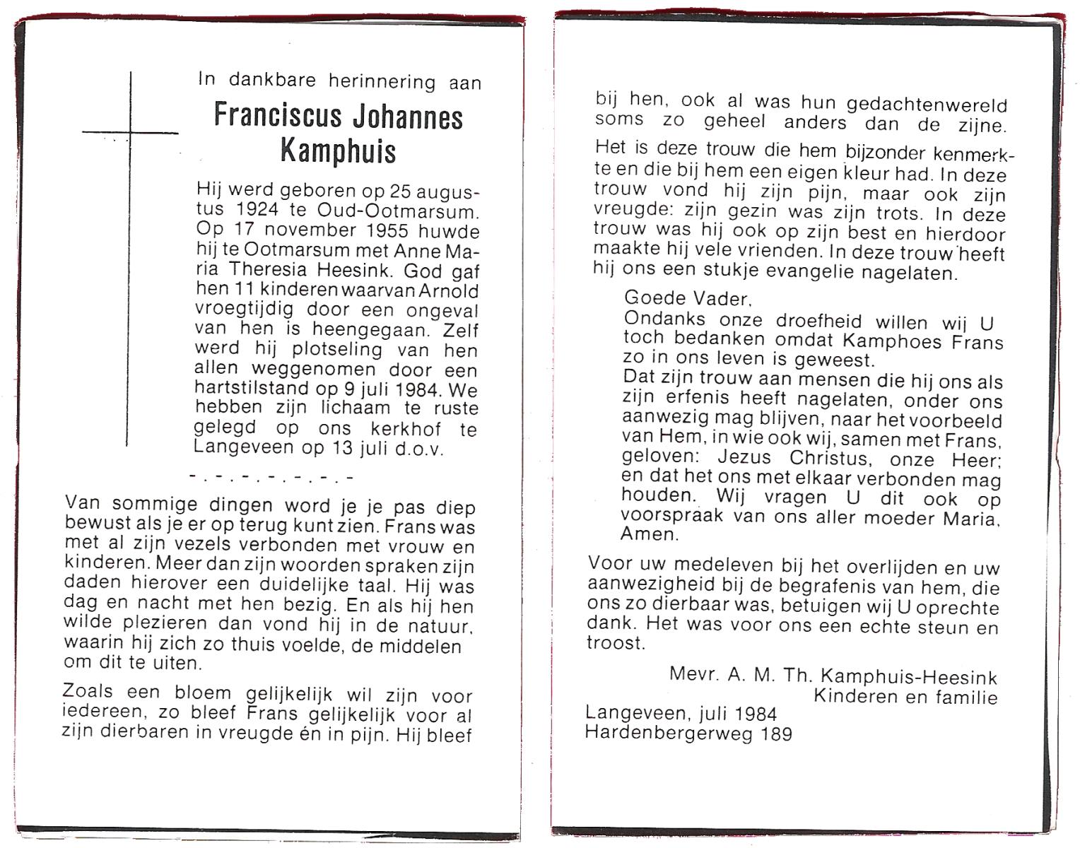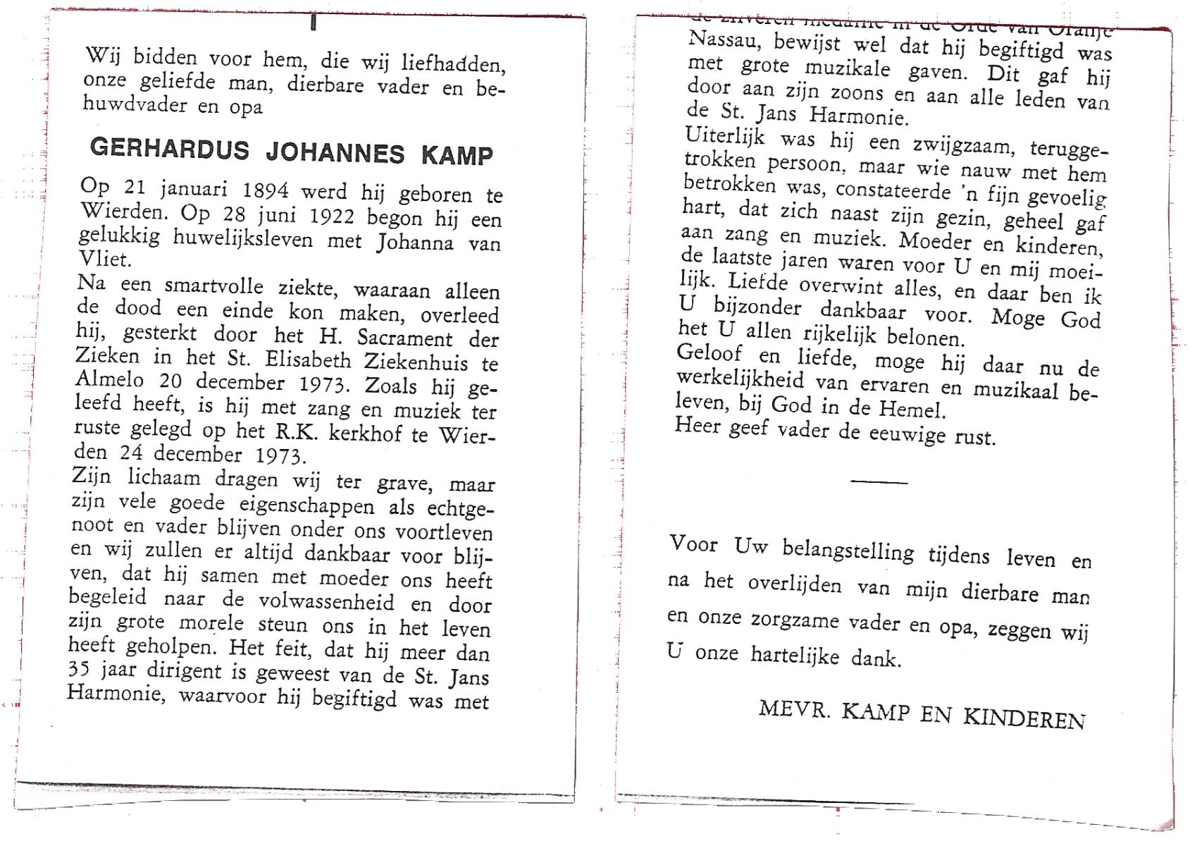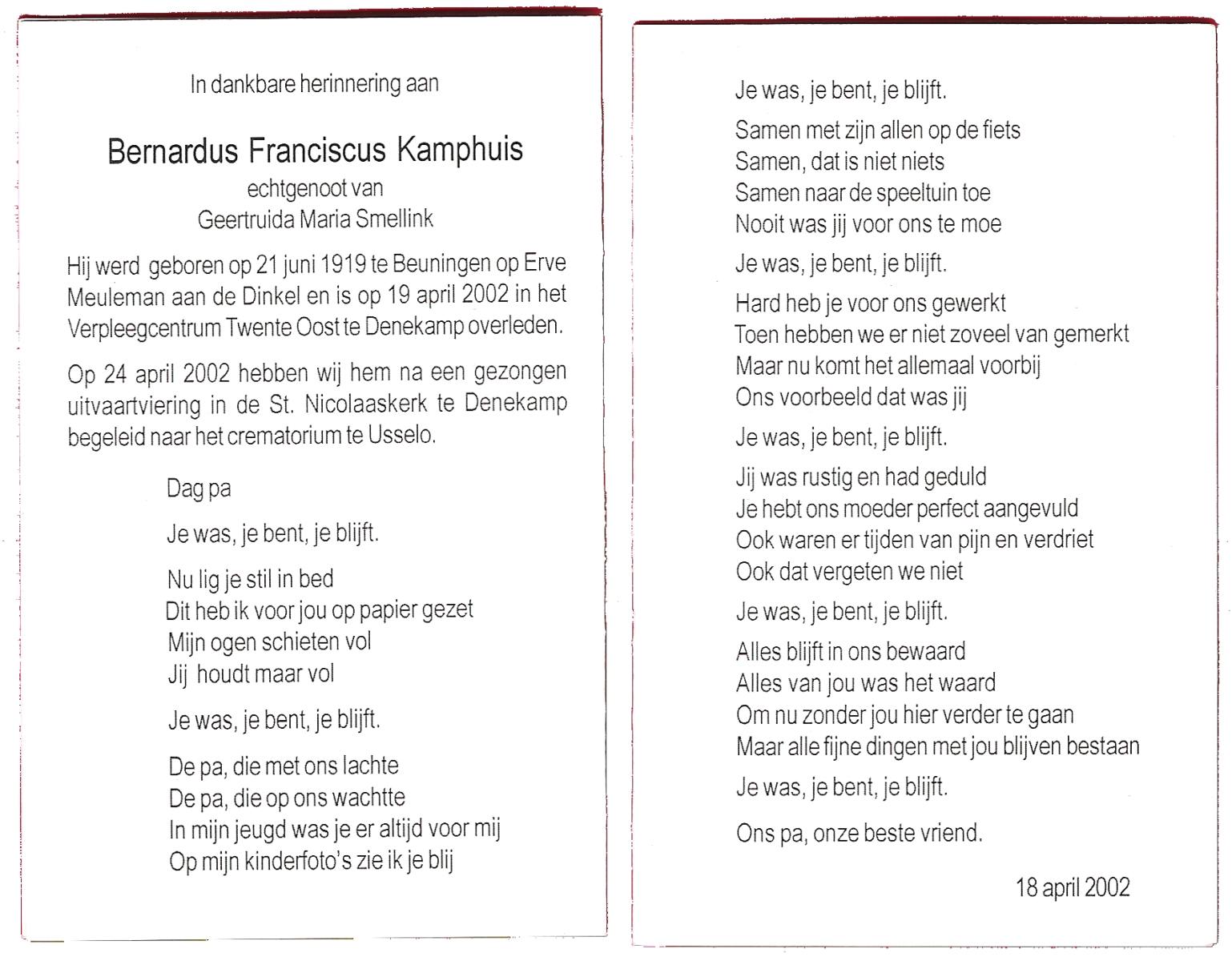 KAMPHUIS, , Johannes Hendrikus, geboren op 5-1-1914 te Harbrinkhoek, overleden op 20-4-1996 te Hengelo (O) op 82-jarige leeftijd, begraven op 24-4-1996 te Zenderen.