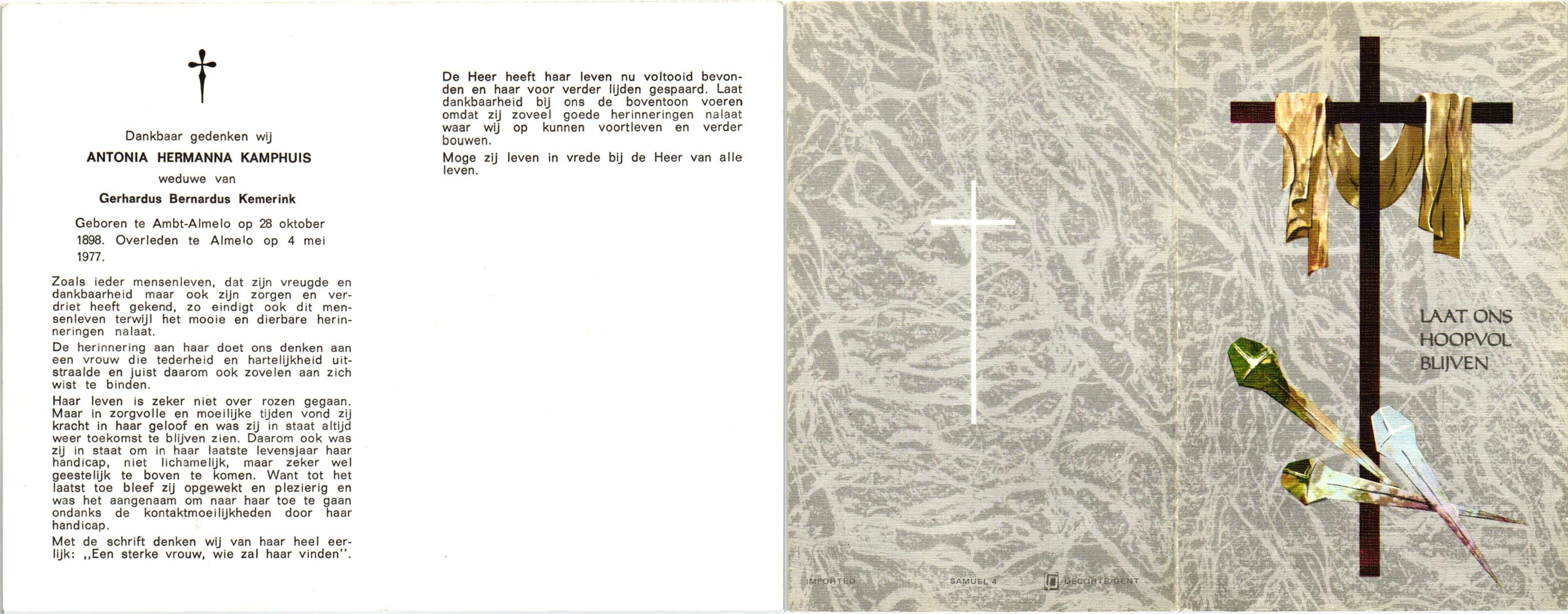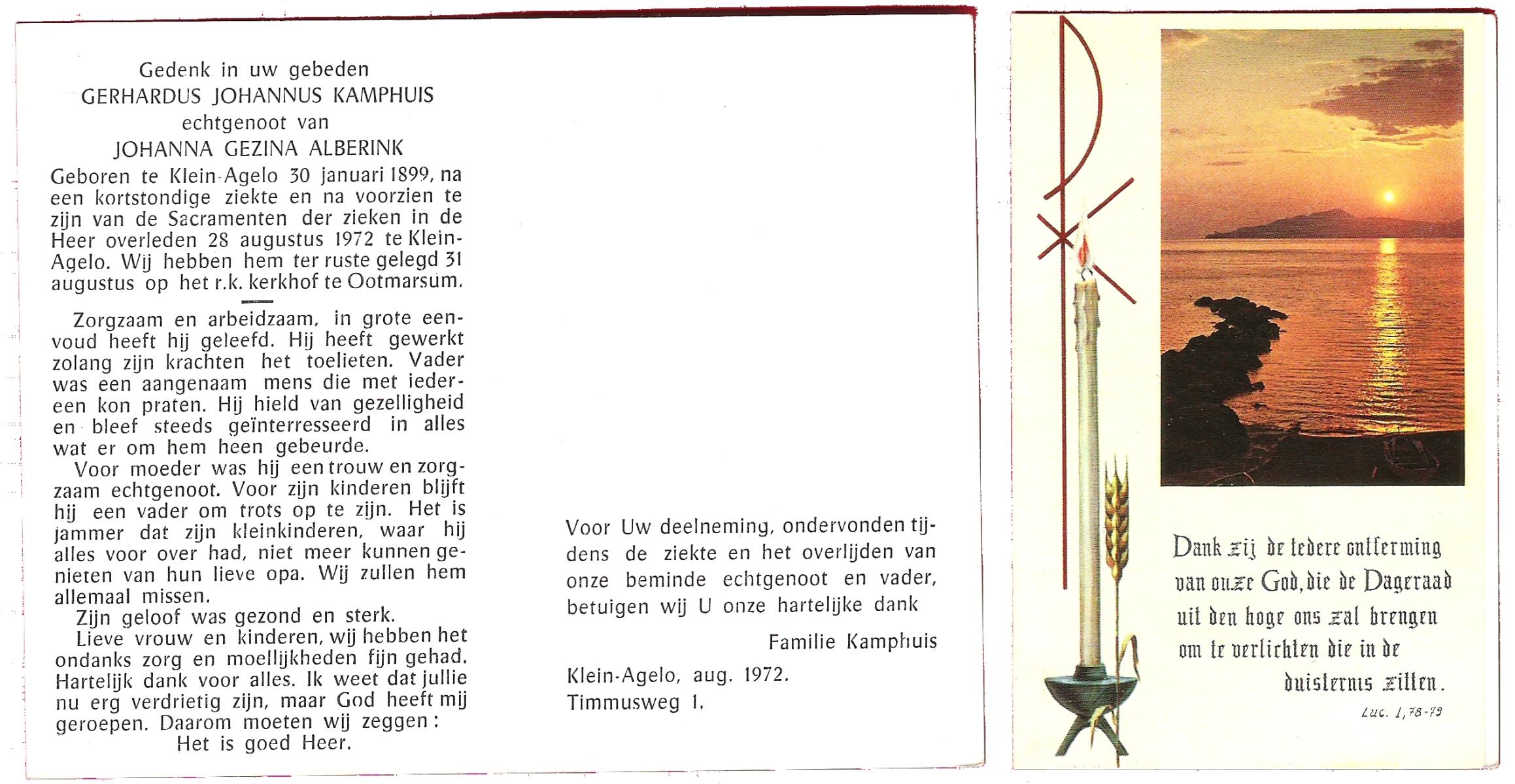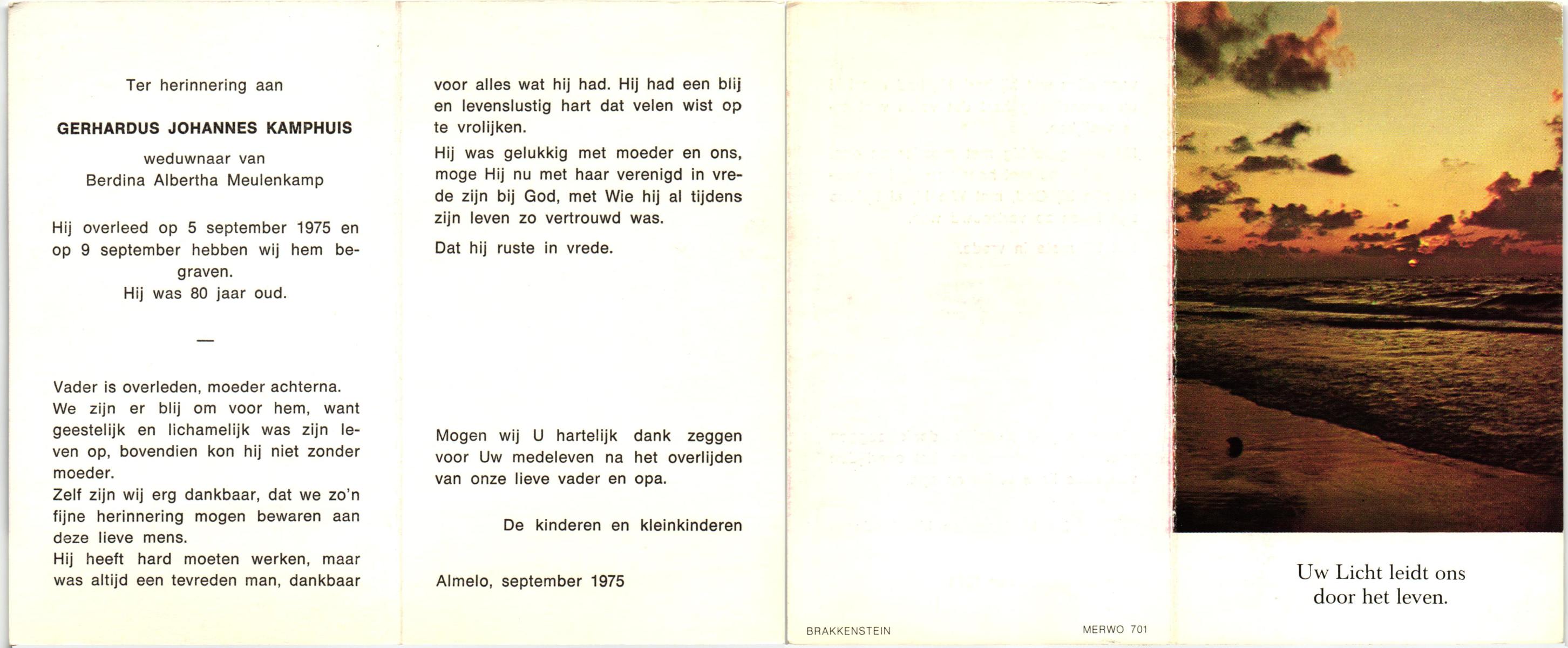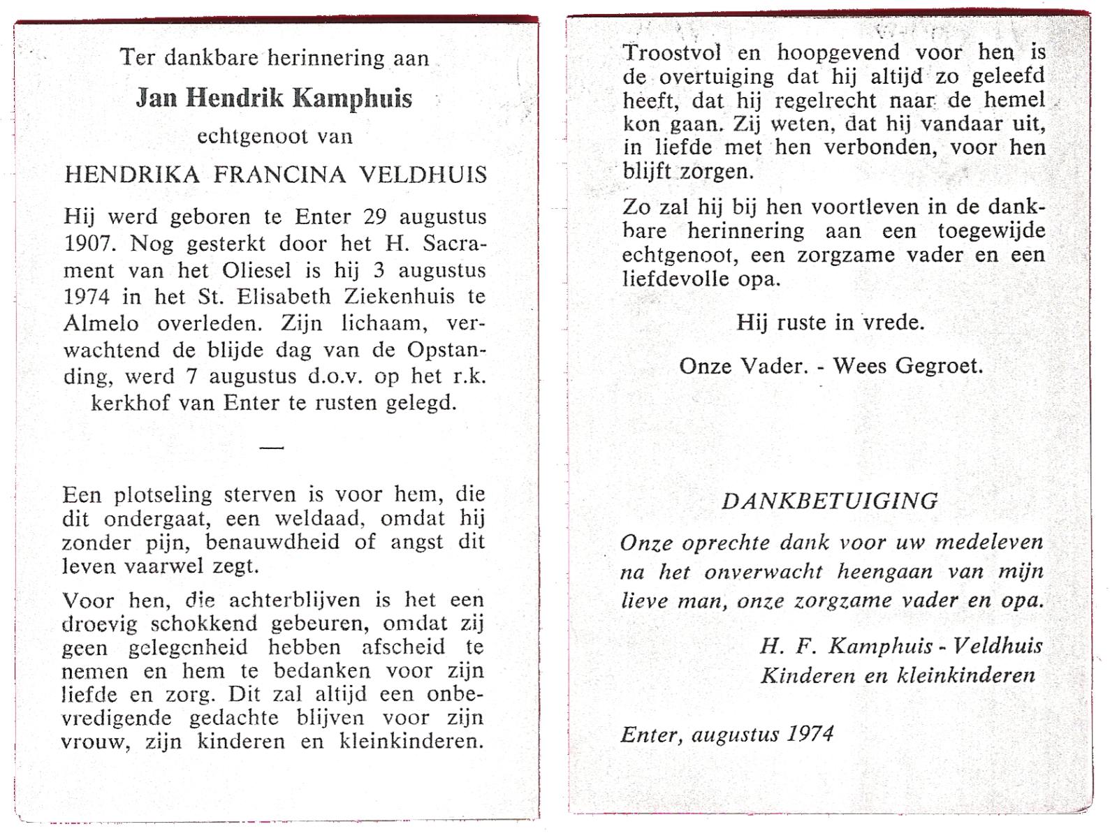 KAMPHUIS, , J.A., geboren op 14-11-1897 te Almelo, overleden op 17-9-1974 te Denekamp op 76-jarige leeftijd, begraven op 21-9-1974 te Denekamp.