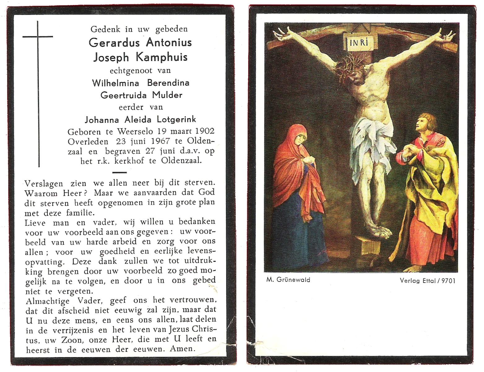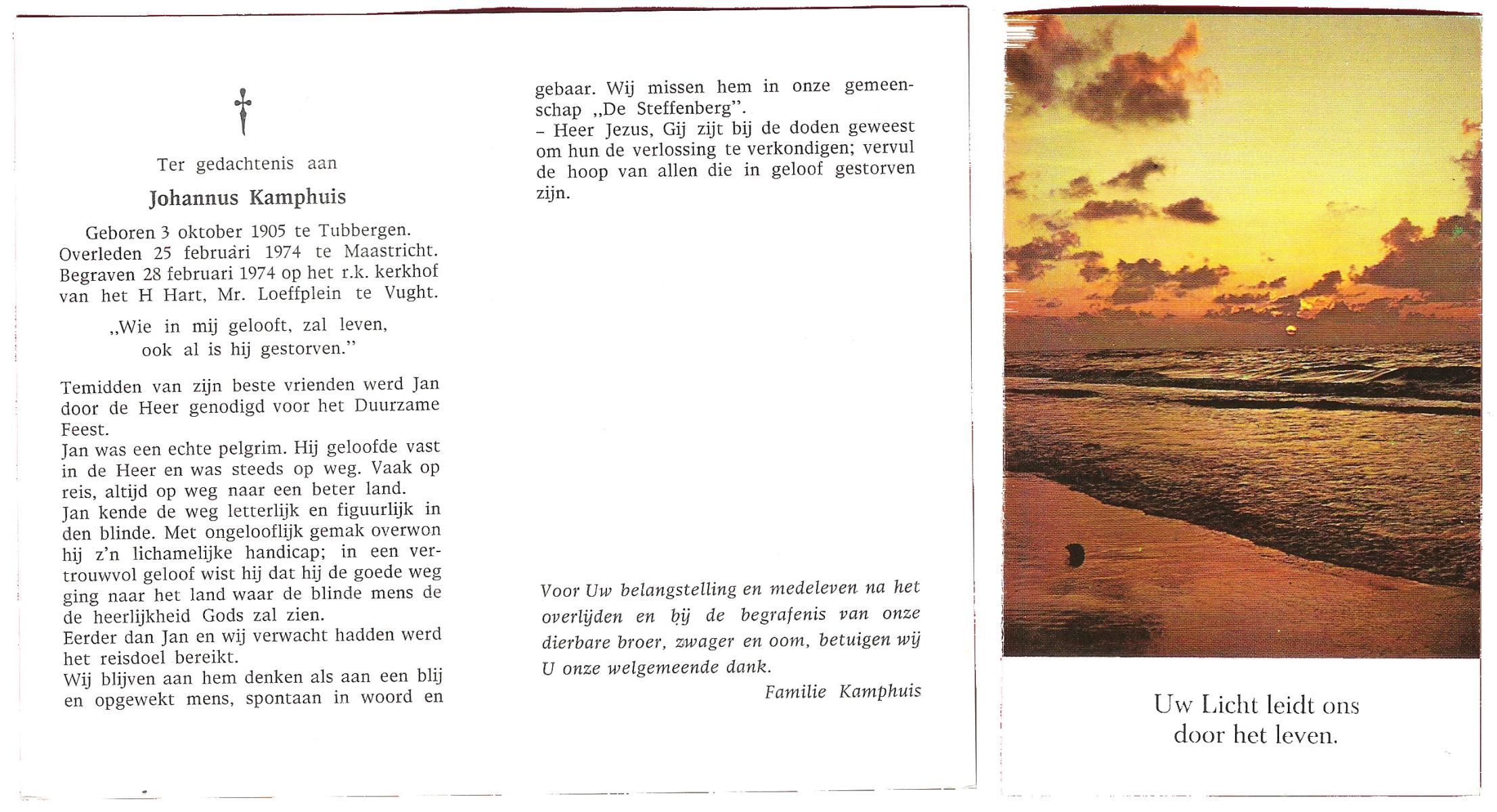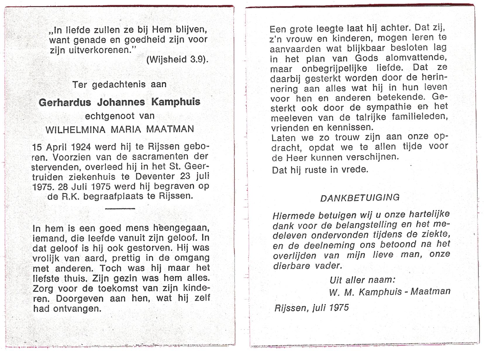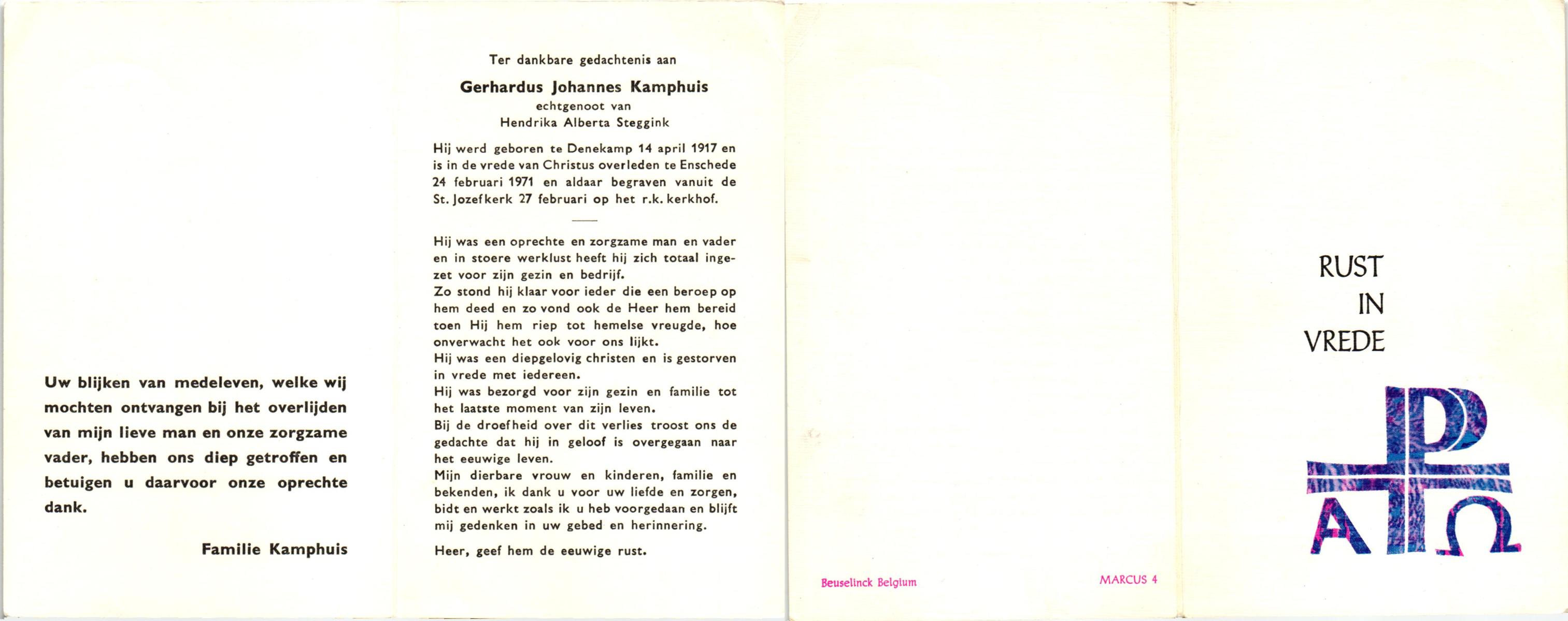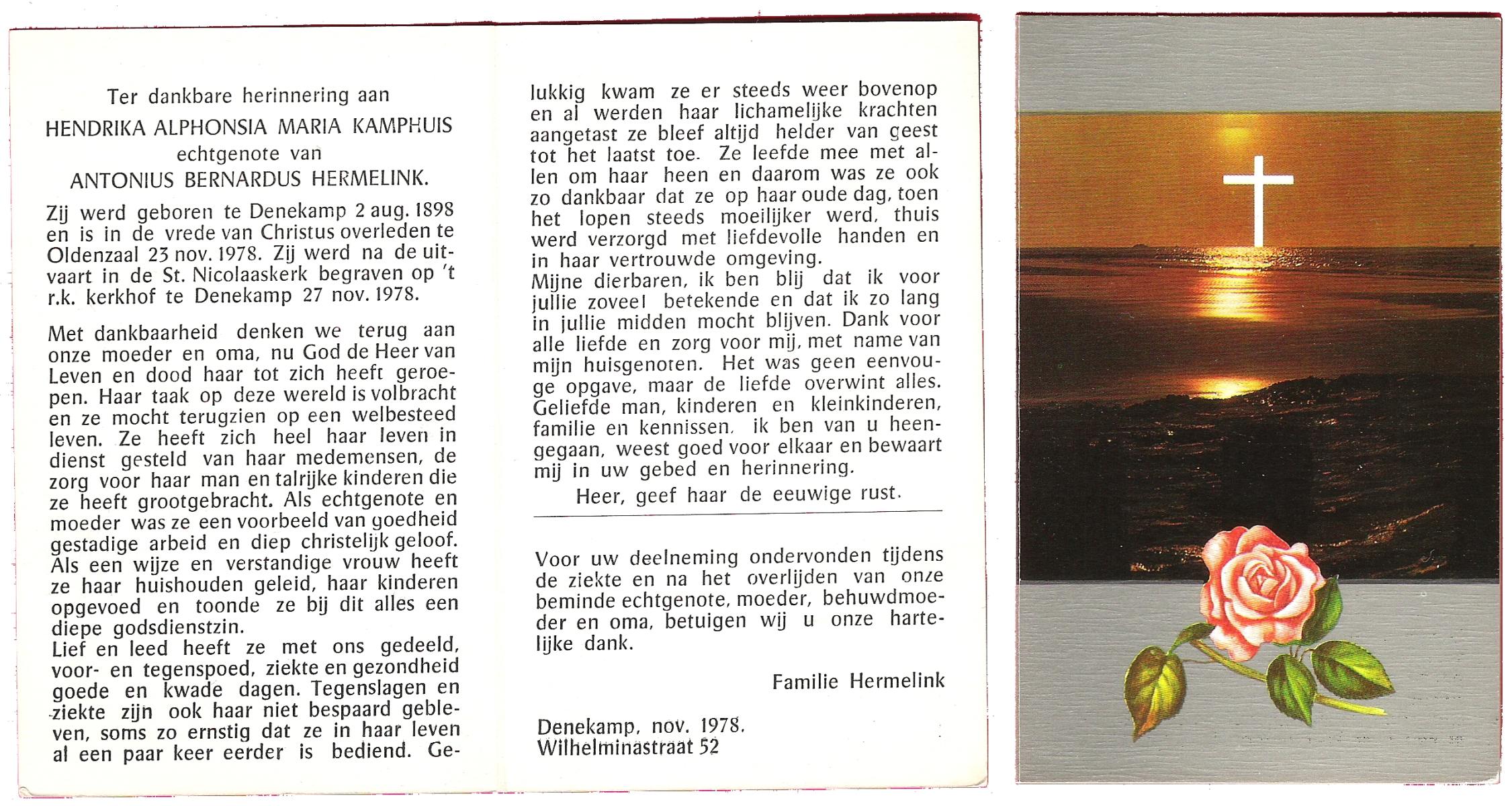 KAMPHUIS, , J.A., geboren op 14-11-1897 te Almelo, overleden op 17-9-1974 te Denekamp op 76-jarige leeftijd, begraven op 21-9-1974 te Denekamp.