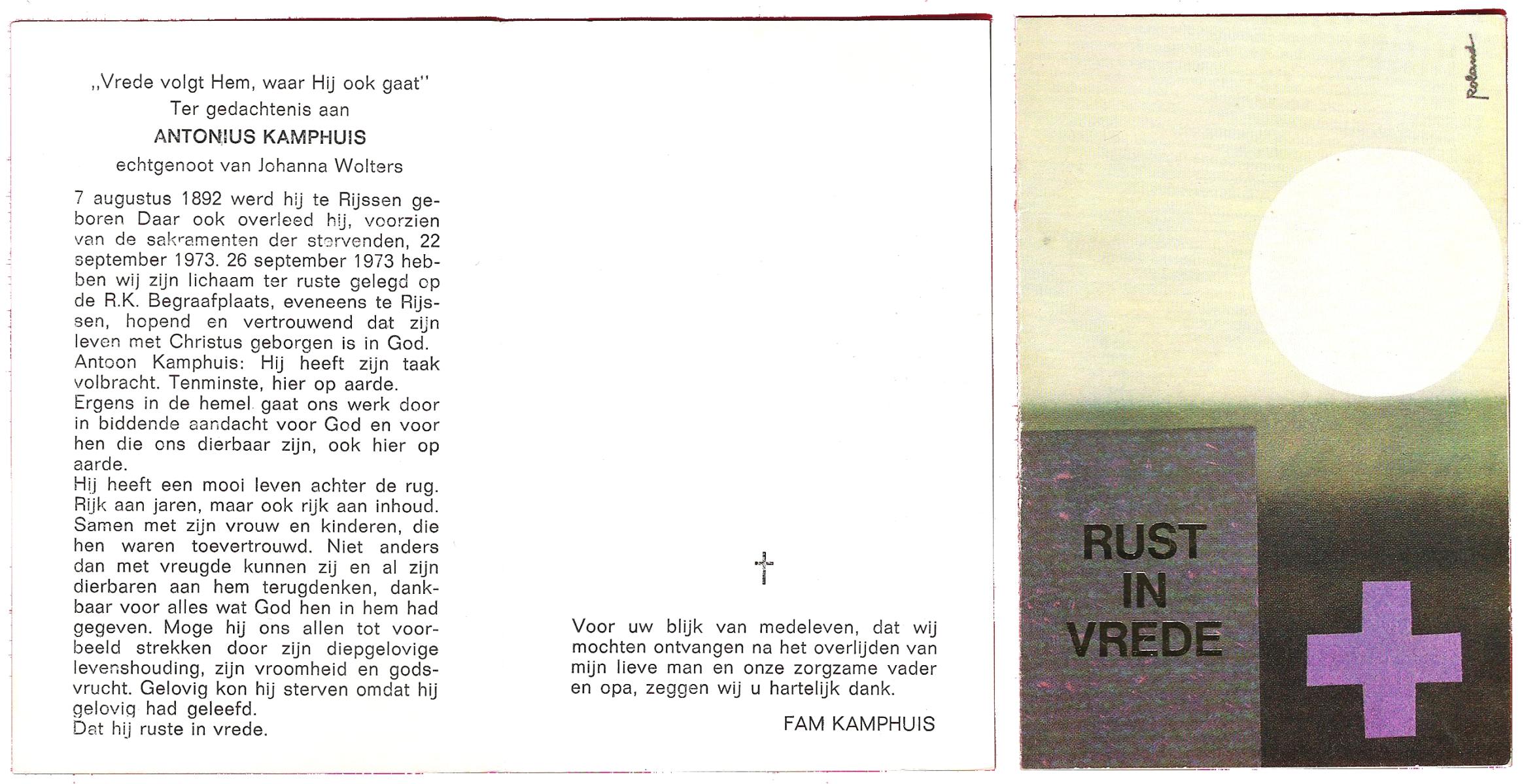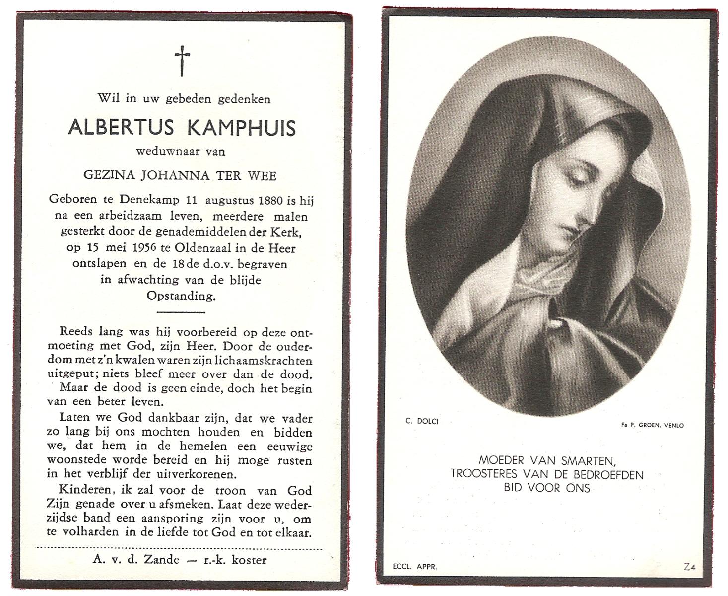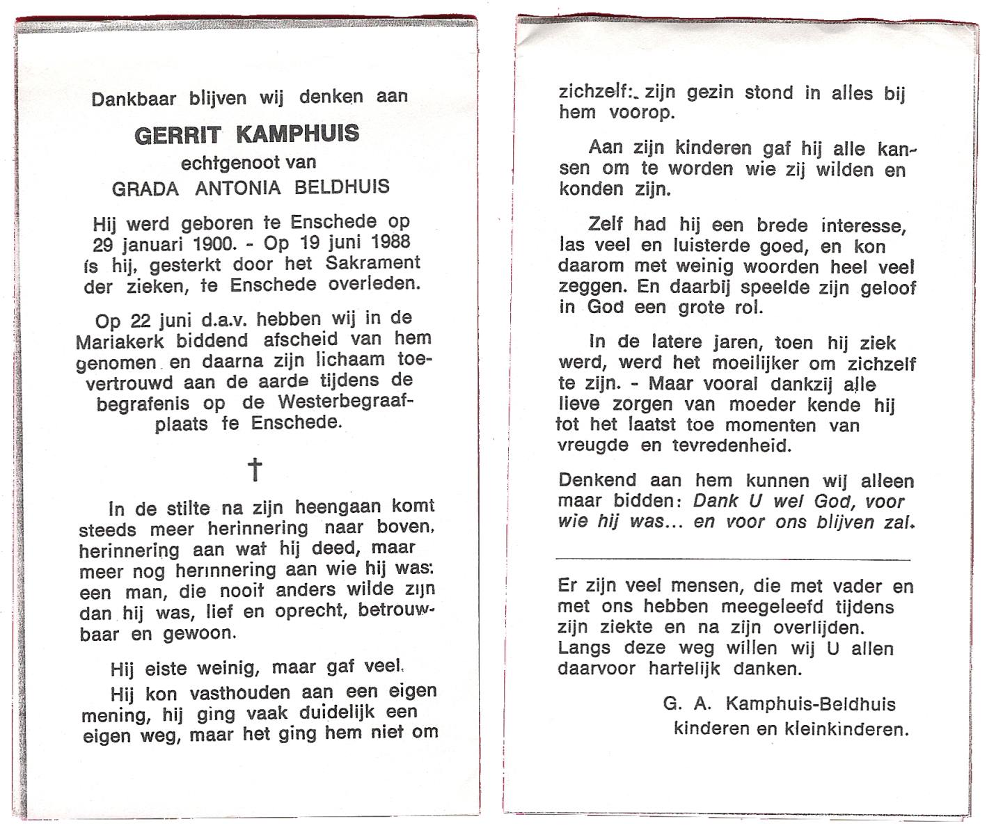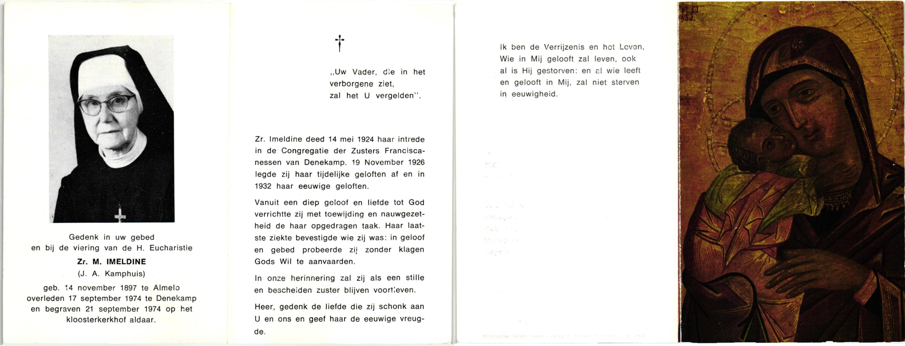 KAMPHUIS, , J.A., geboren op 14-11-1897 te Almelo, overleden op 17-9-1974 te Denekamp op 76-jarige leeftijd, begraven op 21-9-1974 te Denekamp.