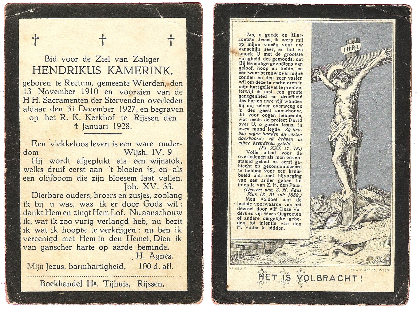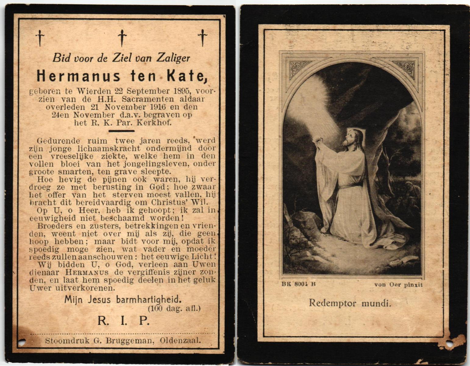 KATE, ten, Hermanus, geboren op 22-09-1895 te Wierden, overleden op 21-11-1916 te Wierden op 21-jarige leeftijd, begraven op 24-11-1916 te Wierden, rk.