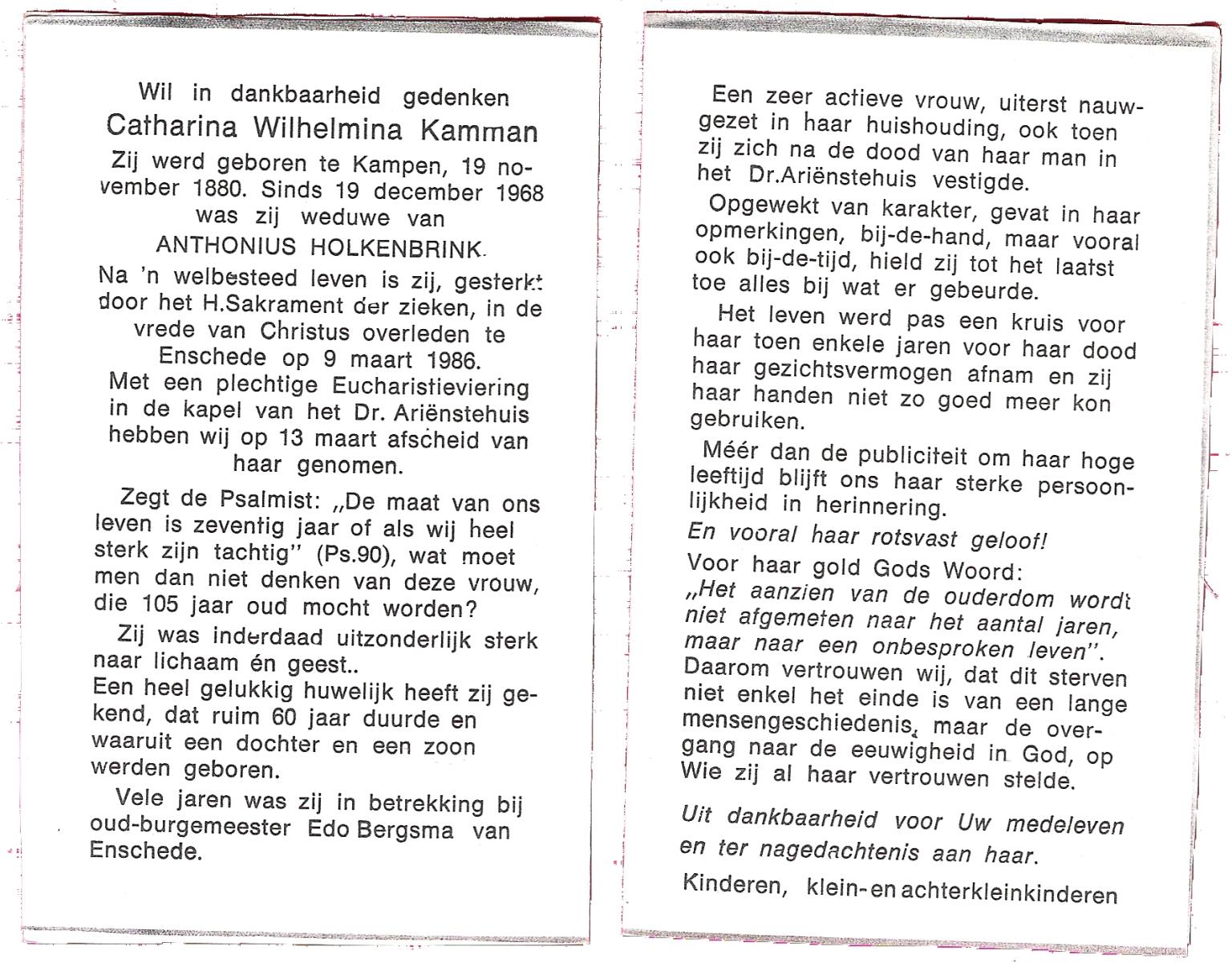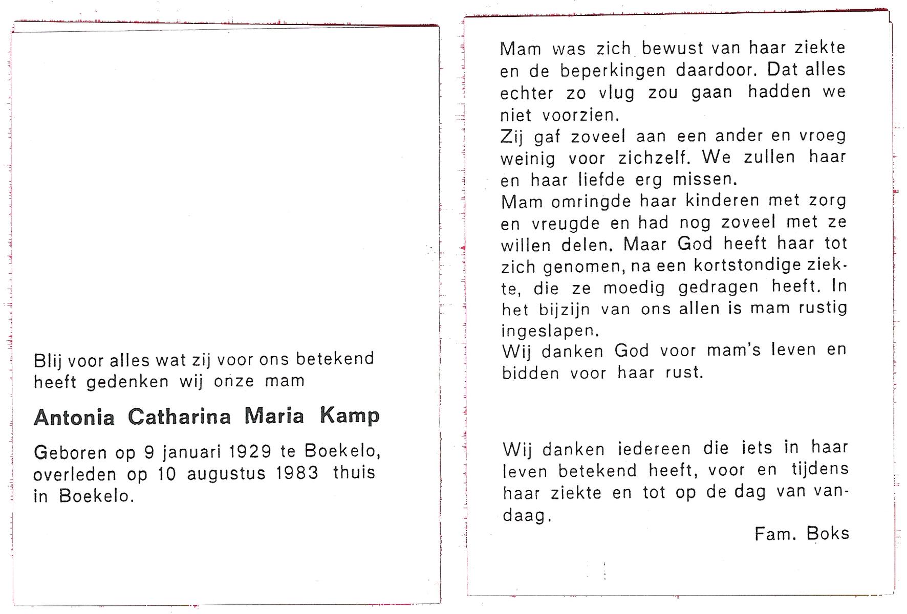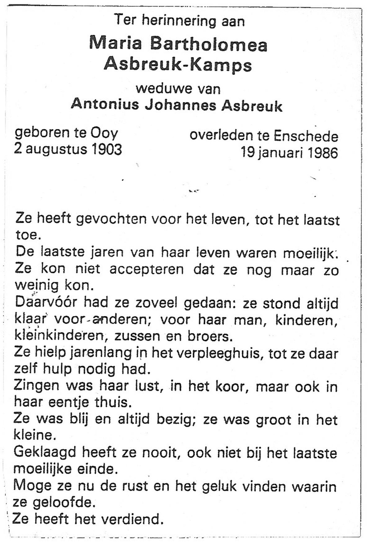 KAMPS, Maria Bartholomea, geboren op 2-8-1903 te Ooy, overleden op 19-1-1986 te Enschede op 82-jarige leeftijd.