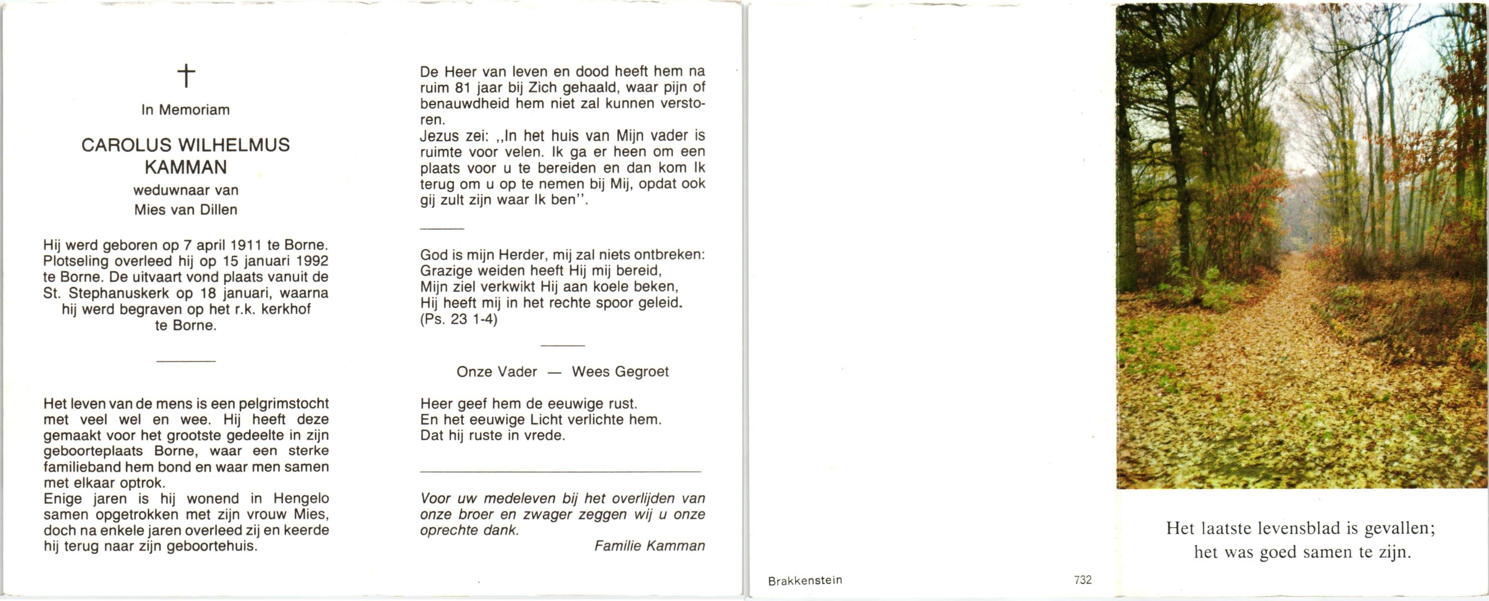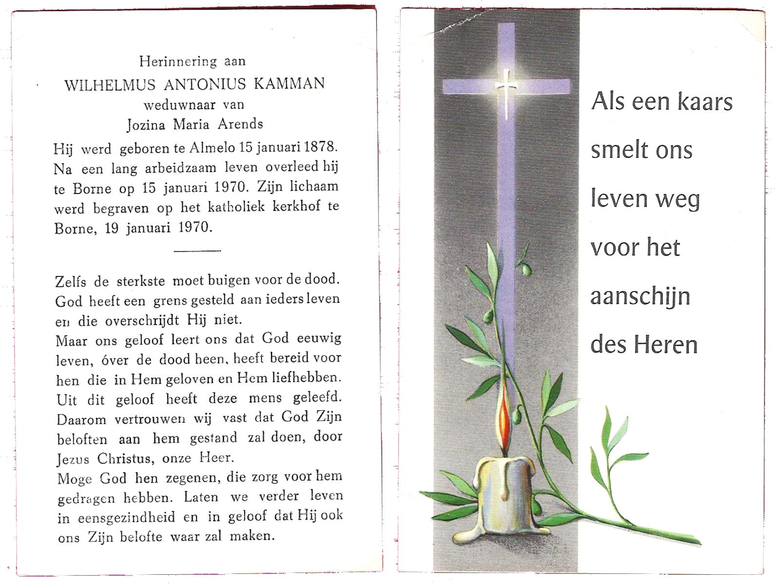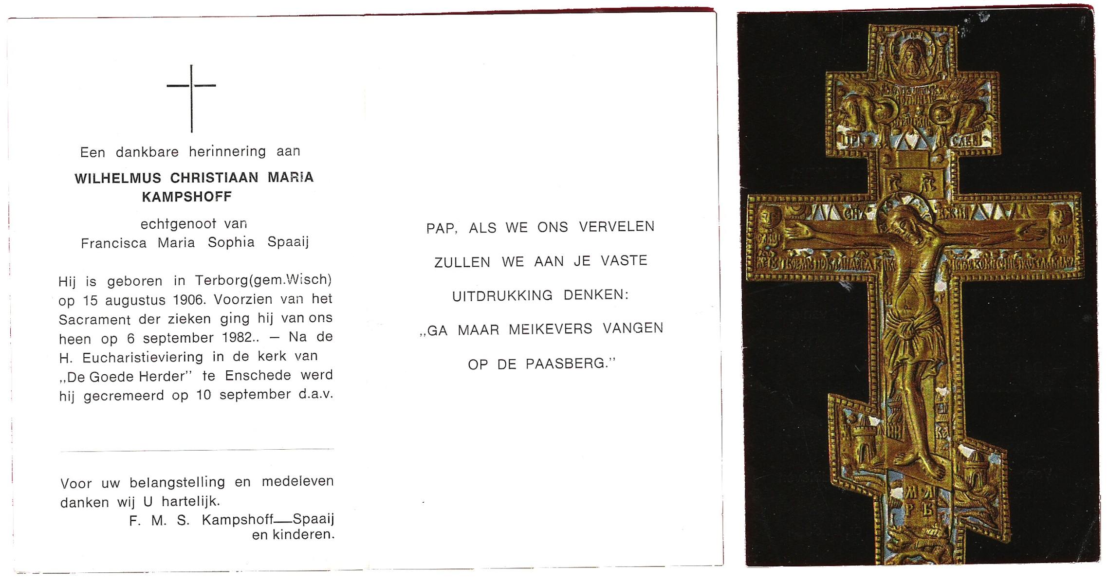 KAMPSHOFF, Wilhelmus Christiaan Maria, geboren op 15-8-1906 te Terborg, overleden op 6-9-1982 te Enschede op 76-jarige leeftijd, gecremeerd op 10-9-1982 te Usselo.