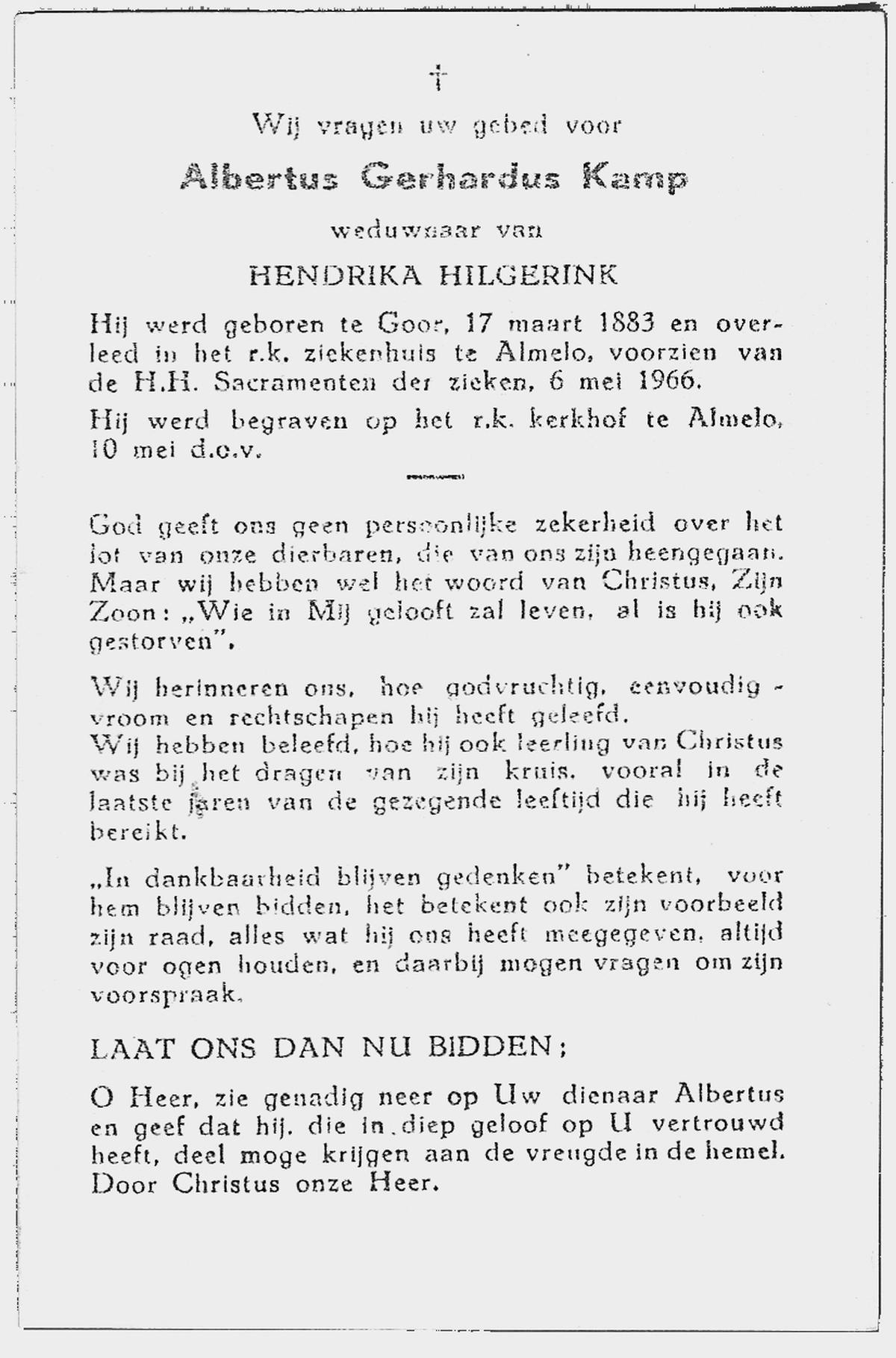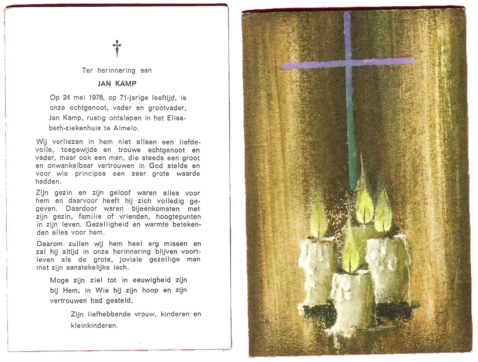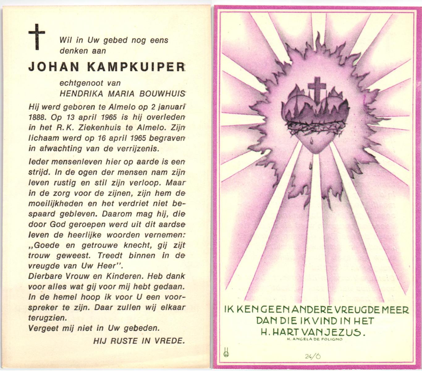 KAMPKUIPER, Johan, geboren op 02-01-1888 te Almelo, overleden op 13-4-1965 te Almelo, ziekenhuis op 77-jarige leeftijd, begraven op 16-4-1985 te Almelo.