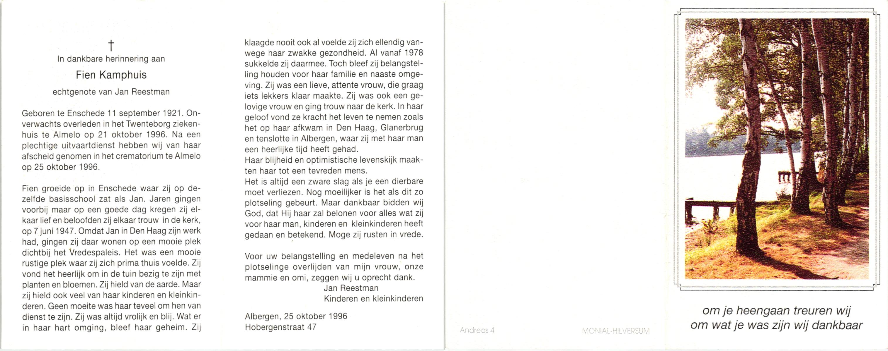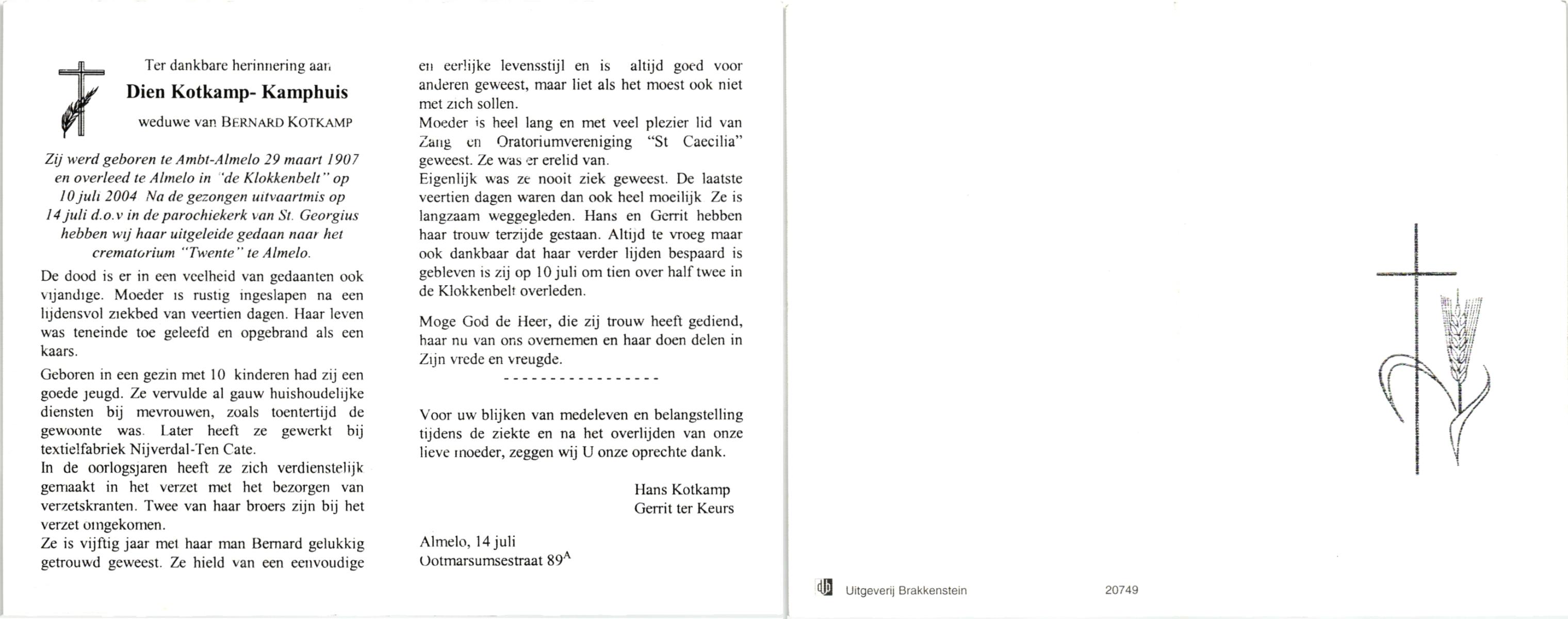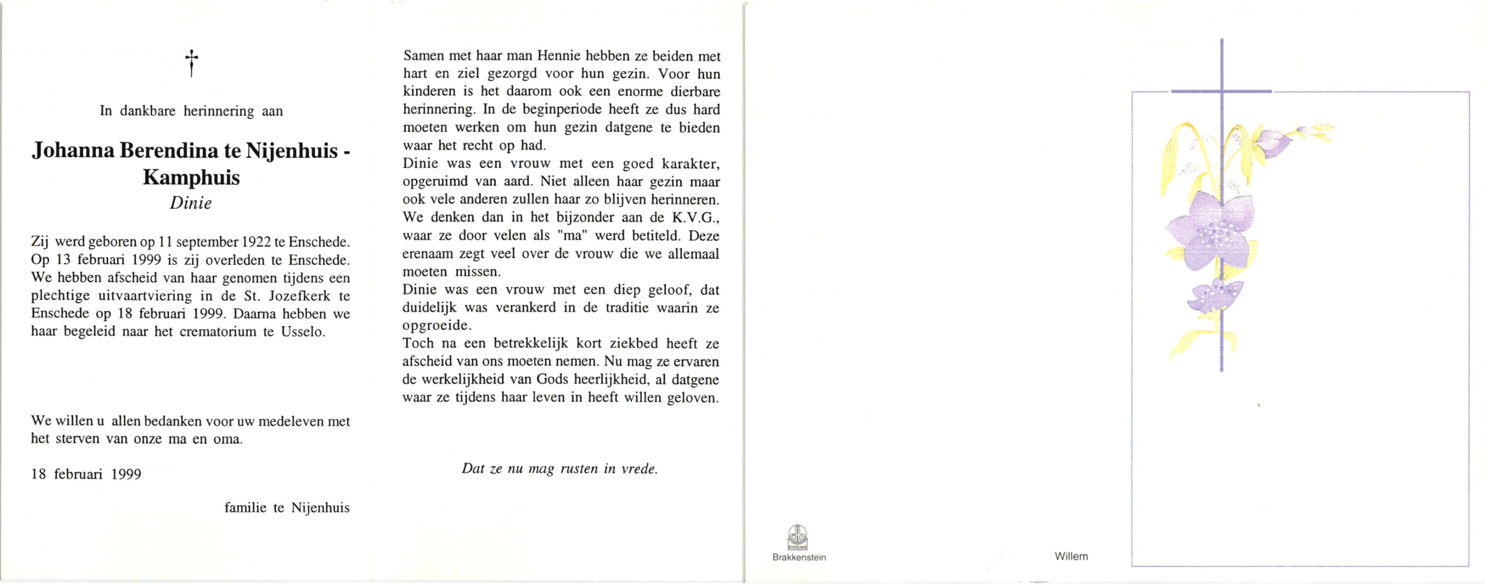KAMPHUIS, , Johanna Berendina (Dinie), geboren op 11-9-1922 te Enschede, overleden op 13-2-1999 te Enschede op 71-jarige leeftijd, gecremeerd op 18-2-1999 te Usselo.