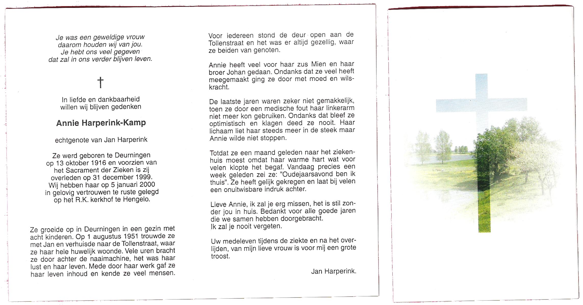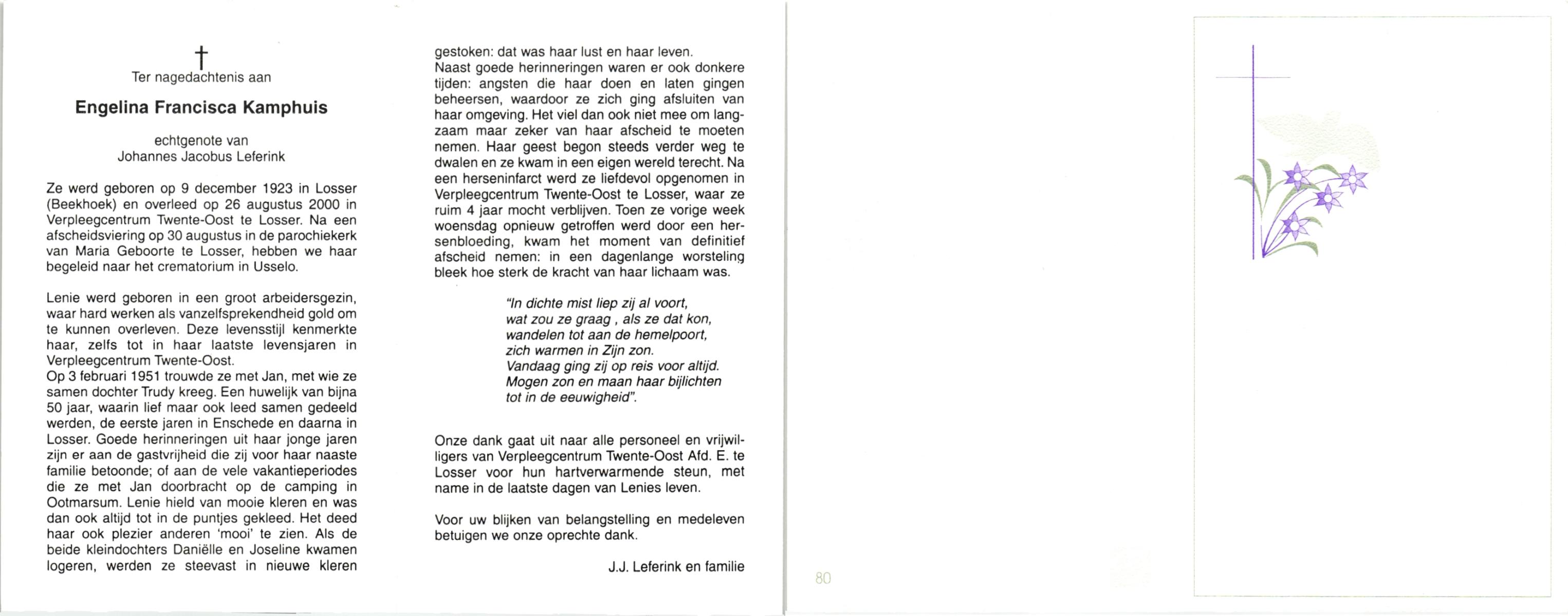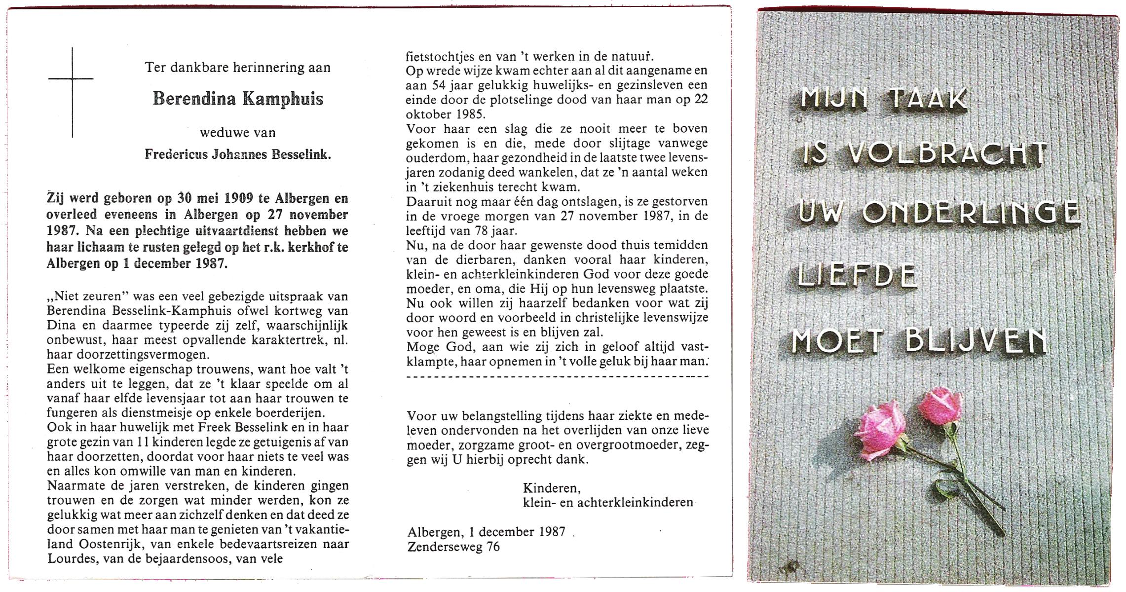 KAMPHUIS, , Johanna Berendina (Dinie), geboren op 11-9-1922 te Enschede, overleden op 13-2-1999 te Enschede op 71-jarige leeftijd, gecremeerd op 18-2-1999 te Usselo.