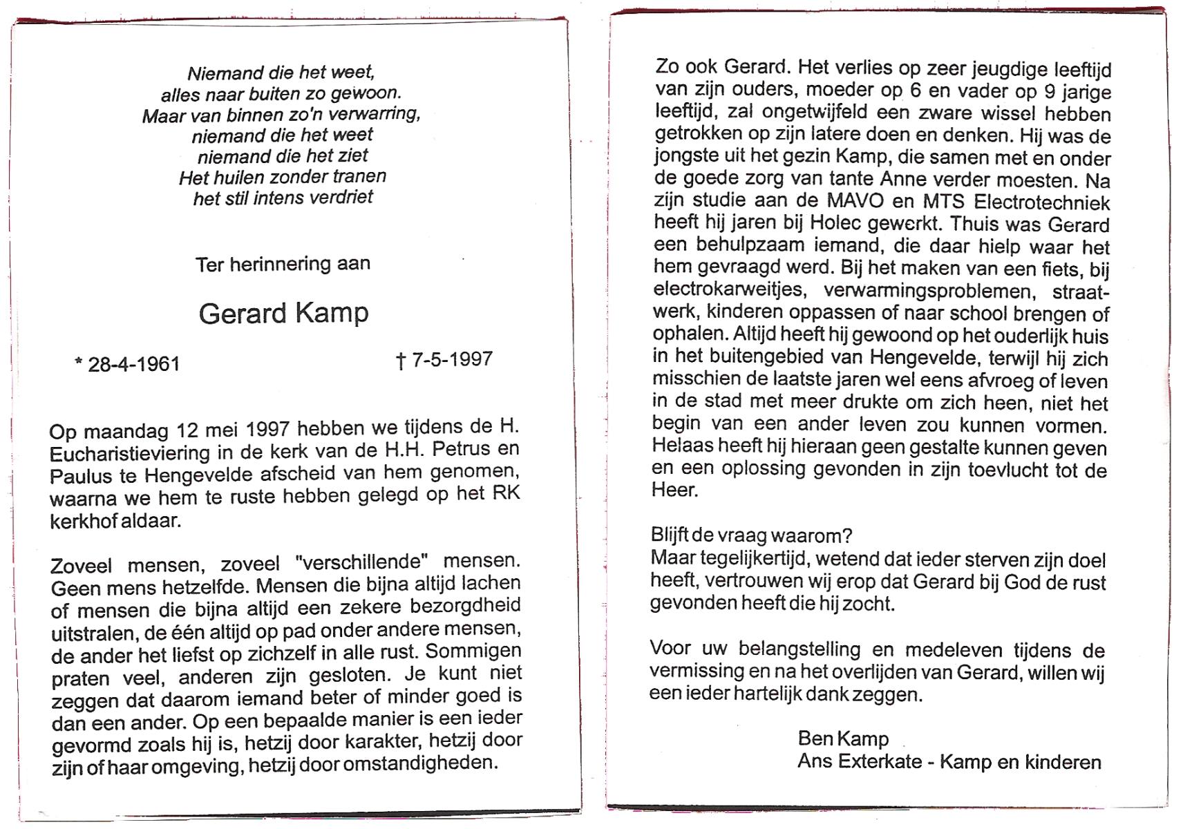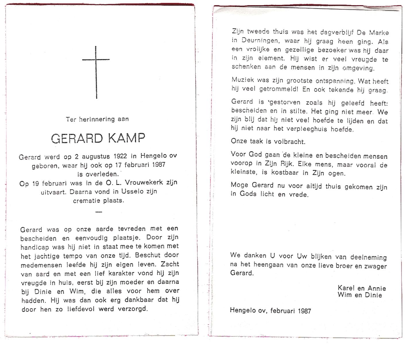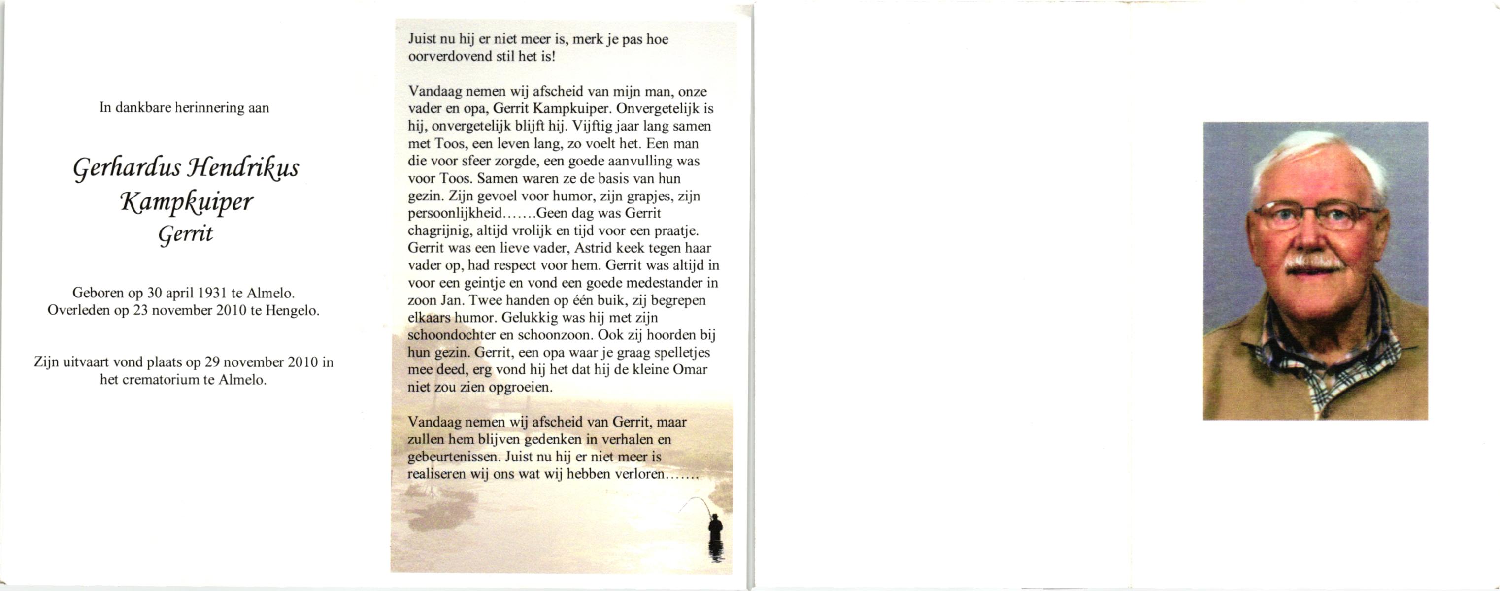 KAMPKUIPER, , Gerhardus Hendrikus (Gerrit), geboren op 30-4-1931 te Almelo, overleden op 23-11-2010 te Hengelo (O) op 79-jarige leeftijd, gecremeerd op 29-11-2010 te Almelo.