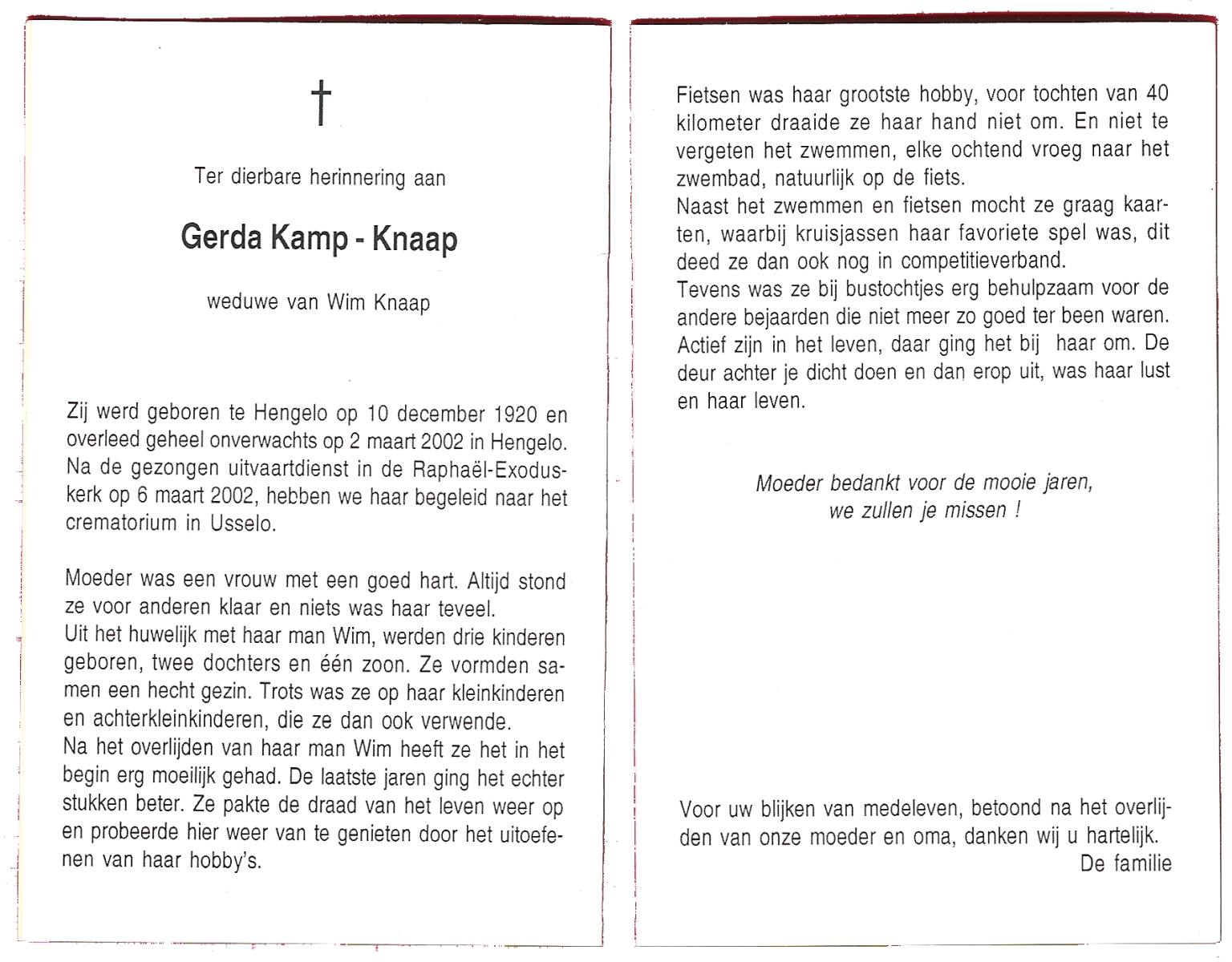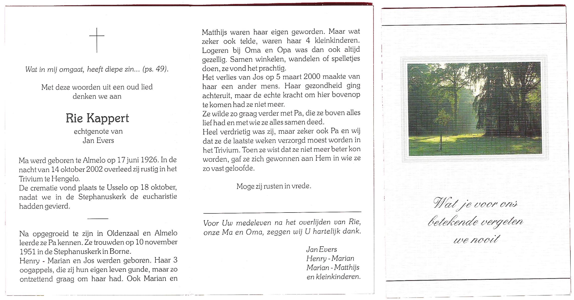 KAPPERT, Rie, geboren op 17-6-1926 te Almelo, overleden op 14-10-2002 te Hengelo (Ov.) op 76-jarige leeftijd, gecremeerd op 18-10-2002 te Usselo.