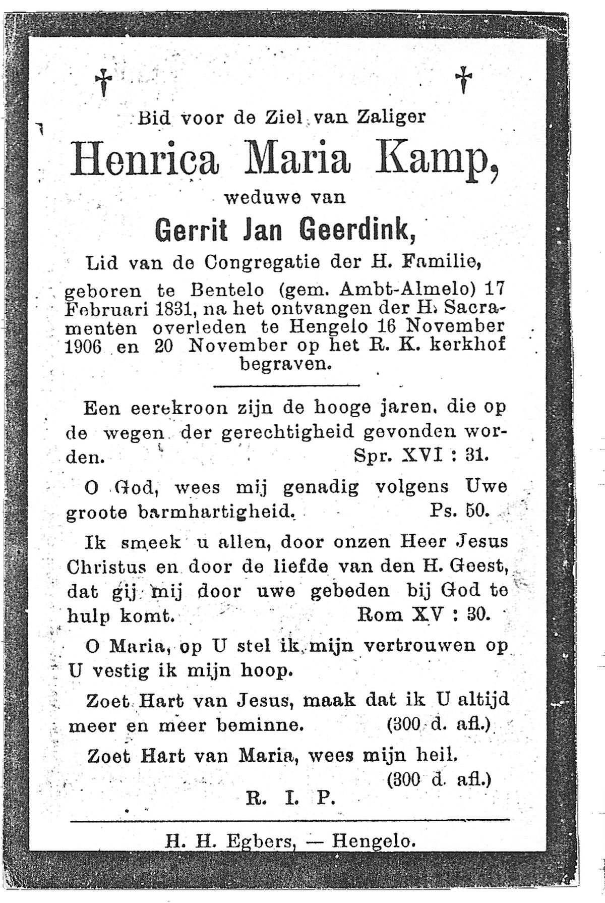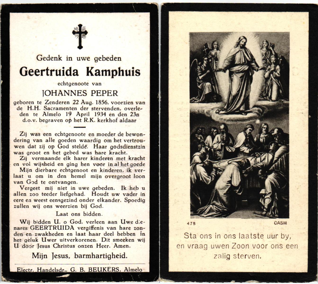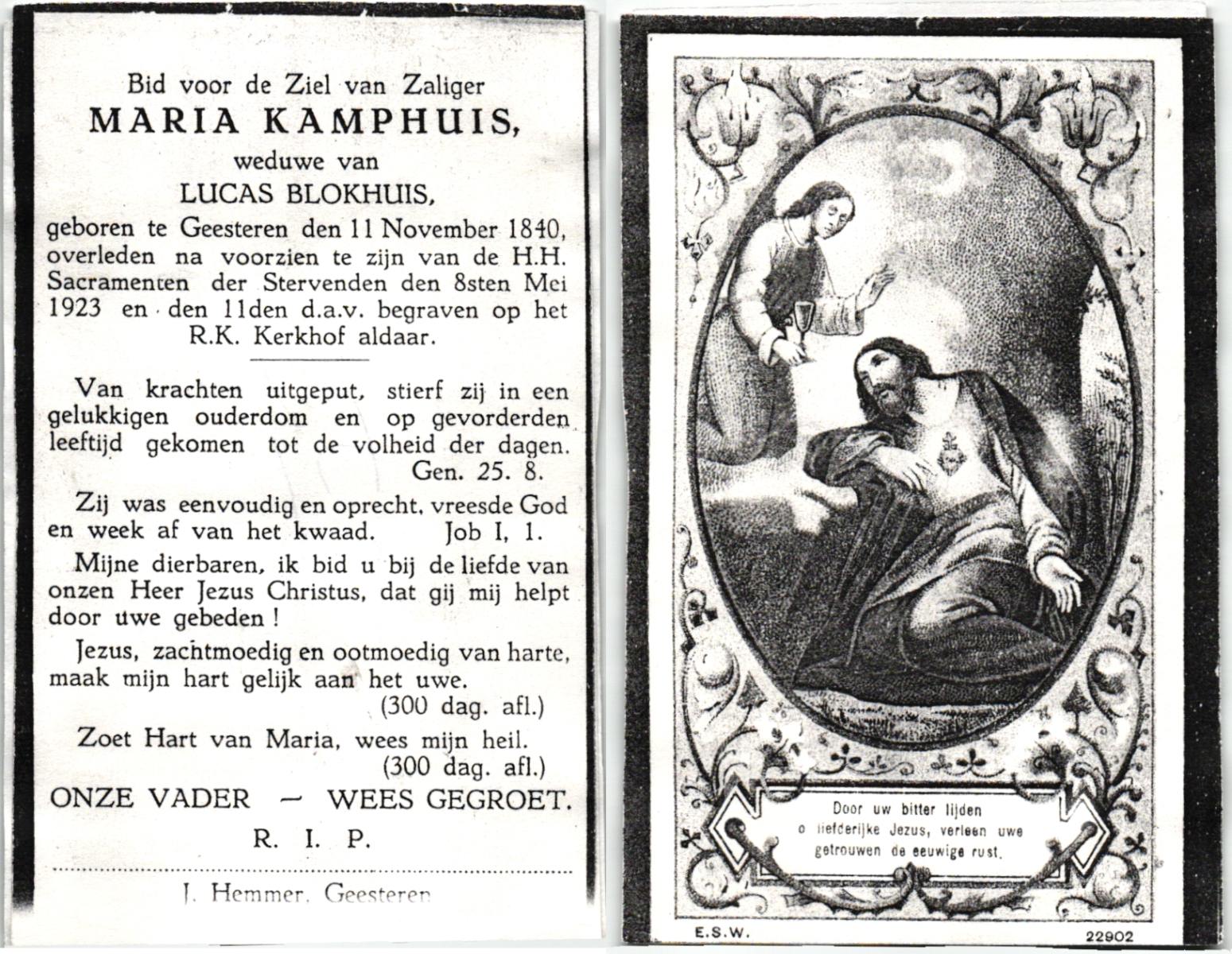 KAMPHUIS, , Maria, geboren op 11-11-1840 te Geesteren, overleden op 8-5-1923 te Geesteren op 82-jarige leeftijd, begraven op 11-5-1923 te Geesteren.