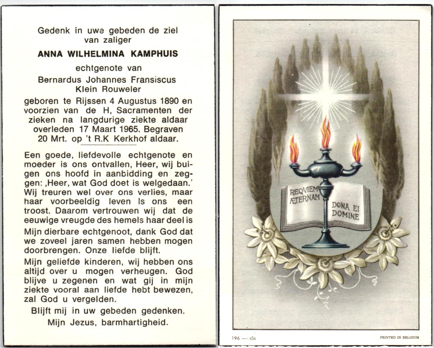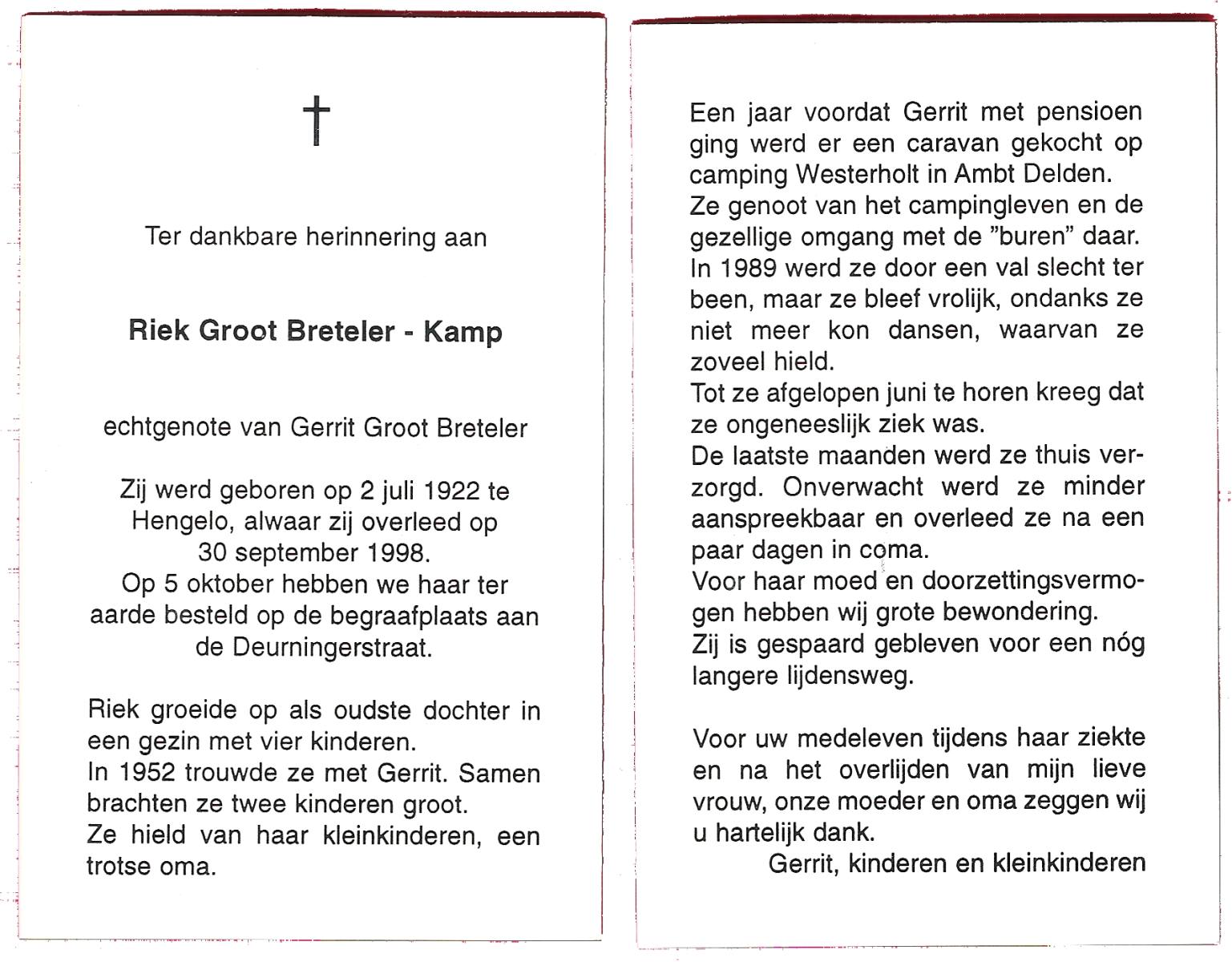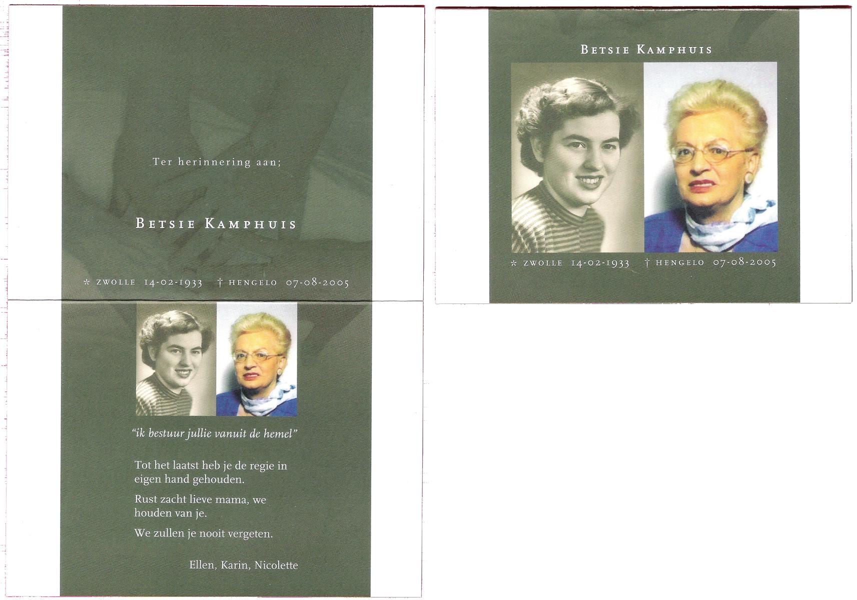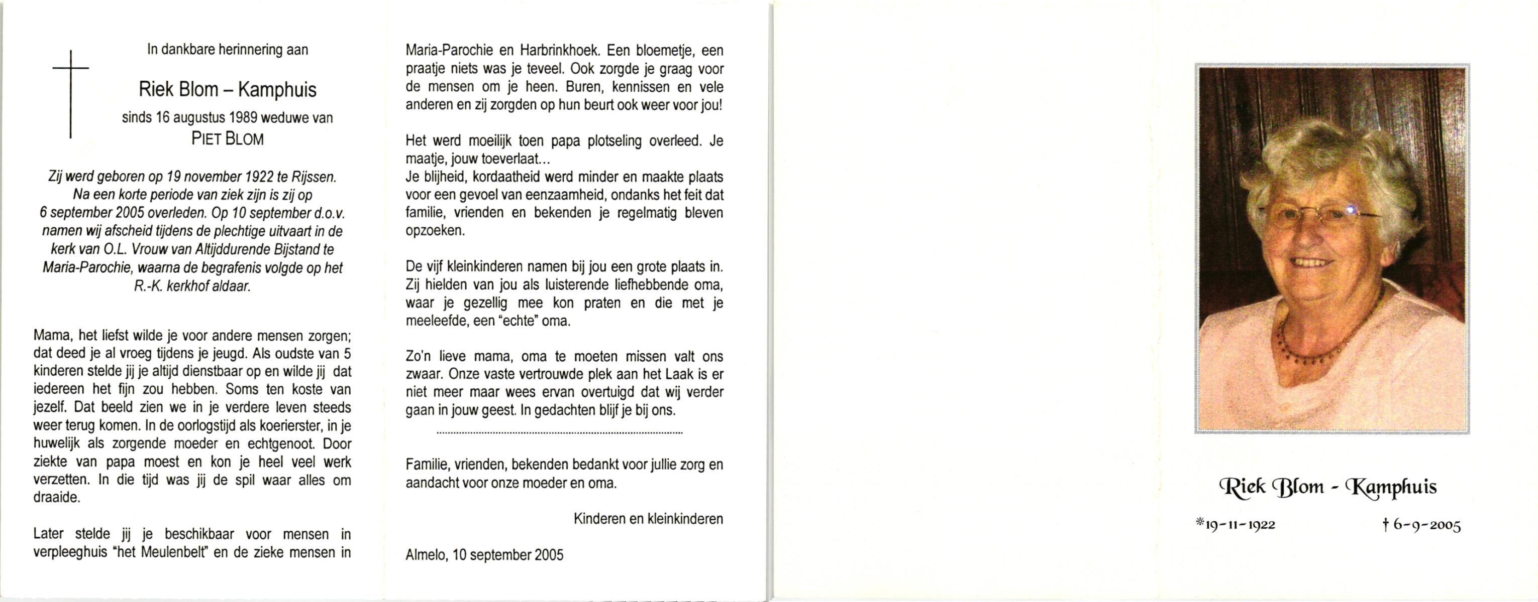 KAMPHUIS, , Riek, geboren op 19-11-1922 te Rijssen, overleden op 6-9-2005 op 82-jarige leeftijd, begraven op 10-9-2005 te Mariaparochie.