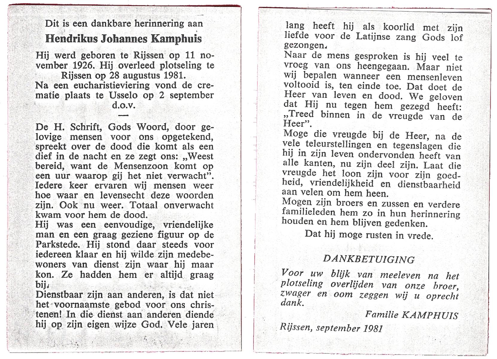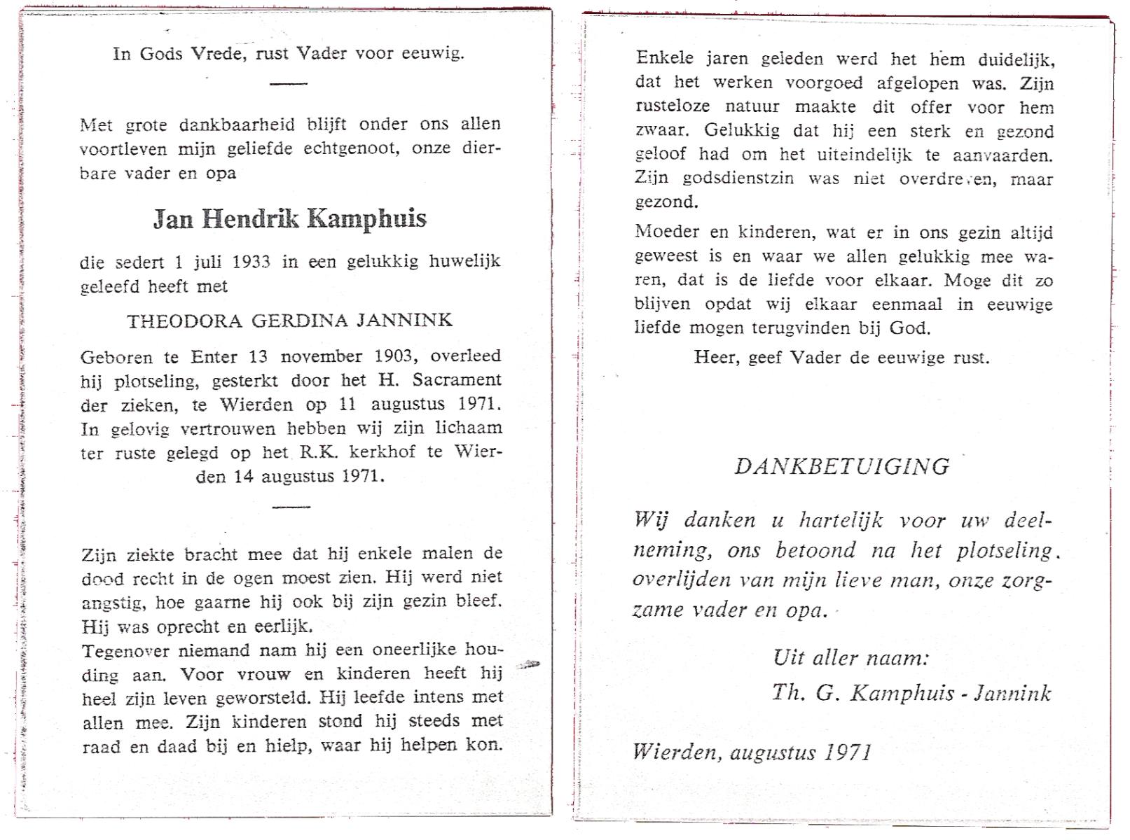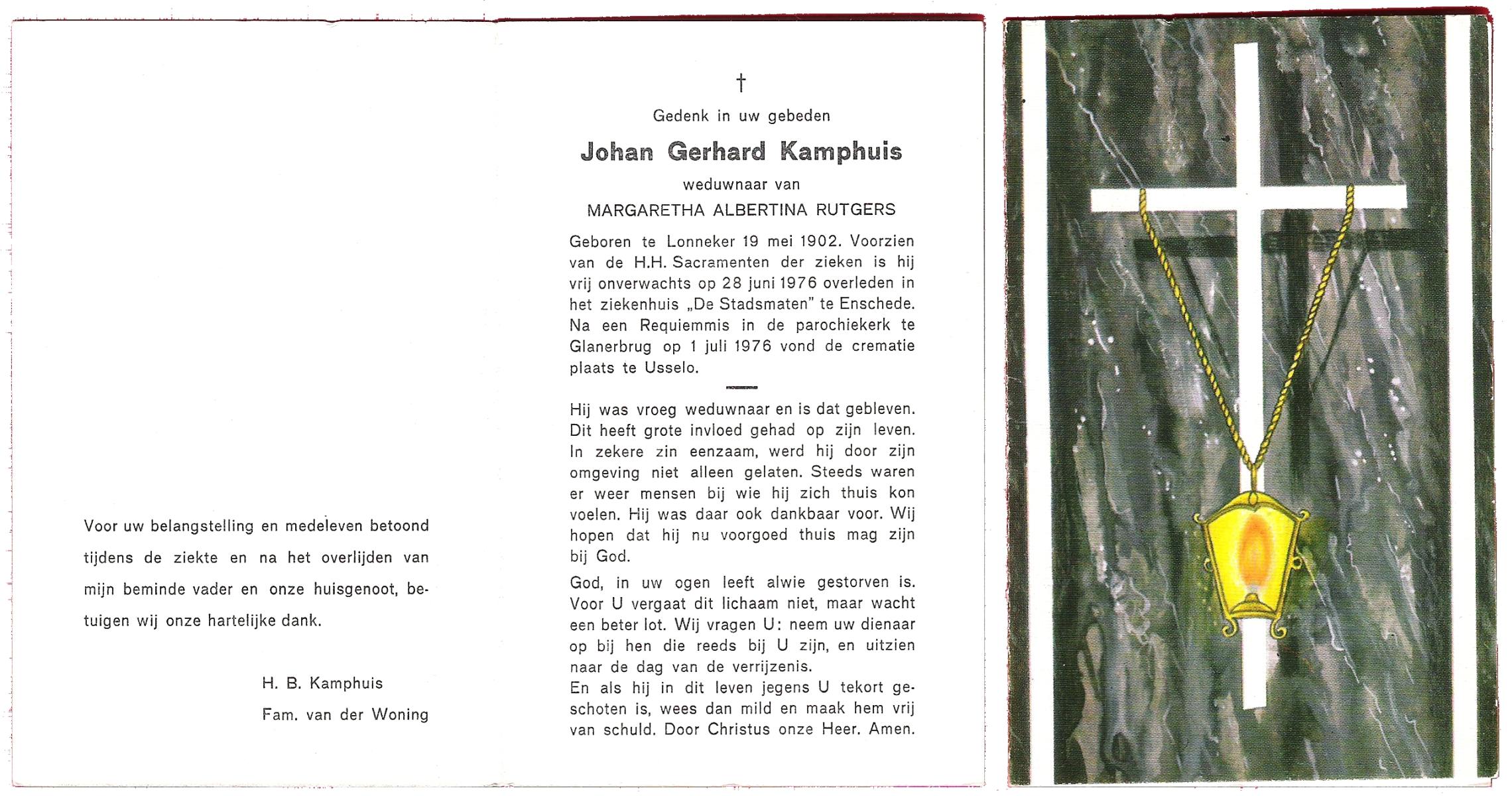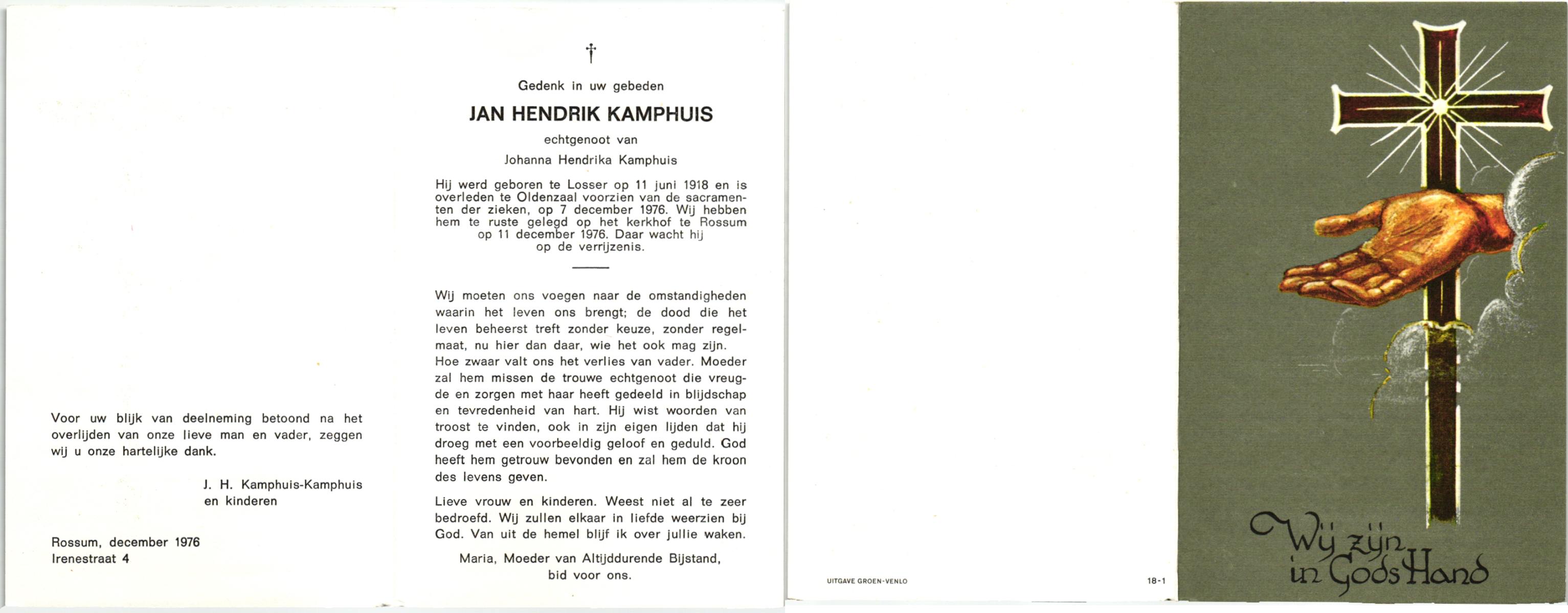 KAMPHUIS, , Jan Hendrik, geboren op 11-6-1918 te Losser, overleden op 7-12-1976 te Oldenzaal op 58-jarige leeftijd, gecremeerd op 11-12-1976 te Rossum.