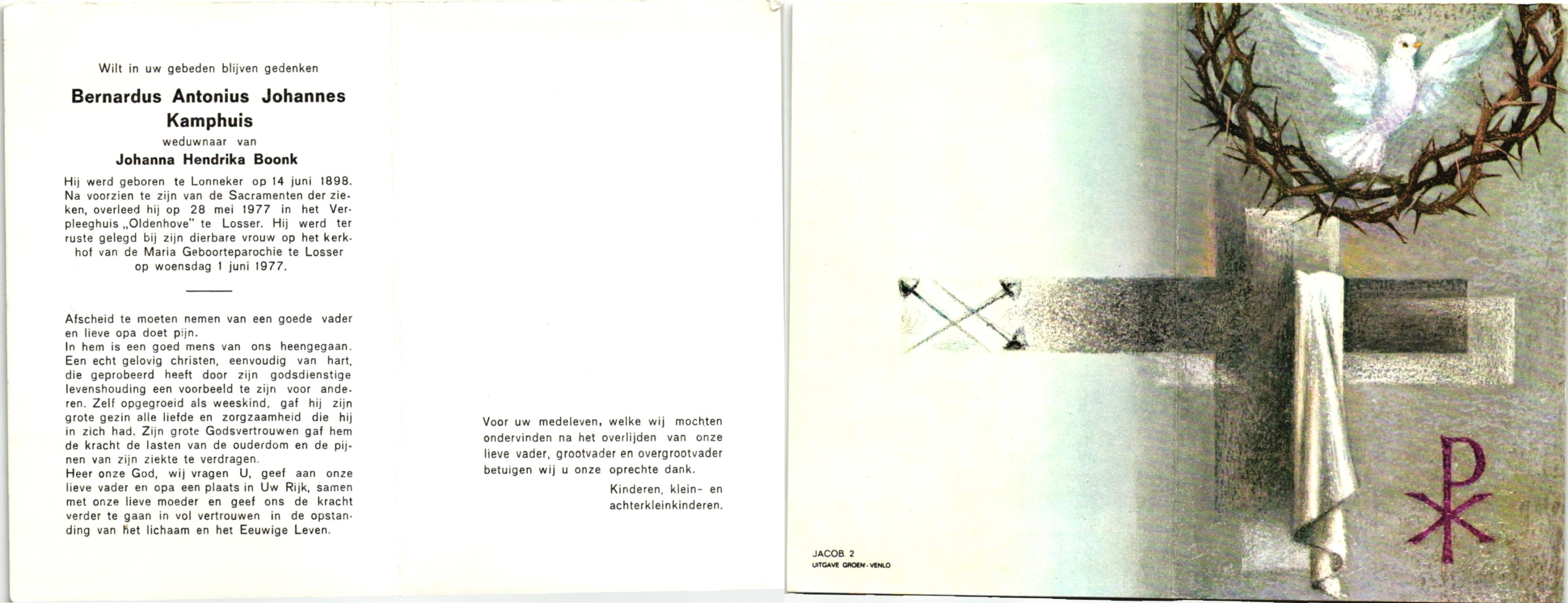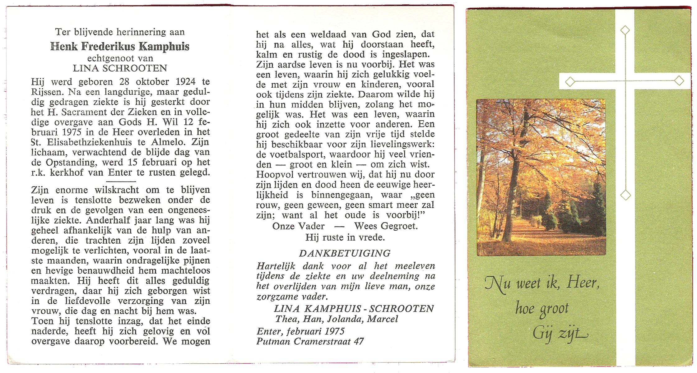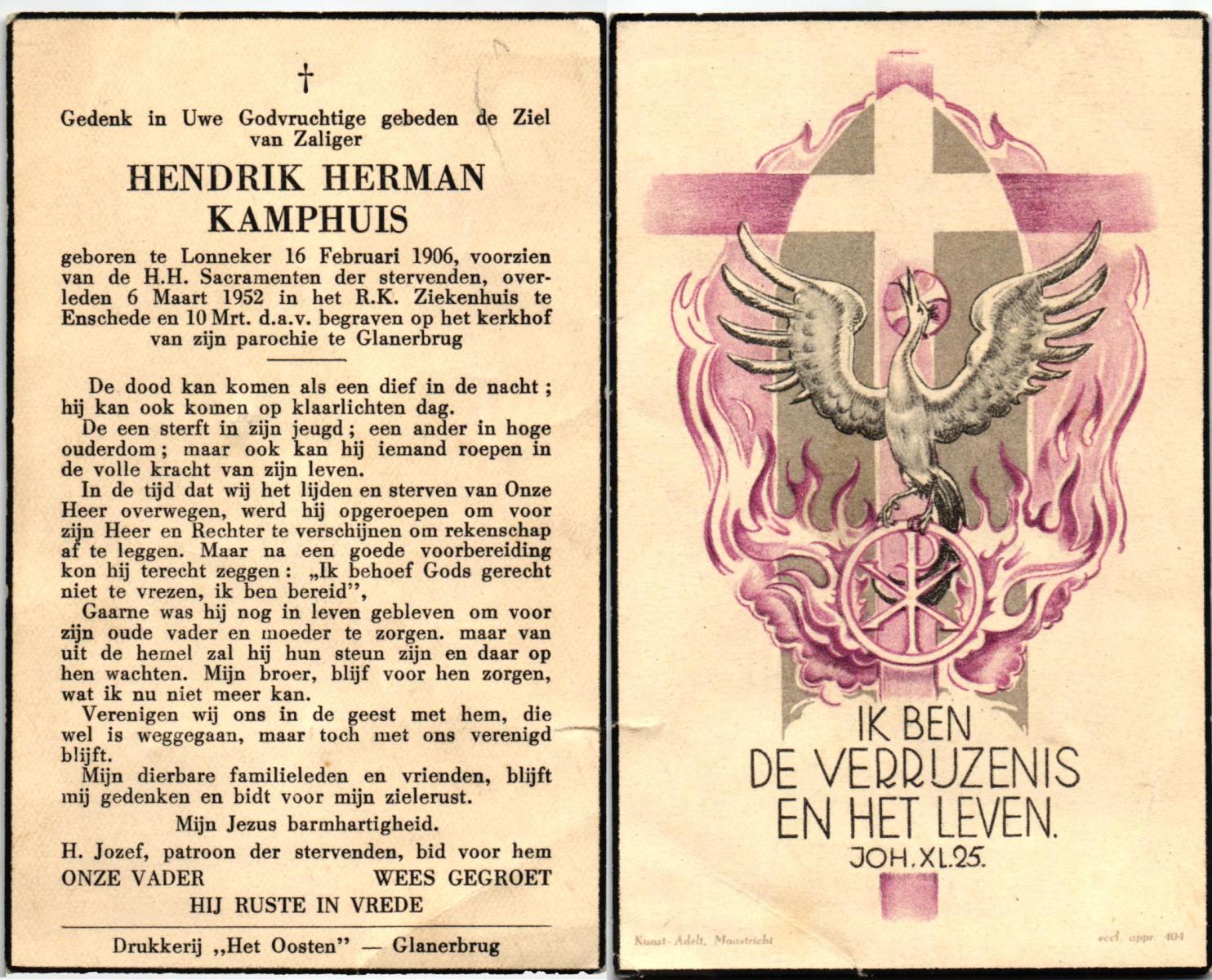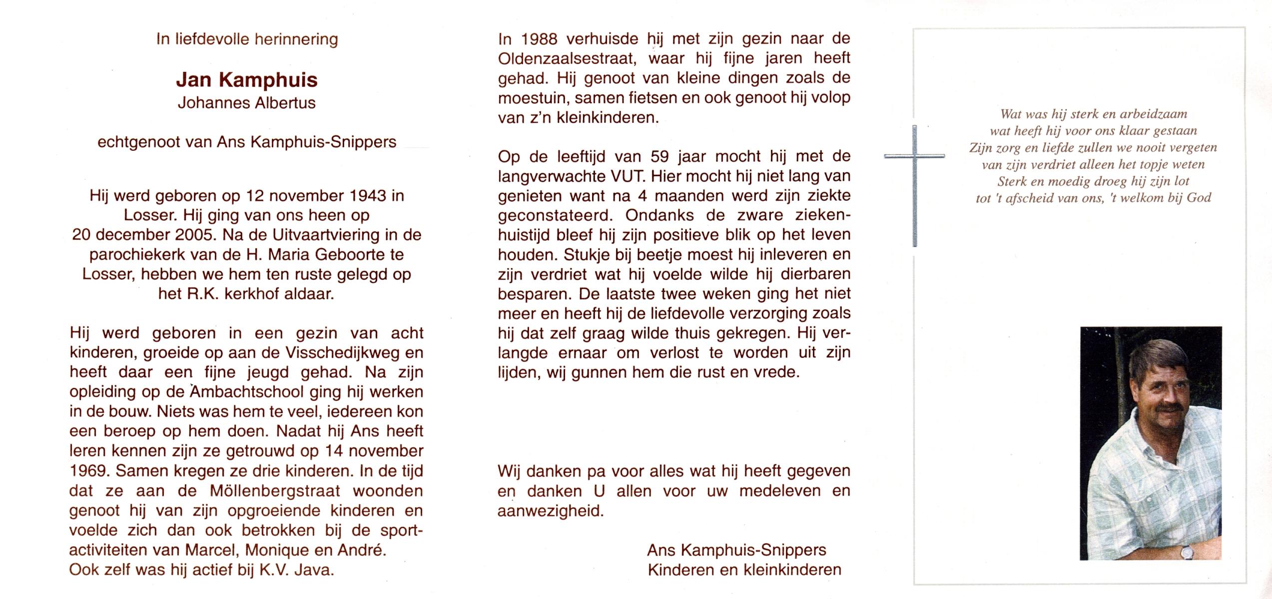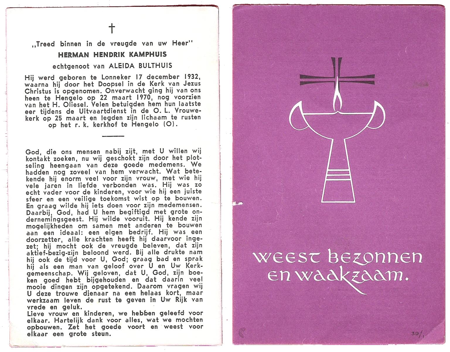 KAMPHUIS, , Jan Hendrik, geboren op 11-6-1918 te Losser, overleden op 7-12-1976 te Oldenzaal op 58-jarige leeftijd, gecremeerd op 11-12-1976 te Rossum.