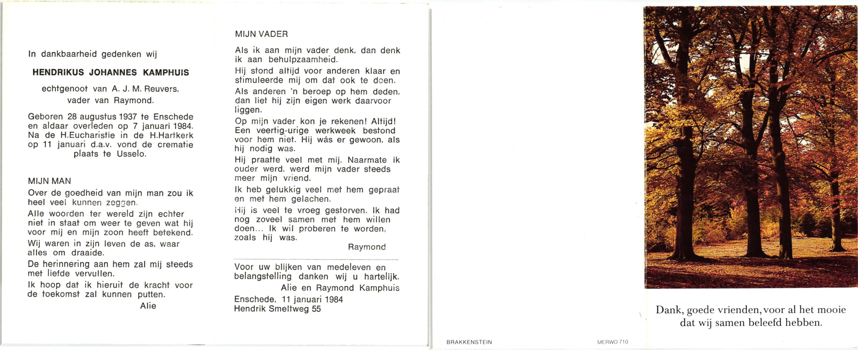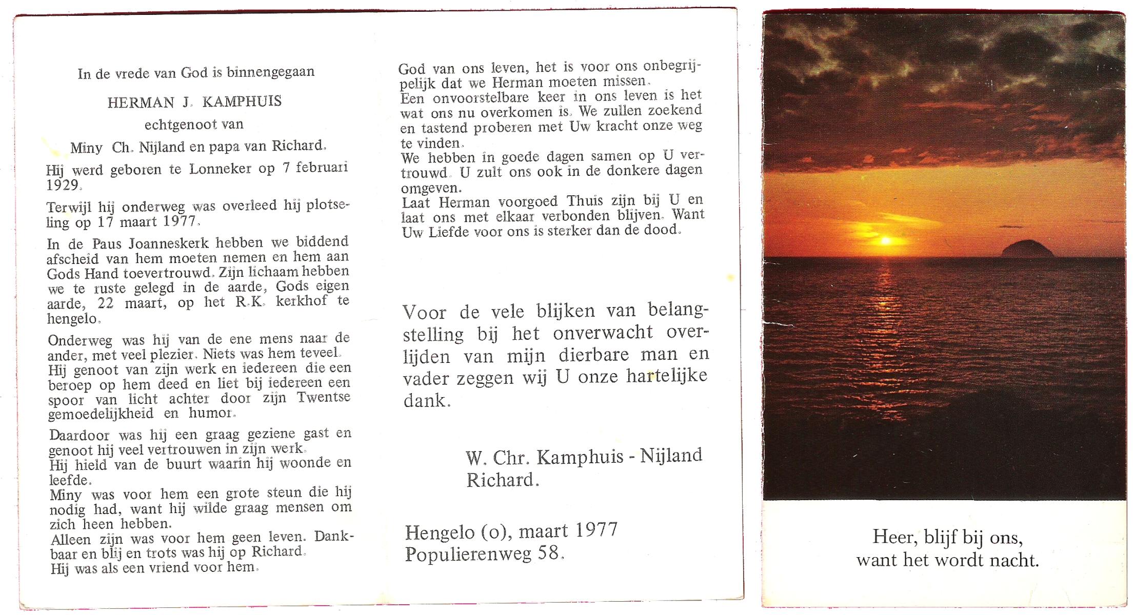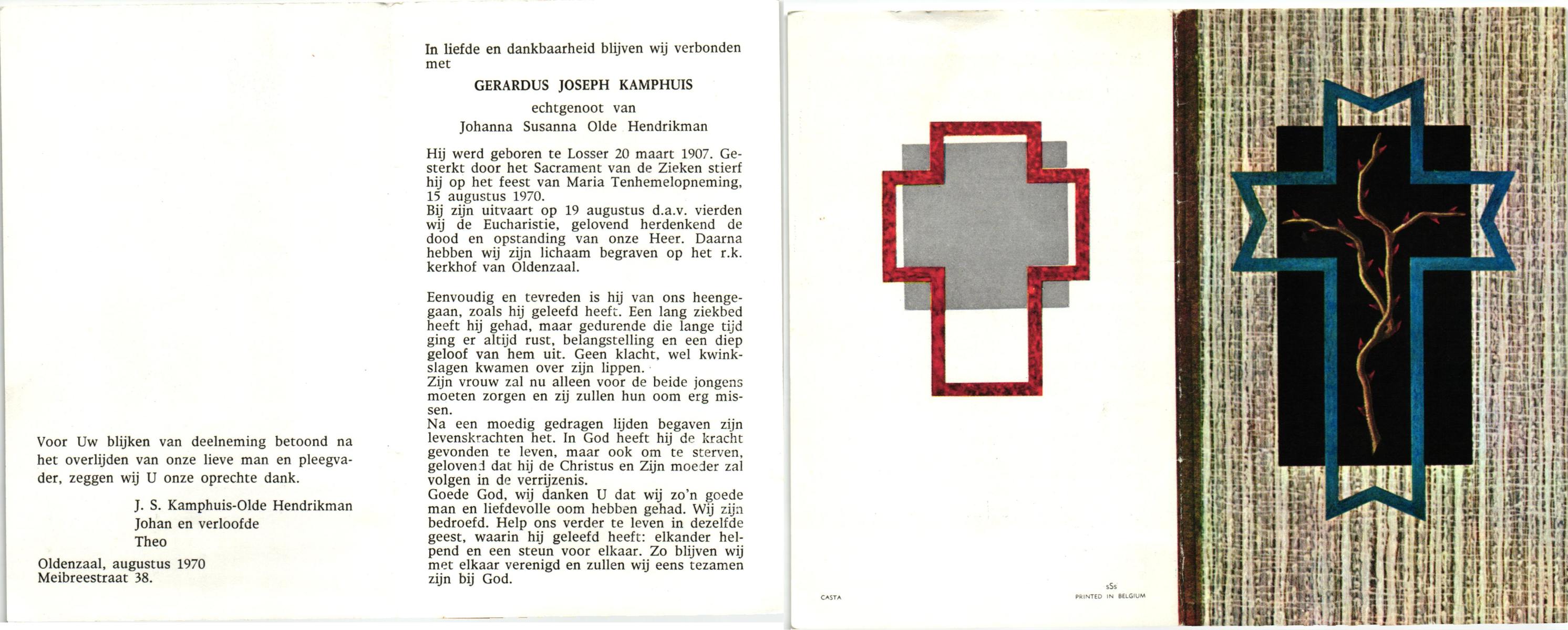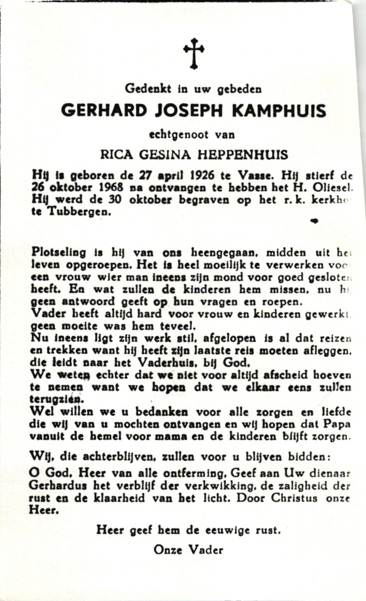 KAMPHUIS, , Jan Hendrik, geboren op 11-6-1918 te Losser, overleden op 7-12-1976 te Oldenzaal op 58-jarige leeftijd, gecremeerd op 11-12-1976 te Rossum.
