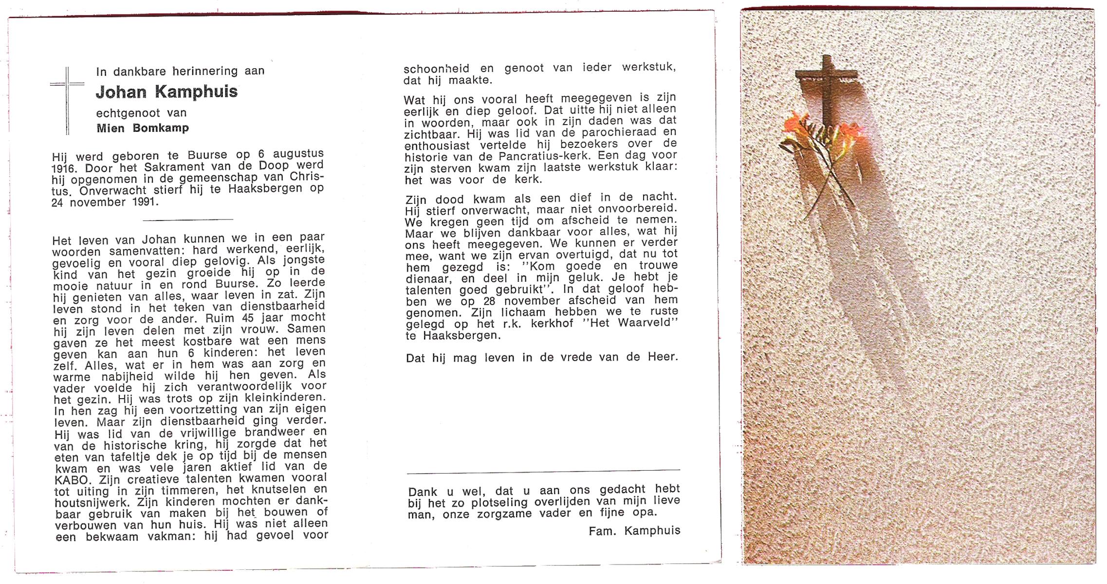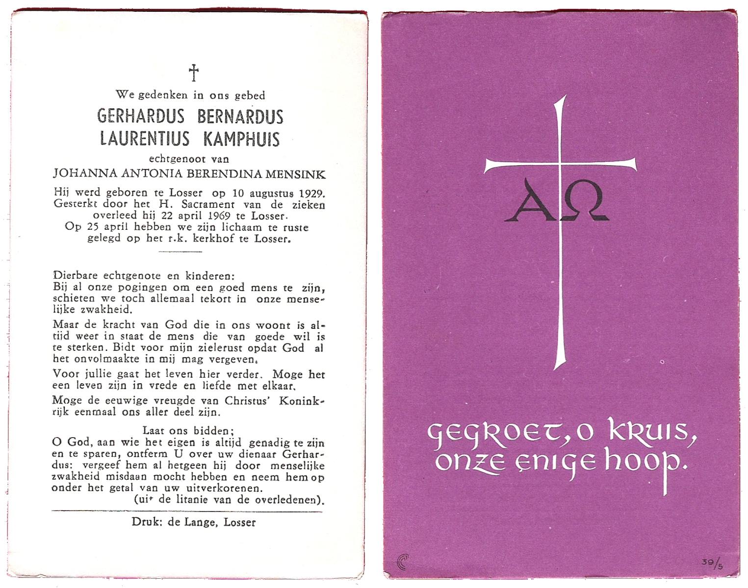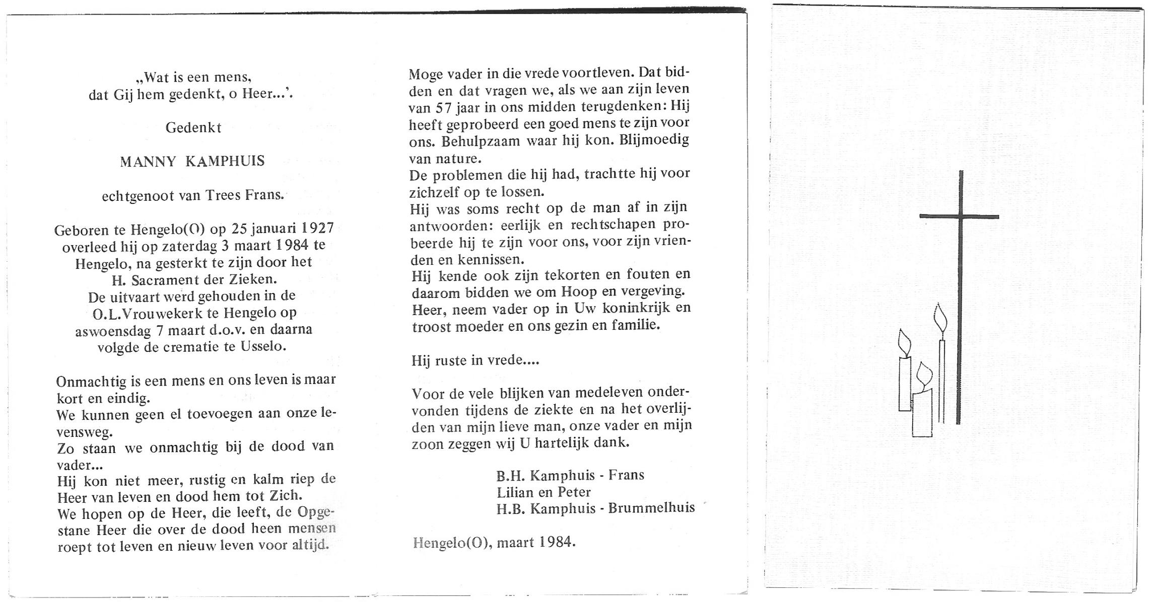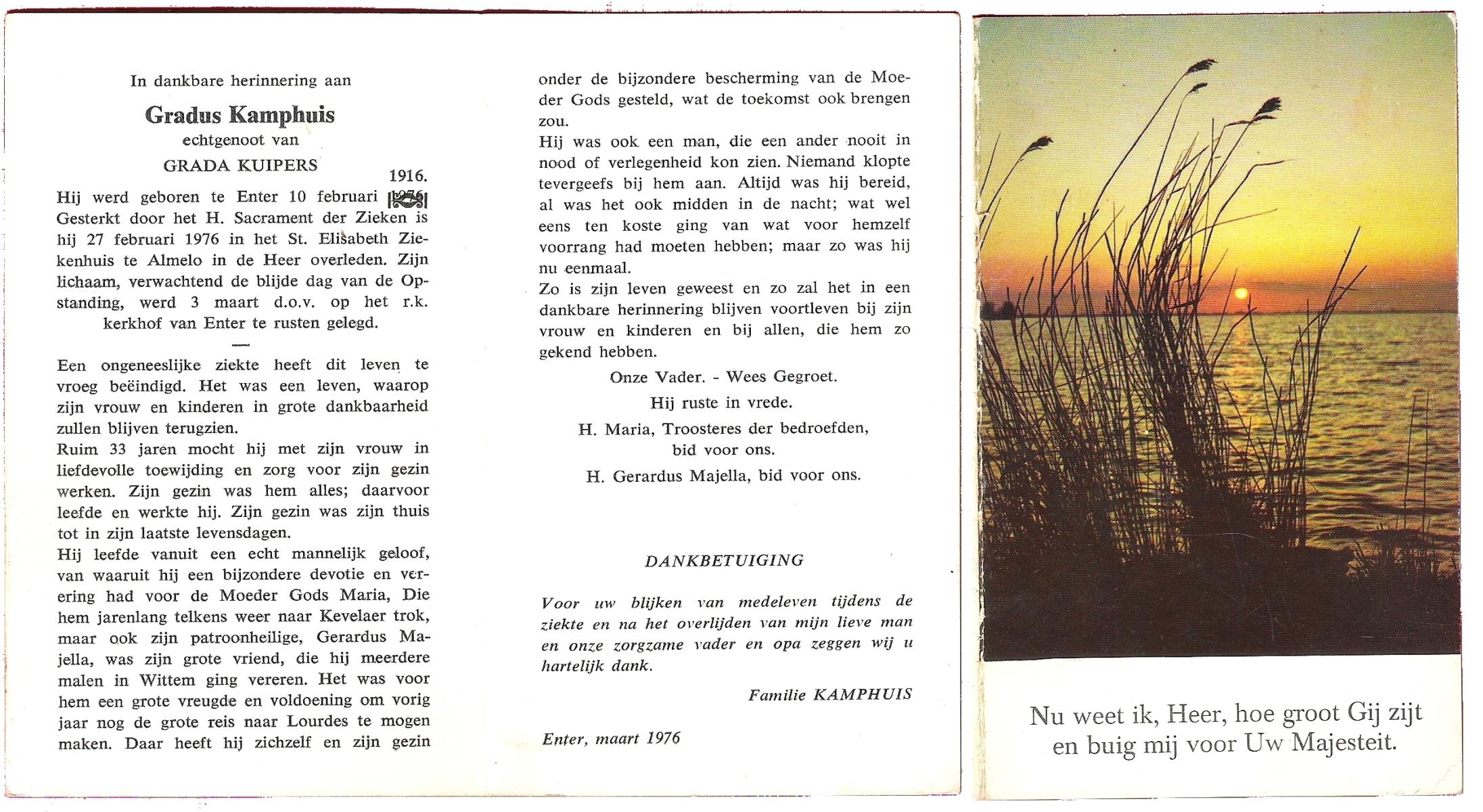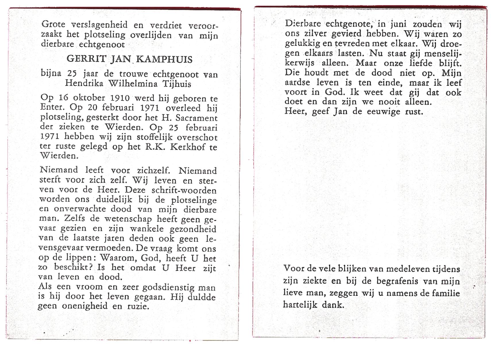 KAMPHUIS, , Jan Hendrik, geboren op 11-6-1918 te Losser, overleden op 7-12-1976 te Oldenzaal op 58-jarige leeftijd, gecremeerd op 11-12-1976 te Rossum.