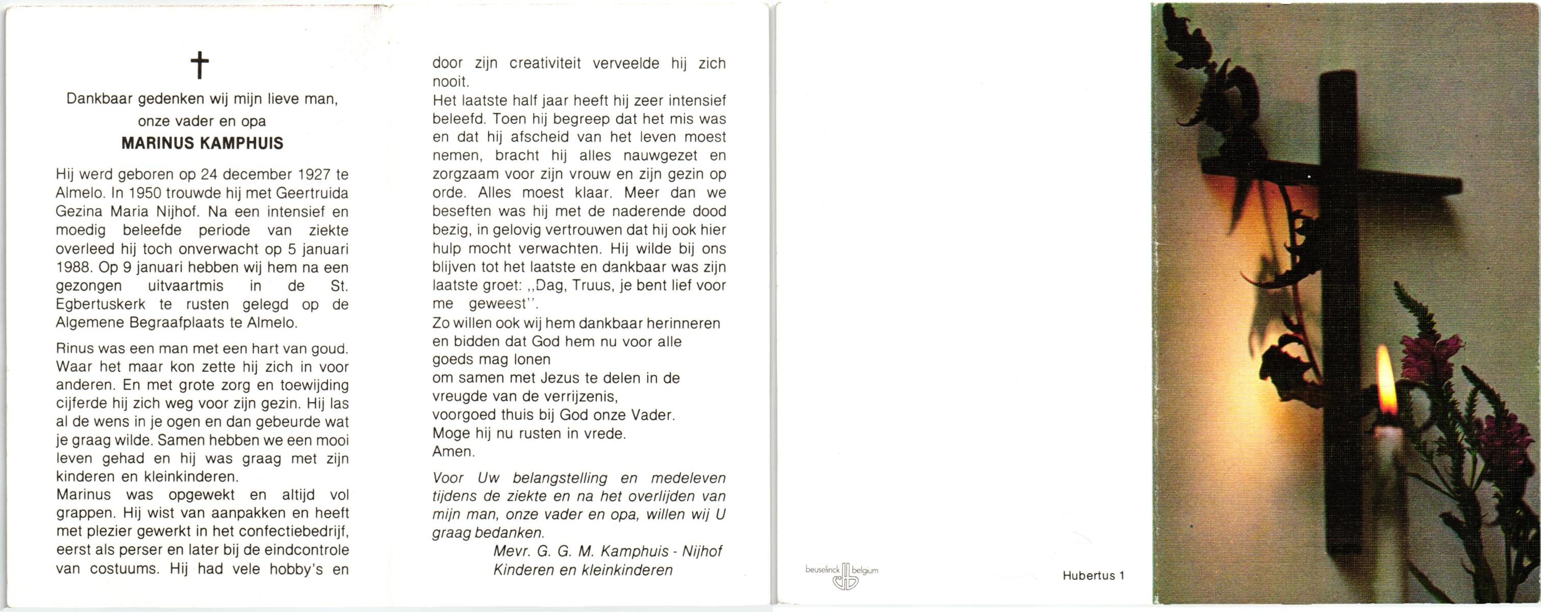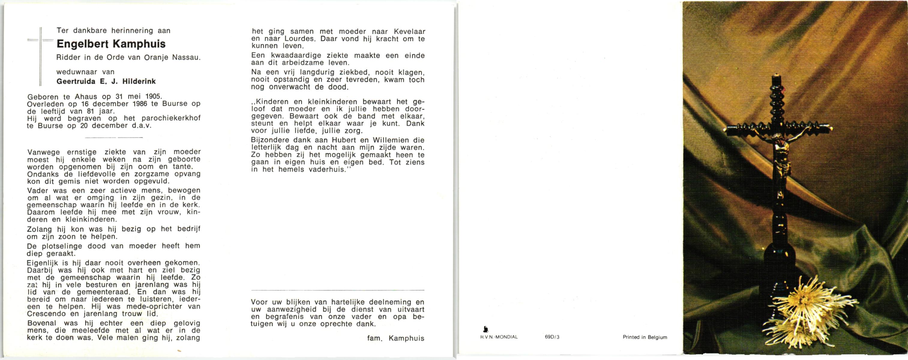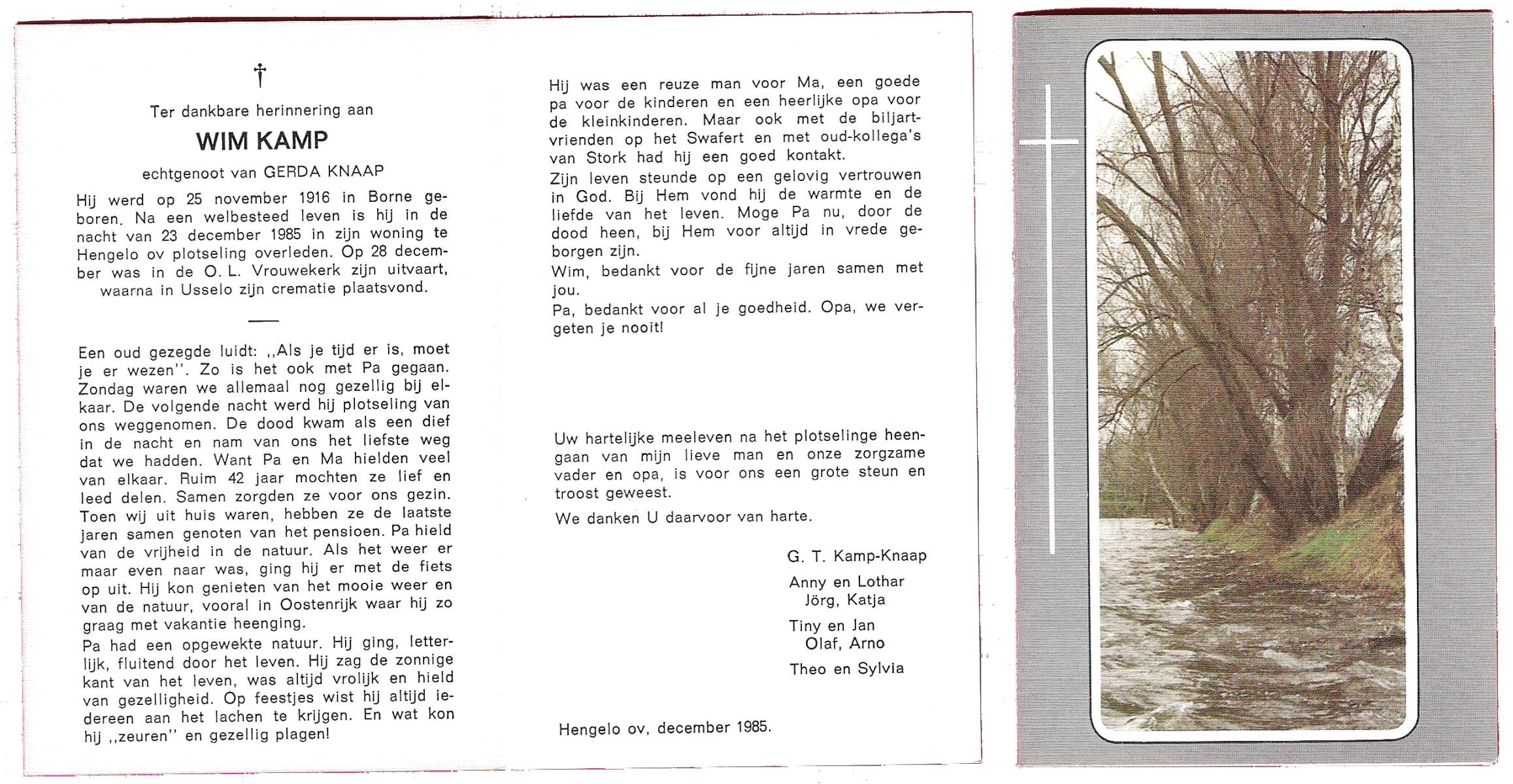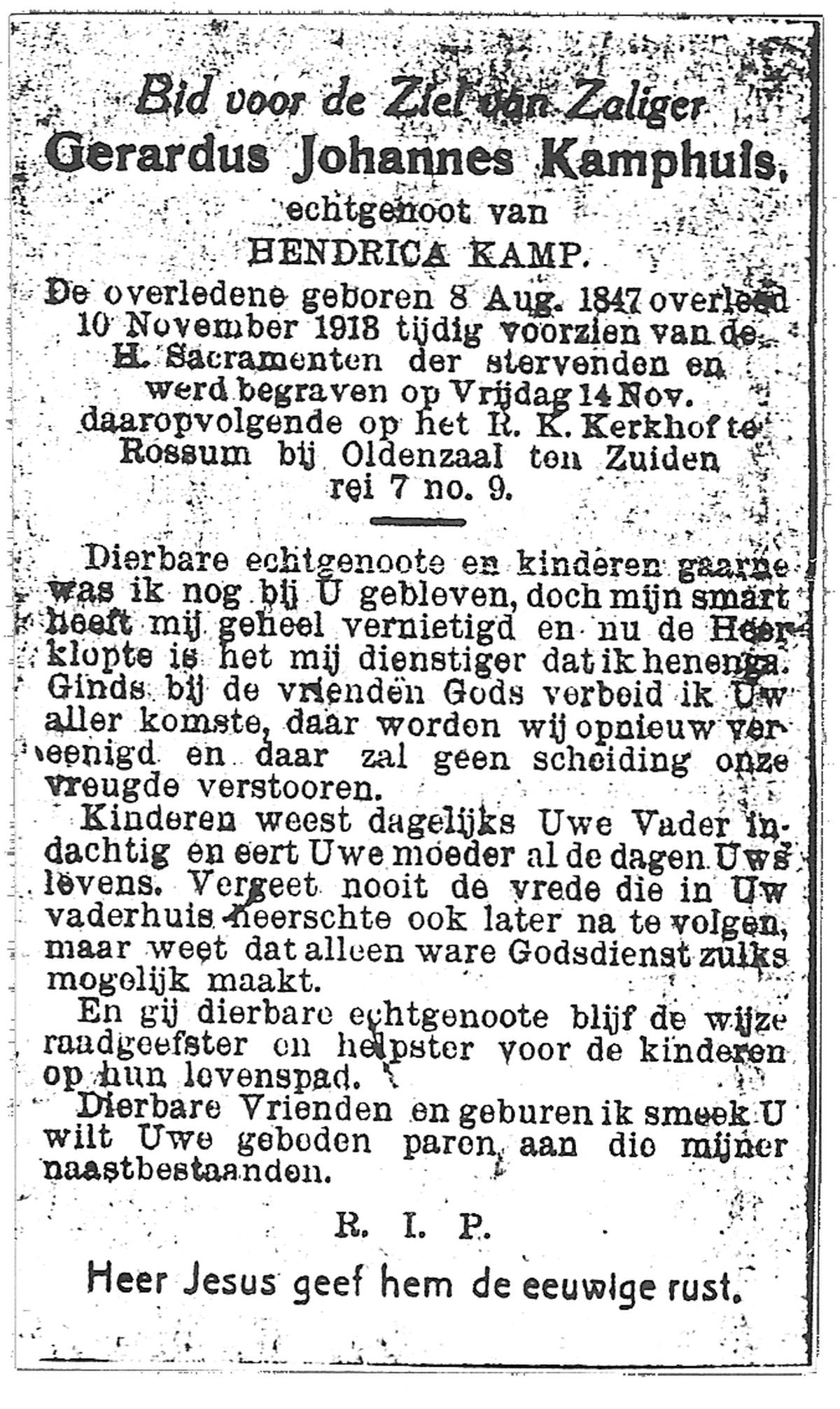 KAMPHUIS, , Jan Hendrik, geboren op 11-6-1918 te Losser, overleden op 7-12-1976 te Oldenzaal op 58-jarige leeftijd, gecremeerd op 11-12-1976 te Rossum.