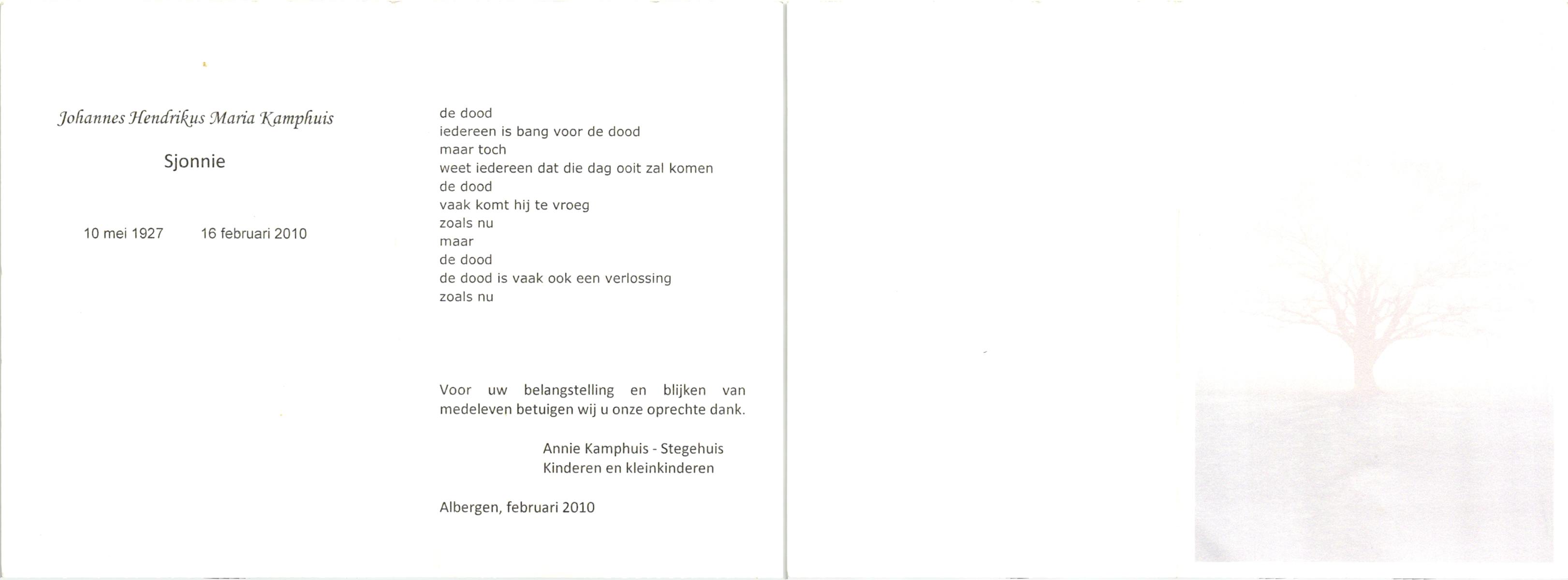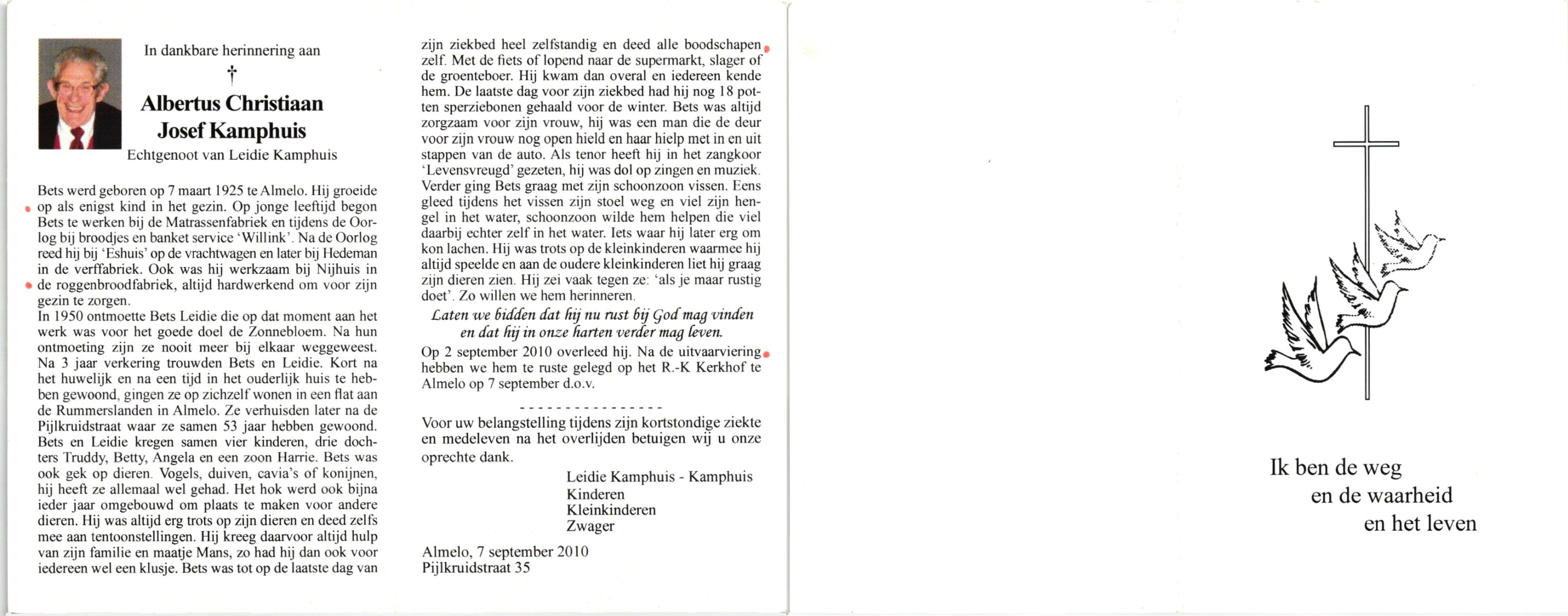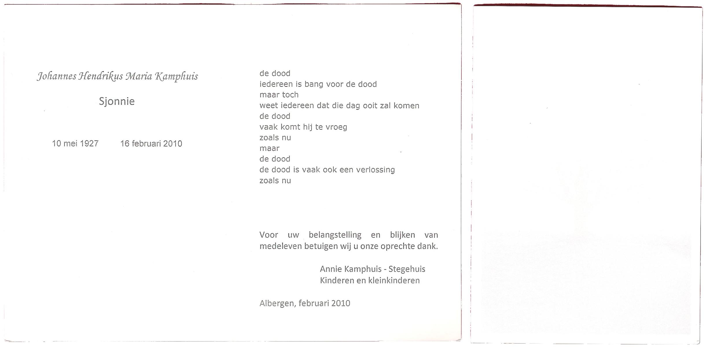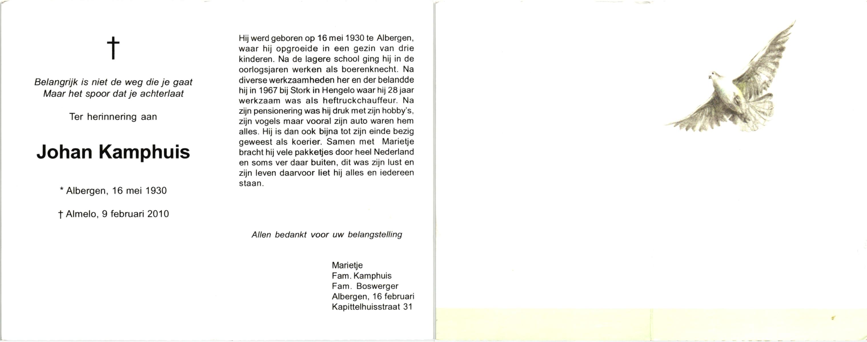 KAMPHUIS, , Johan, geboren op 16-5-1930 te Albergen, overleden op 9-2-2010 te Almelo op 79-jarige leeftijd.