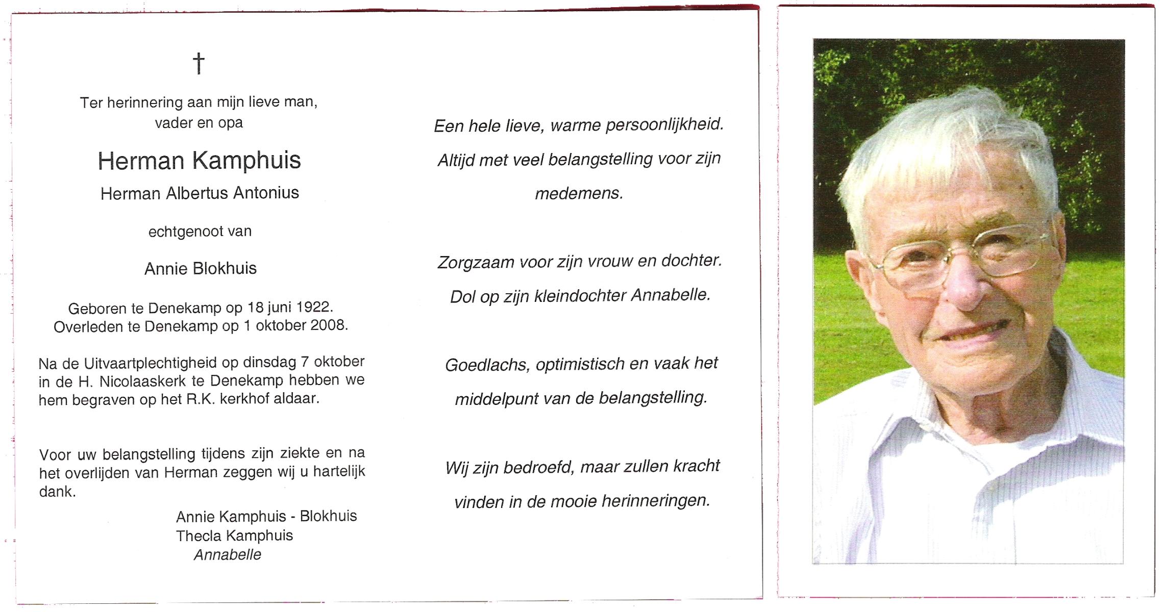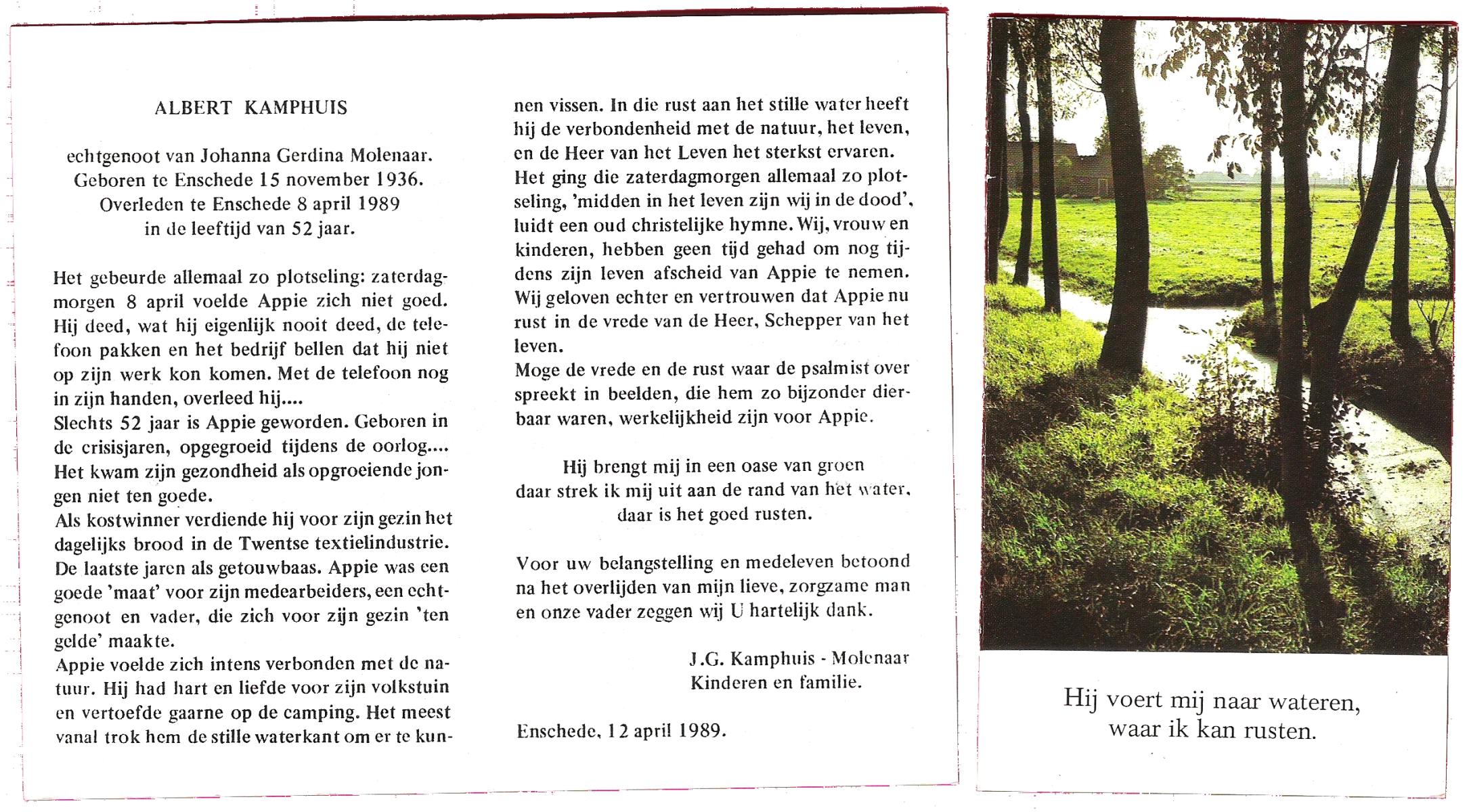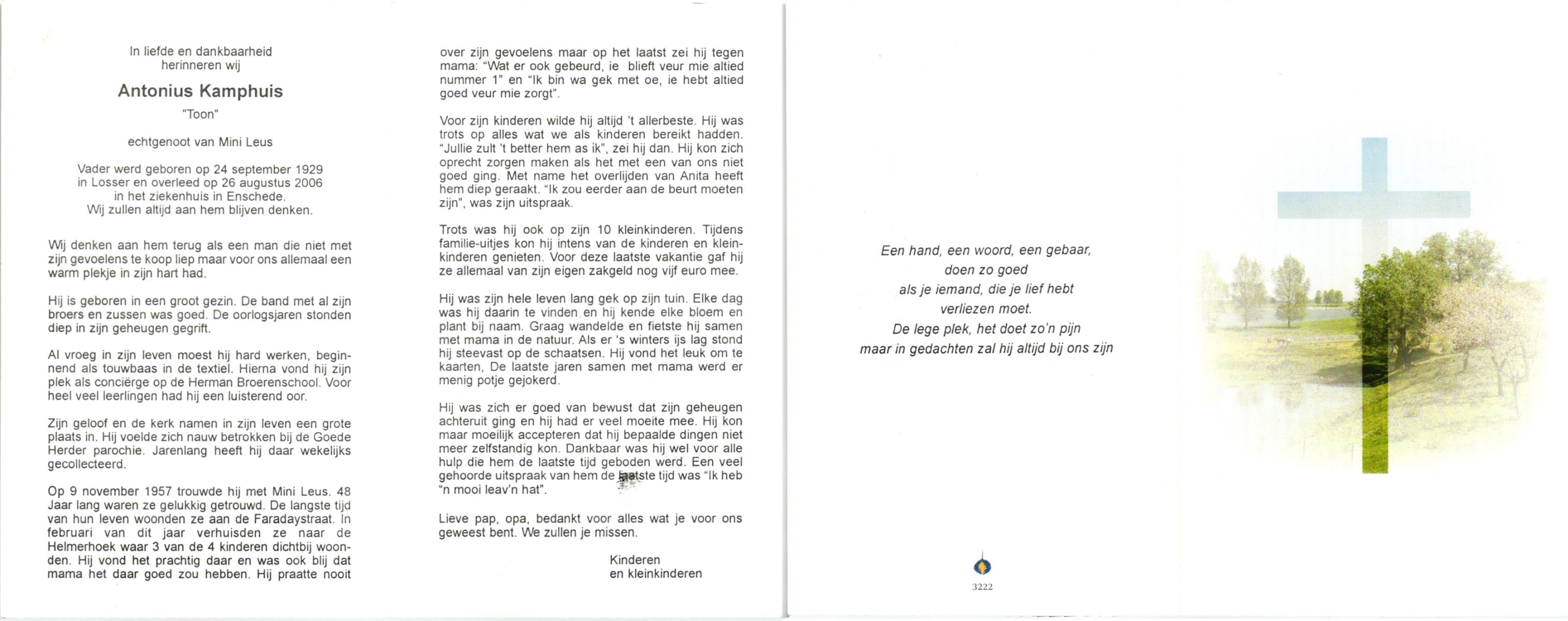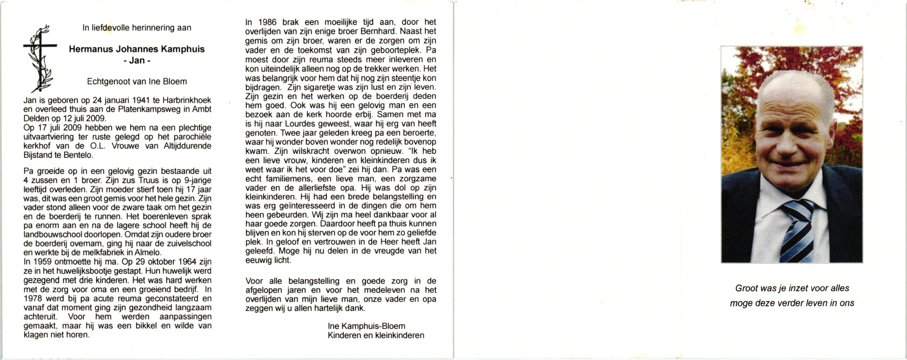 KAMPHUIS, , Johan, geboren op 16-5-1930 te Albergen, overleden op 9-2-2010 te Almelo op 79-jarige leeftijd.