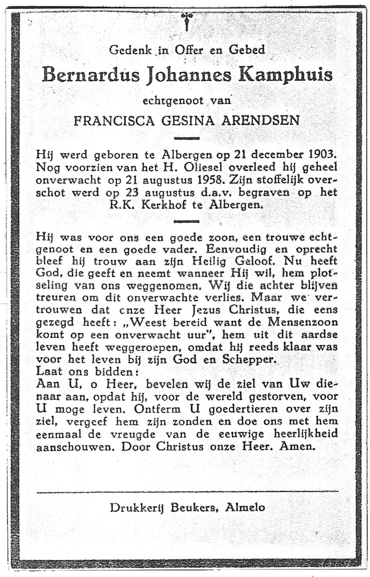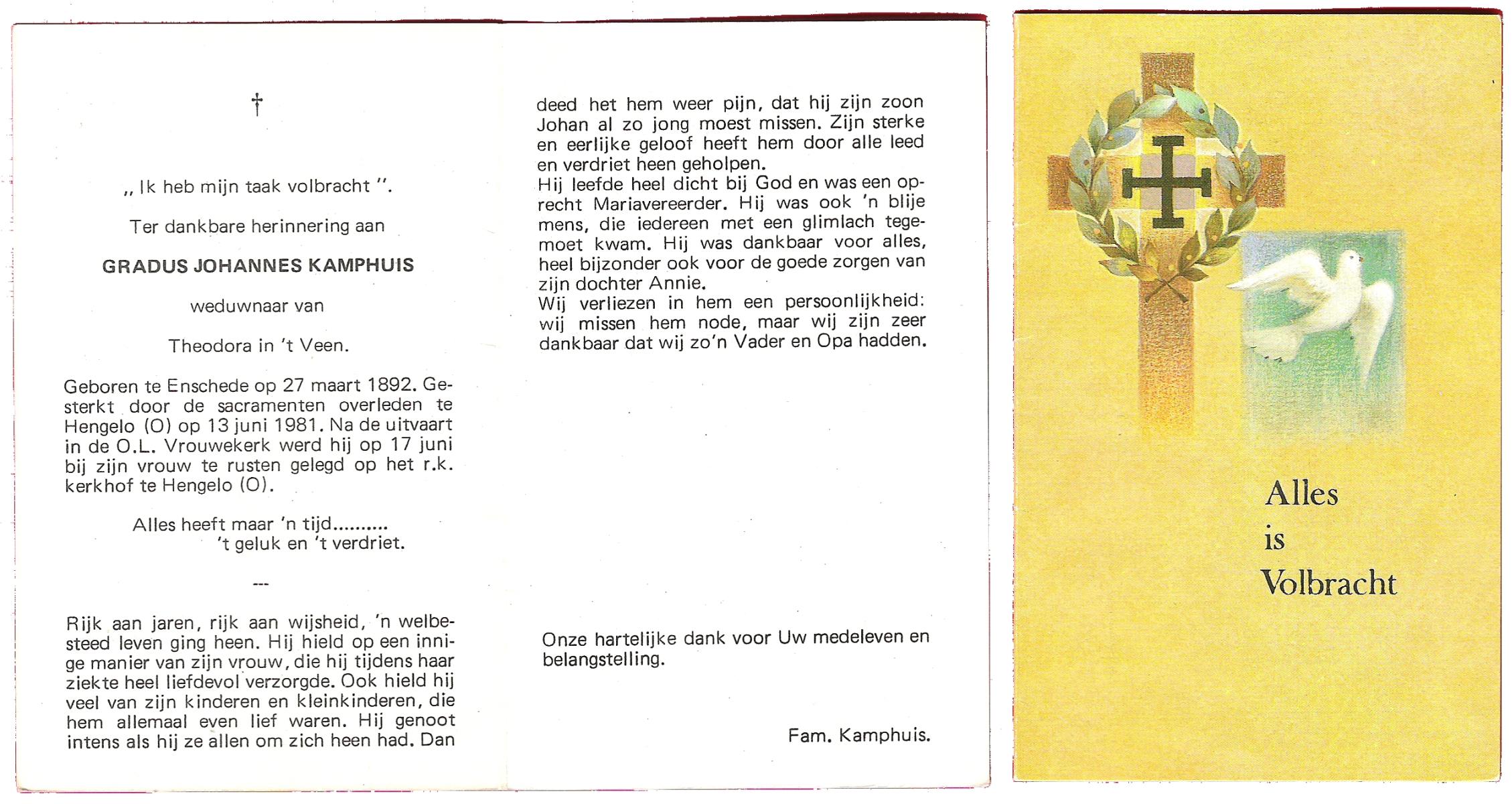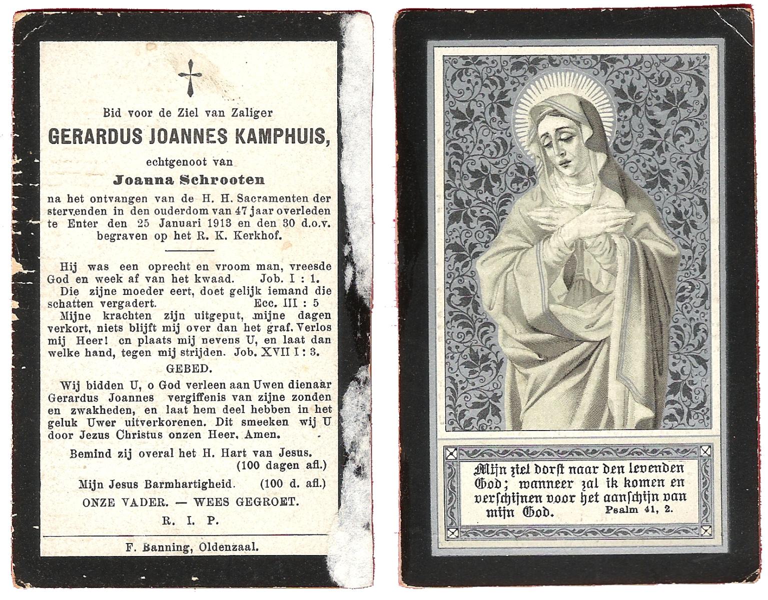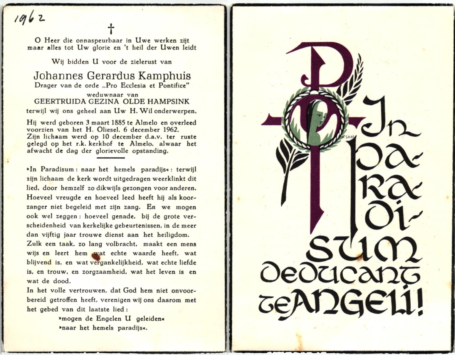 KAMPHUIS, , Johannes Gerardus, geboren op 03-03-1885 te Almelo, overleden op 6-12-1962 op 77-jarige leeftijd, begraven op 10-12-1962 te Almelo.