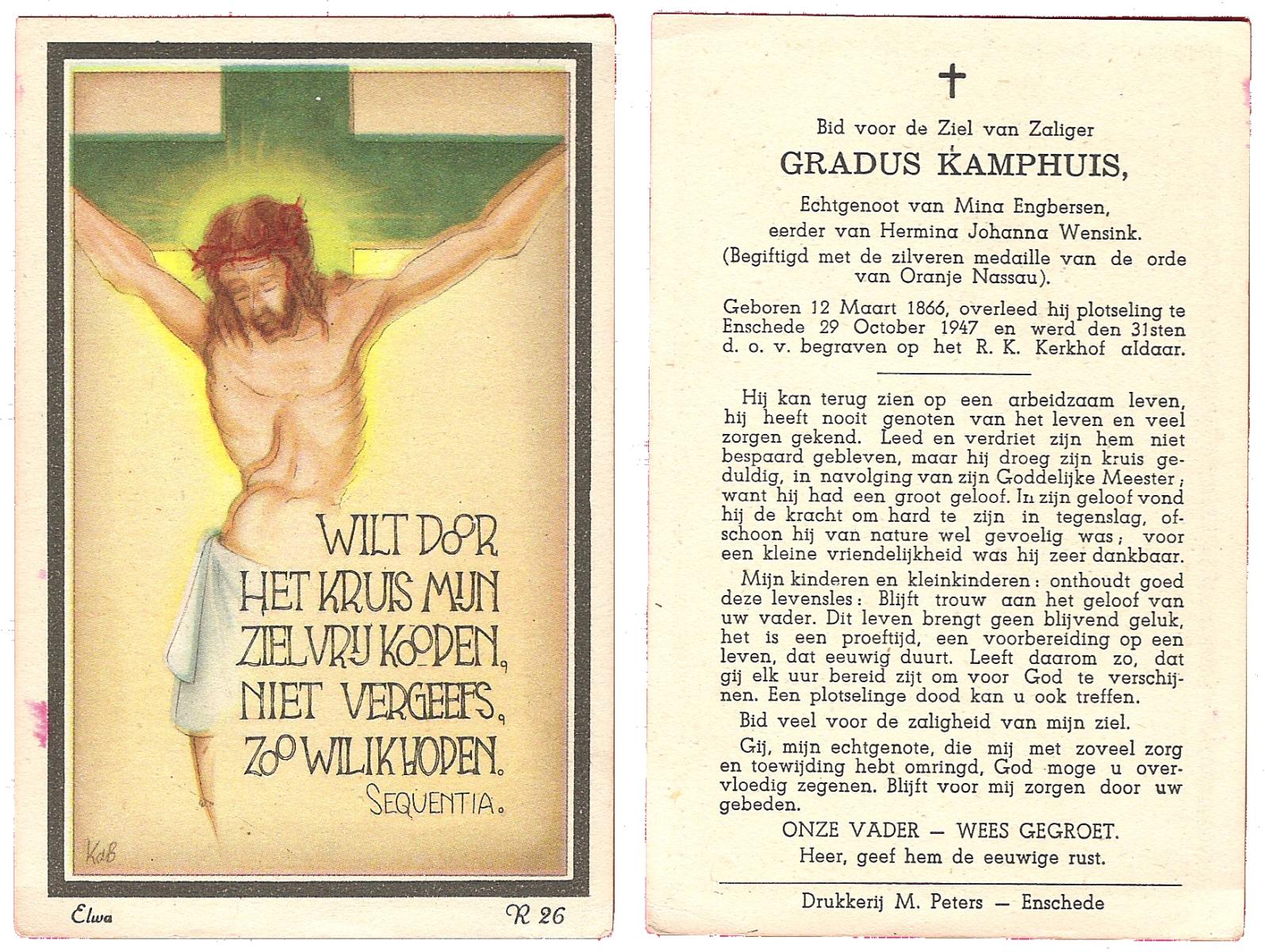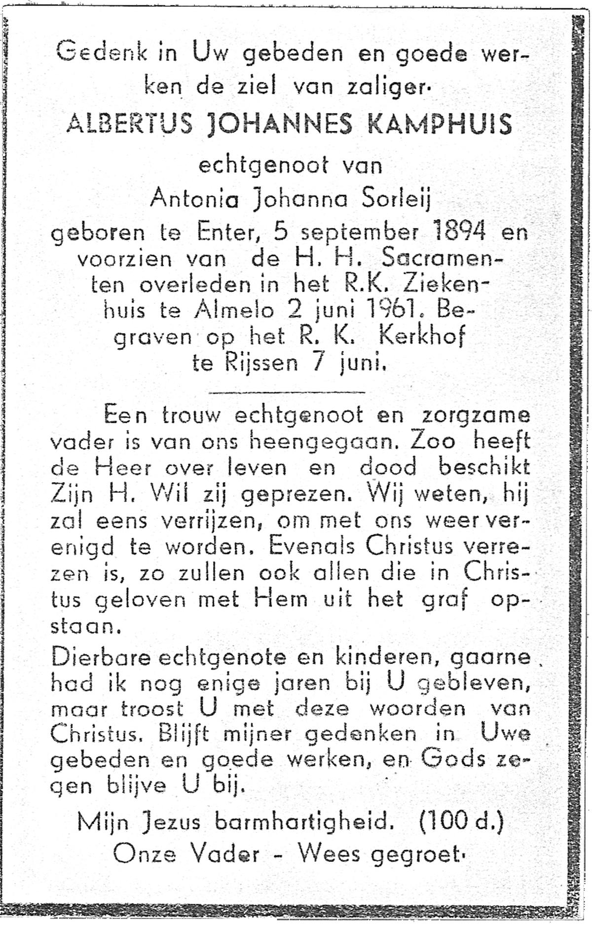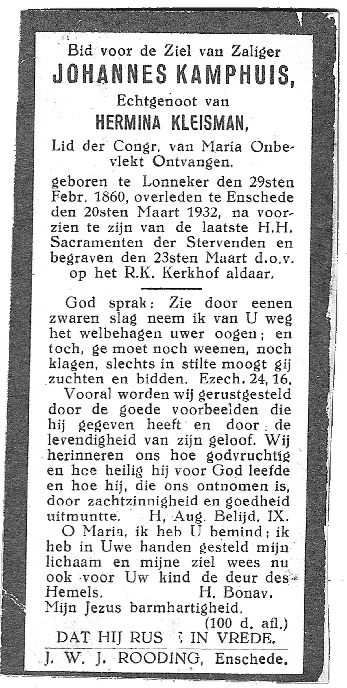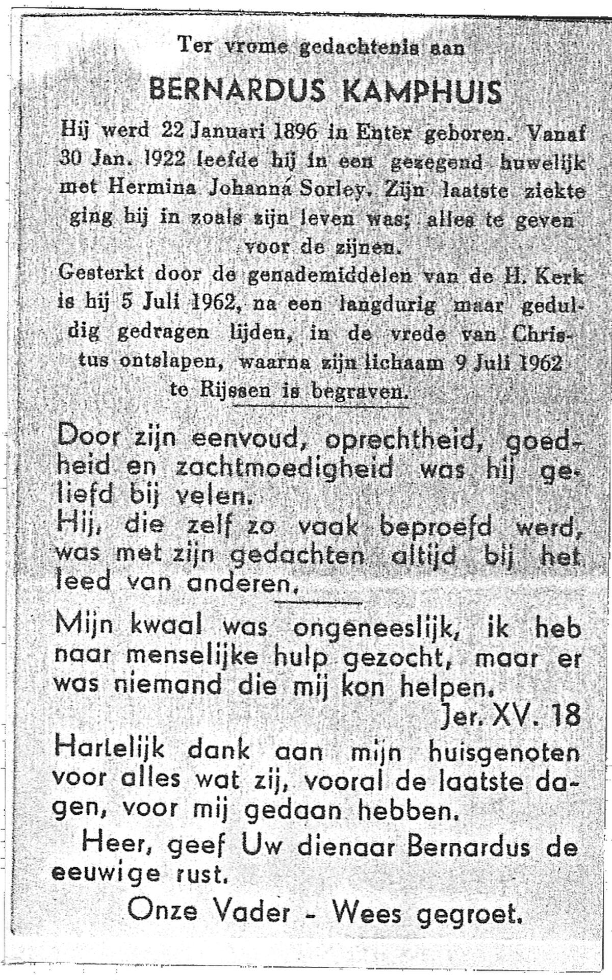 KAMPHUIS, , Johannes Gerardus, geboren op 03-03-1885 te Almelo, overleden op 6-12-1962 op 77-jarige leeftijd, begraven op 10-12-1962 te Almelo.