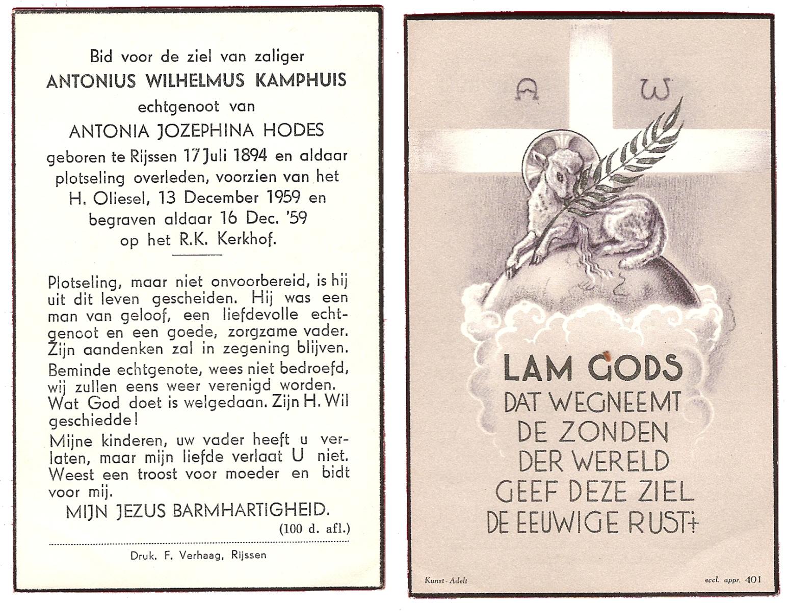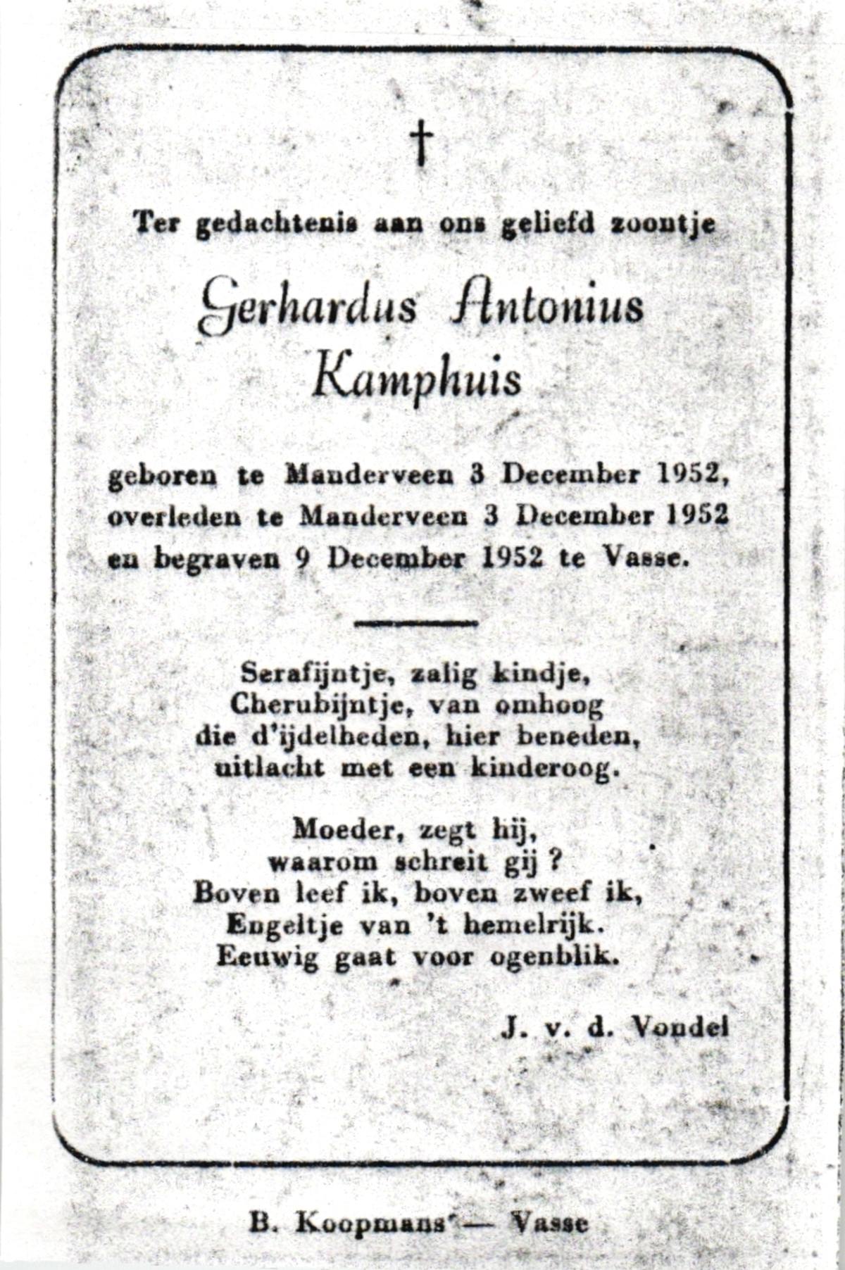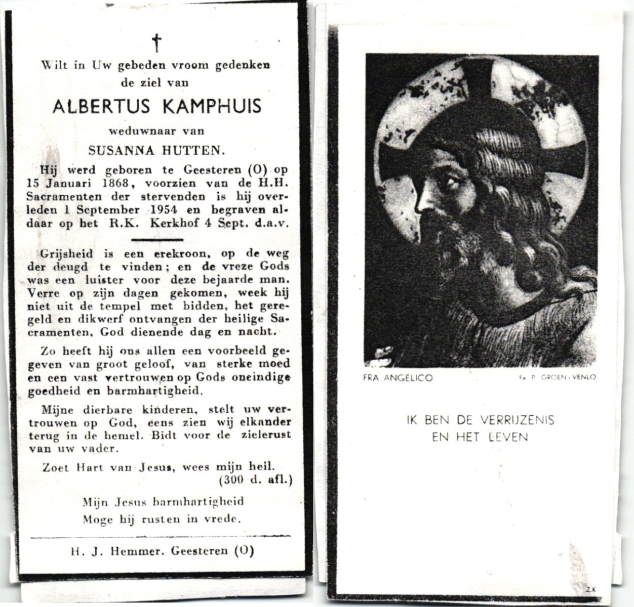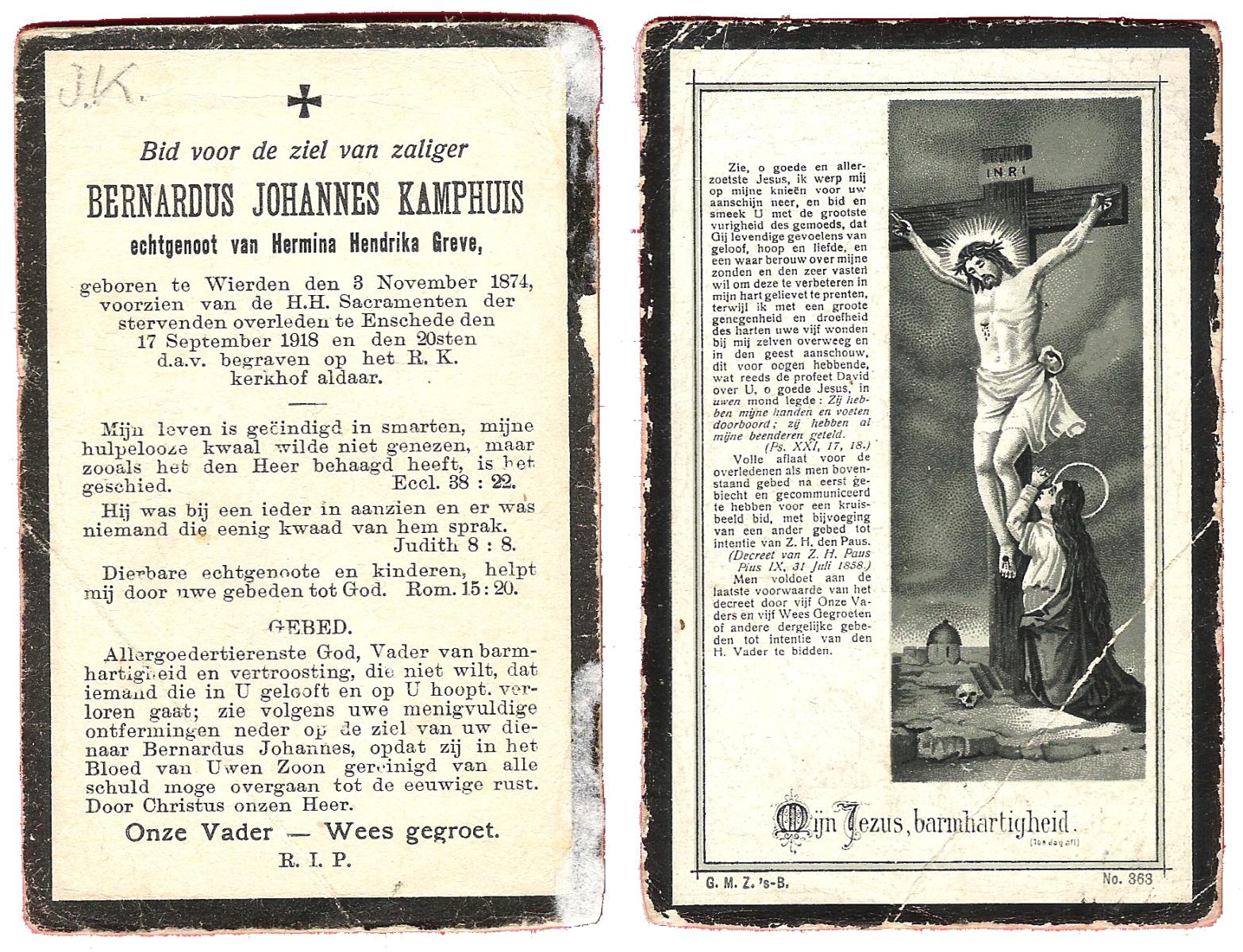 KAMPHUIS, , Johannes Gerardus, geboren op 03-03-1885 te Almelo, overleden op 6-12-1962 op 77-jarige leeftijd, begraven op 10-12-1962 te Almelo.