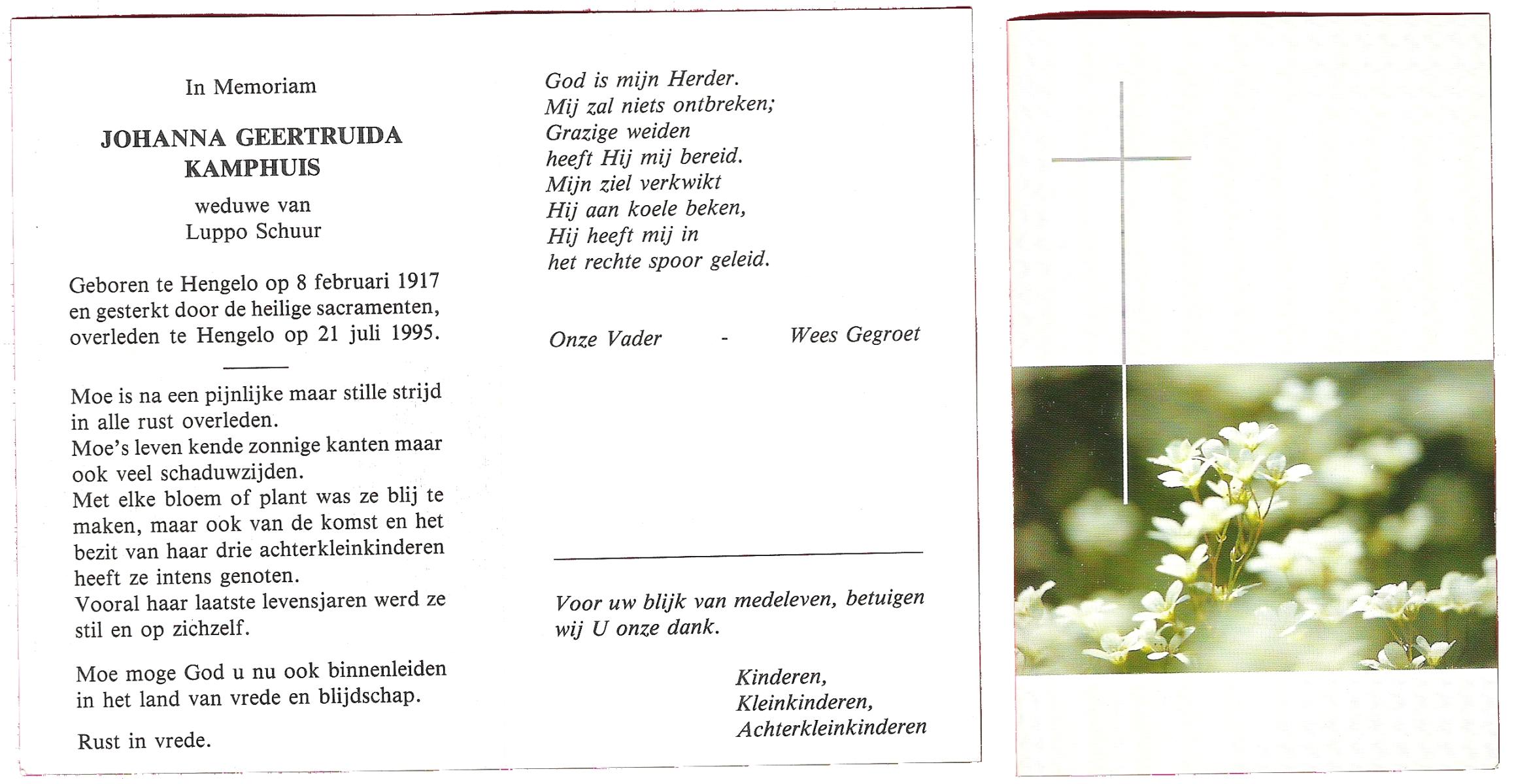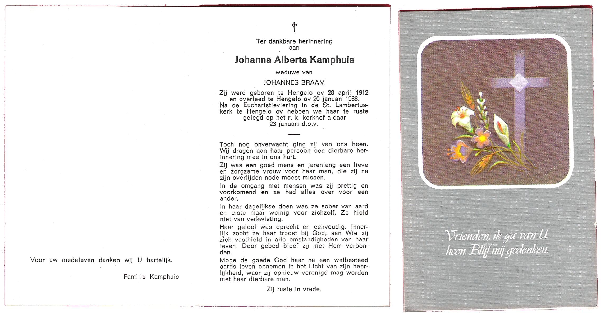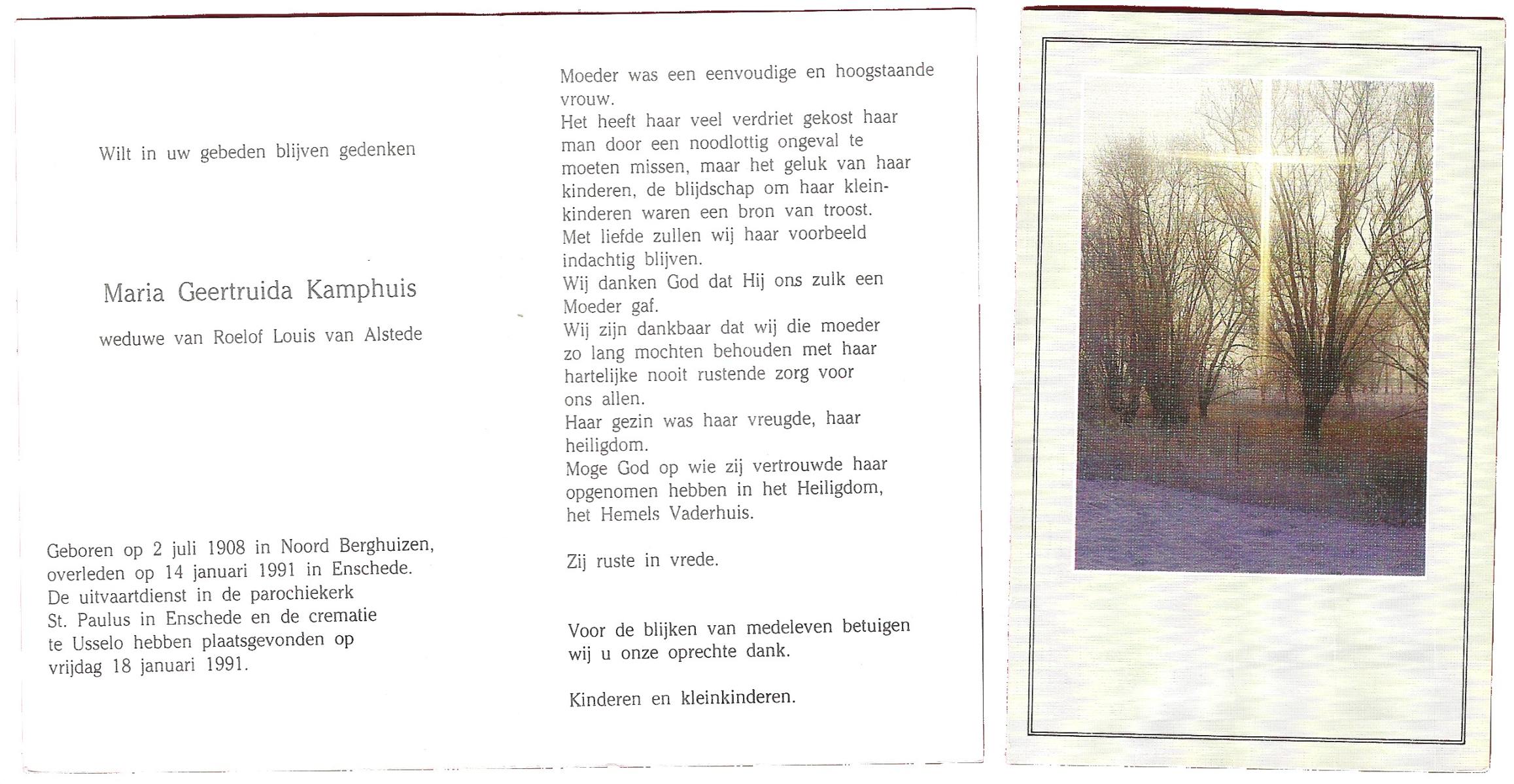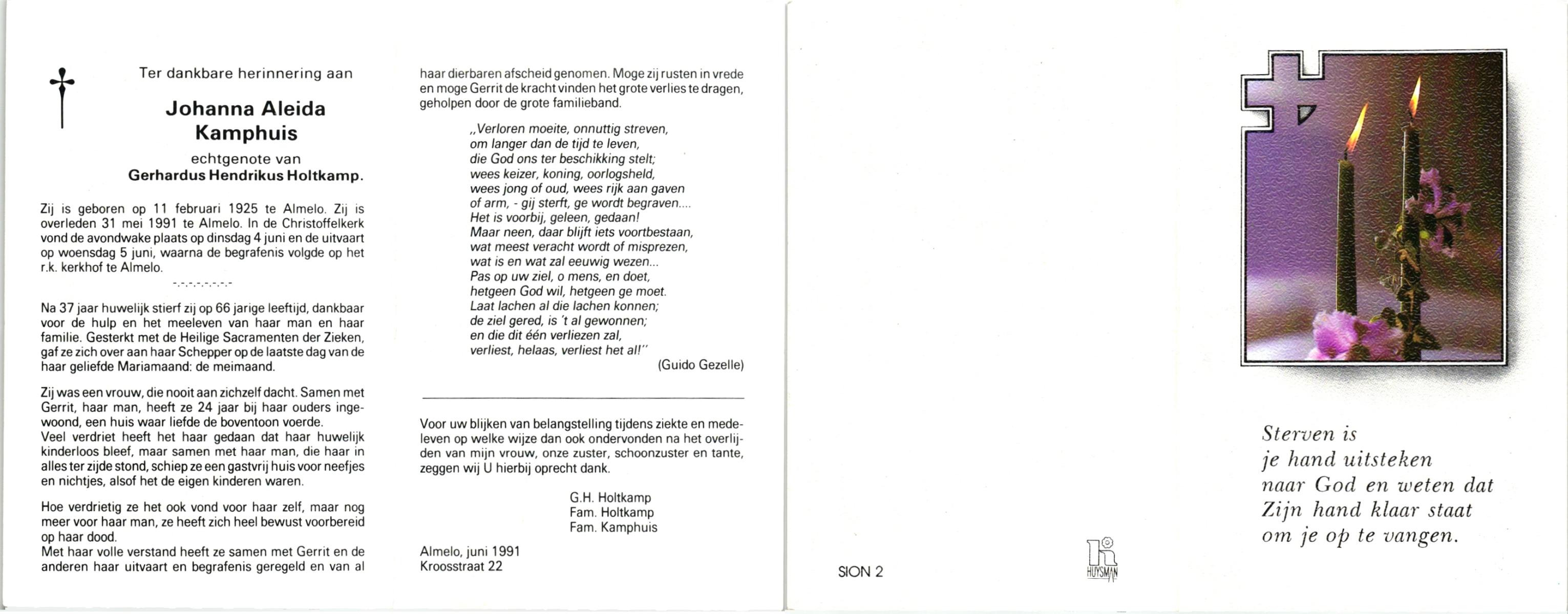 KAMPHUIS, , Johanna Aleida, geboren op 11-2-1925 te Almelo, overleden op 31-5-1991 te Almelo op 66-jarige leeftijd, begraven op 5-6-1991 te Almelo.