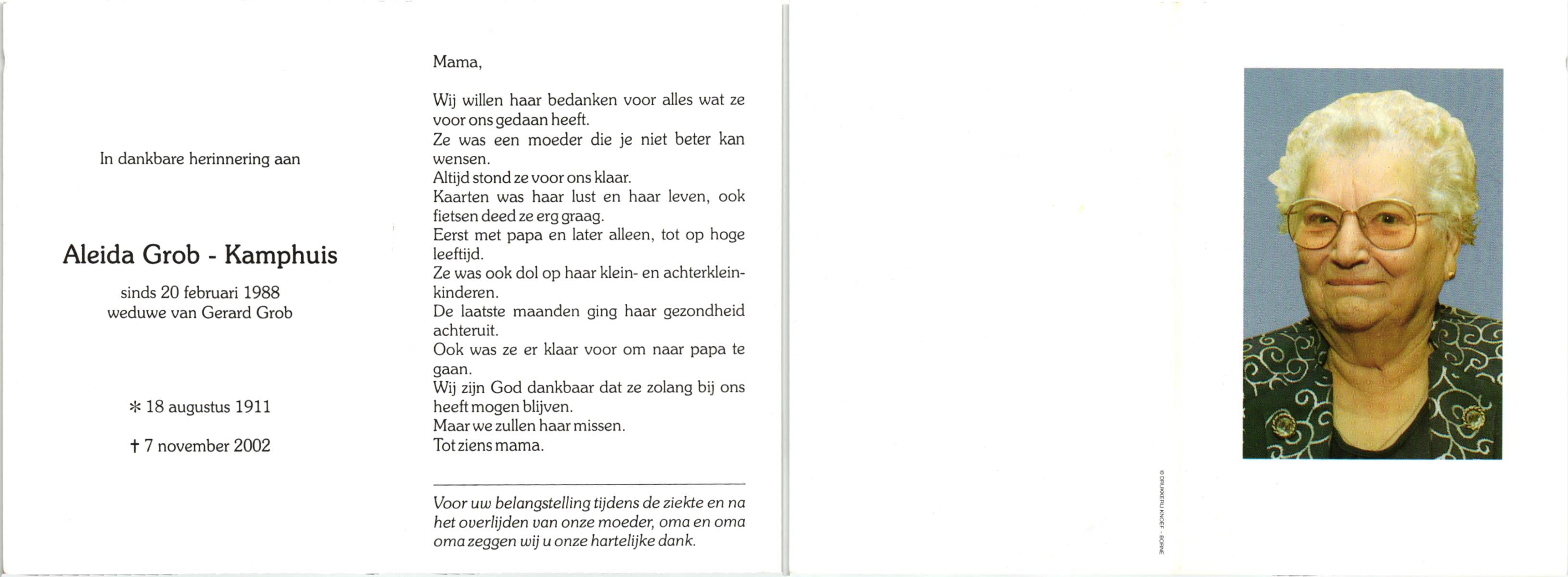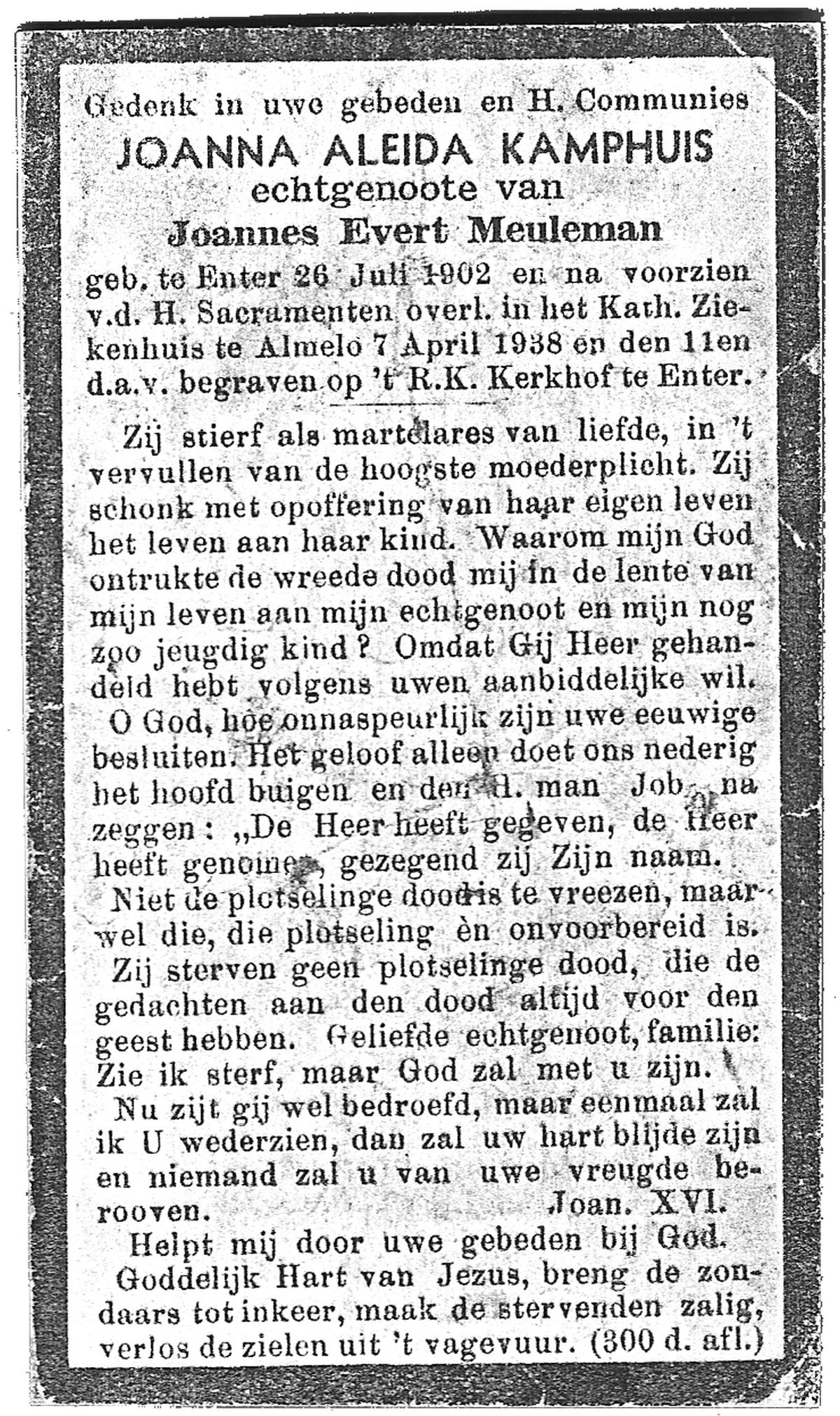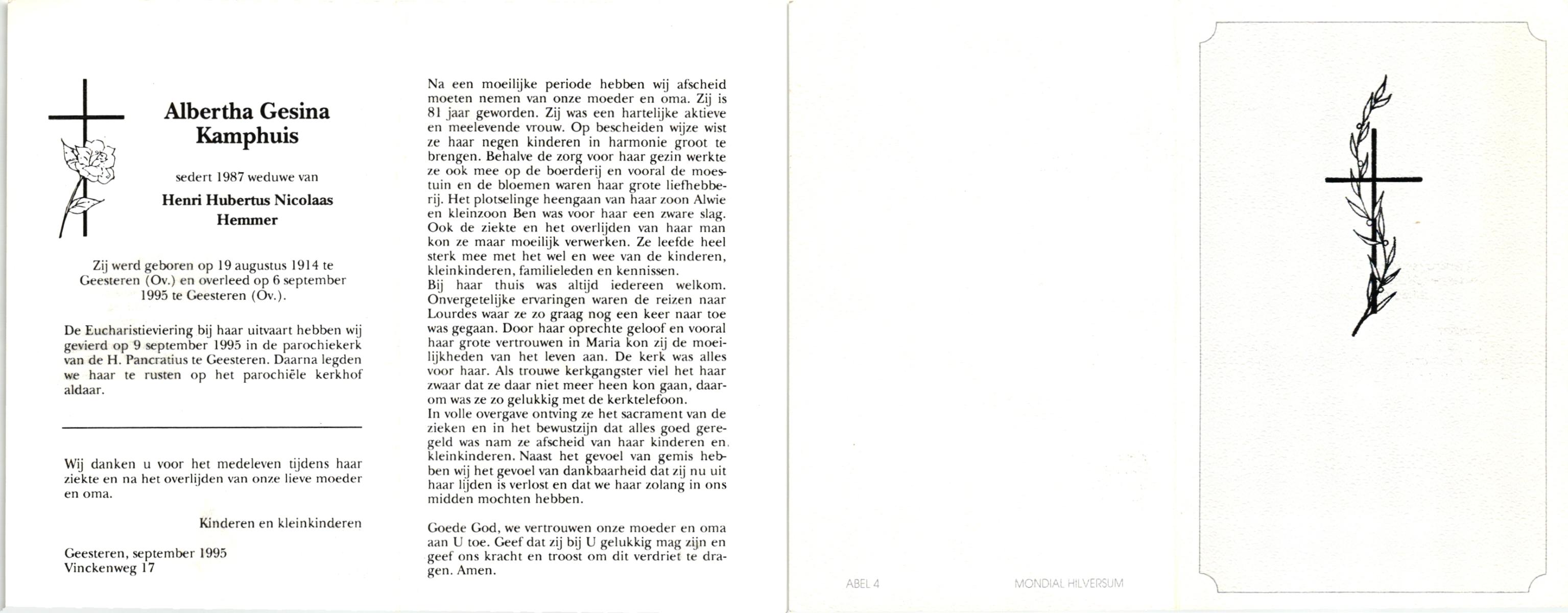 KAMPHUIS, , Johanna Aleida, geboren op 11-2-1925 te Almelo, overleden op 31-5-1991 te Almelo op 66-jarige leeftijd, begraven op 5-6-1991 te Almelo.