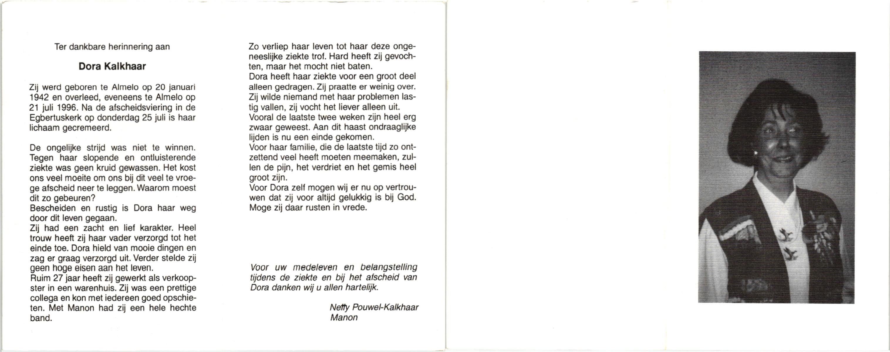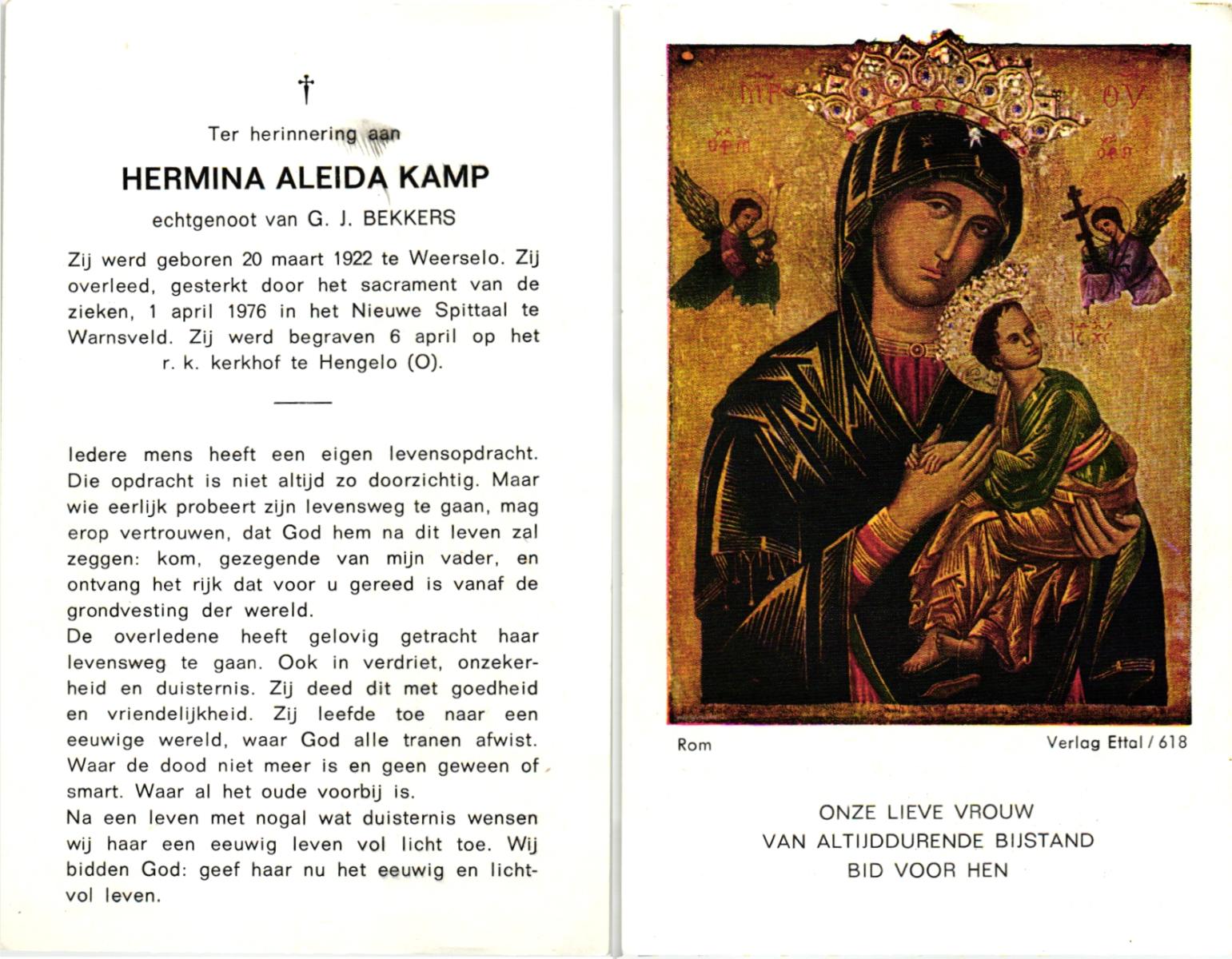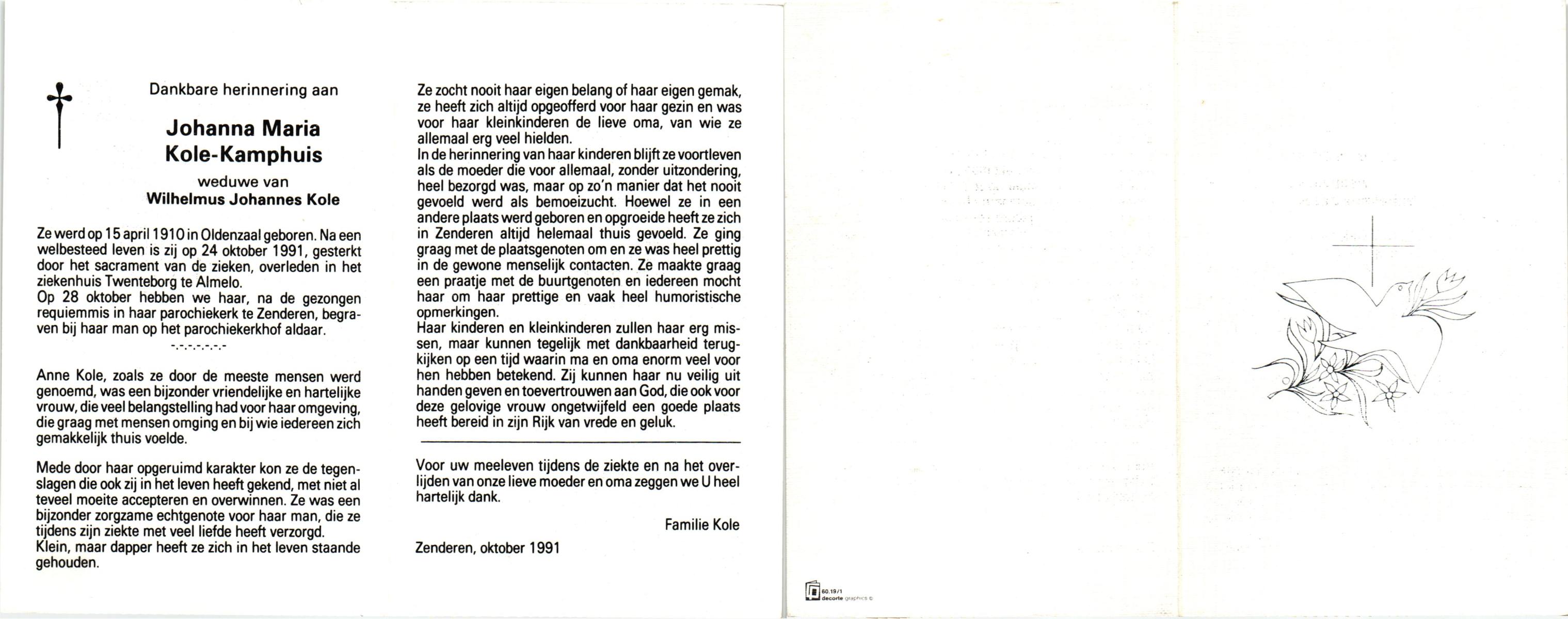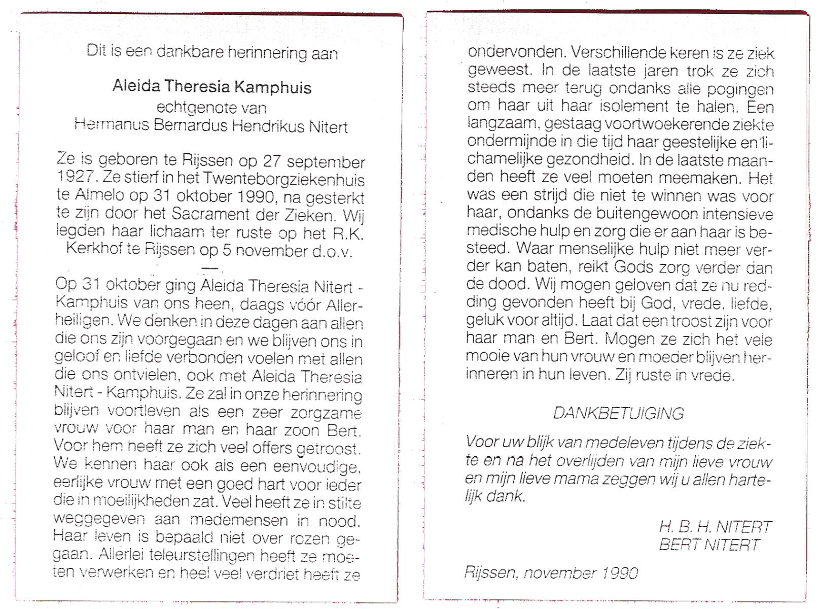 KAMPHUIS, , Johanna Aleida, geboren op 11-2-1925 te Almelo, overleden op 31-5-1991 te Almelo op 66-jarige leeftijd, begraven op 5-6-1991 te Almelo.
