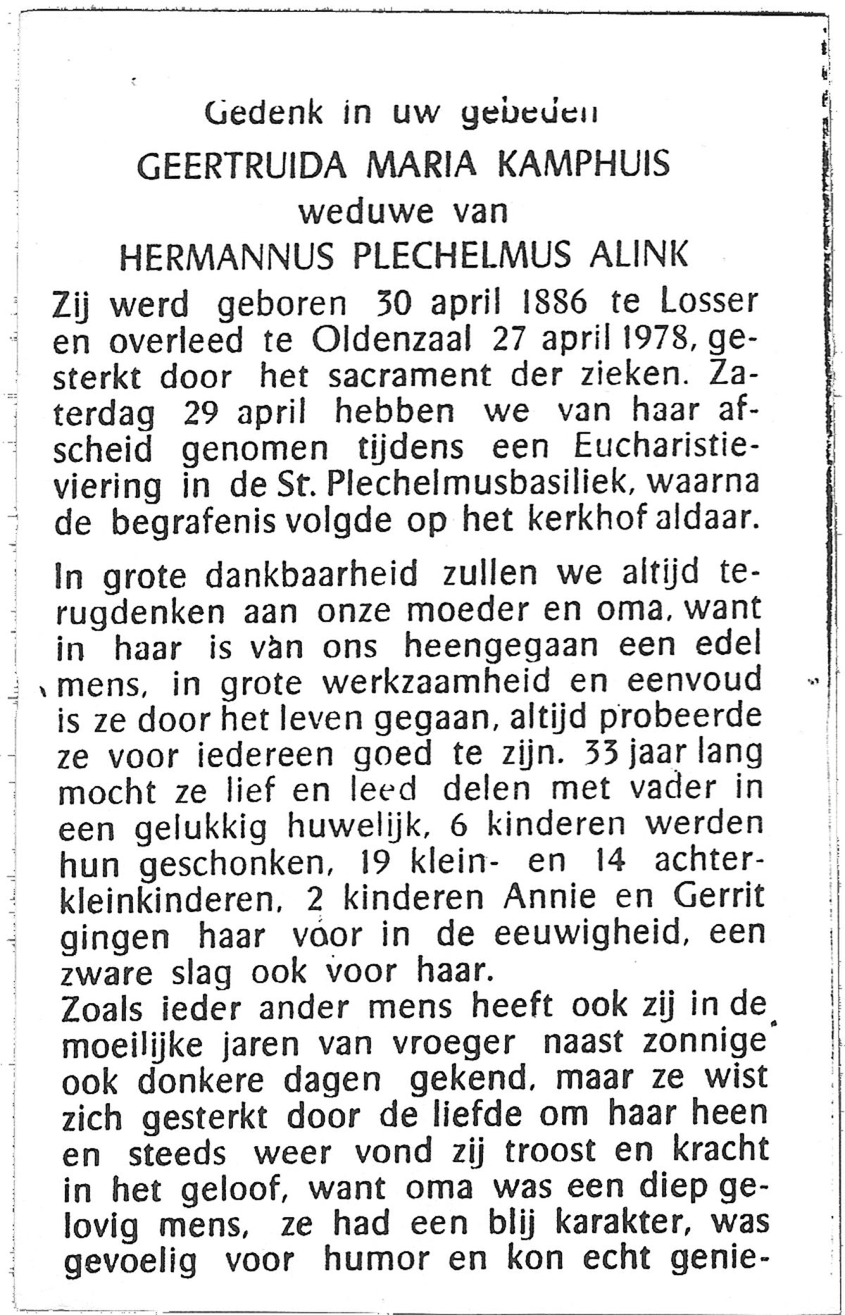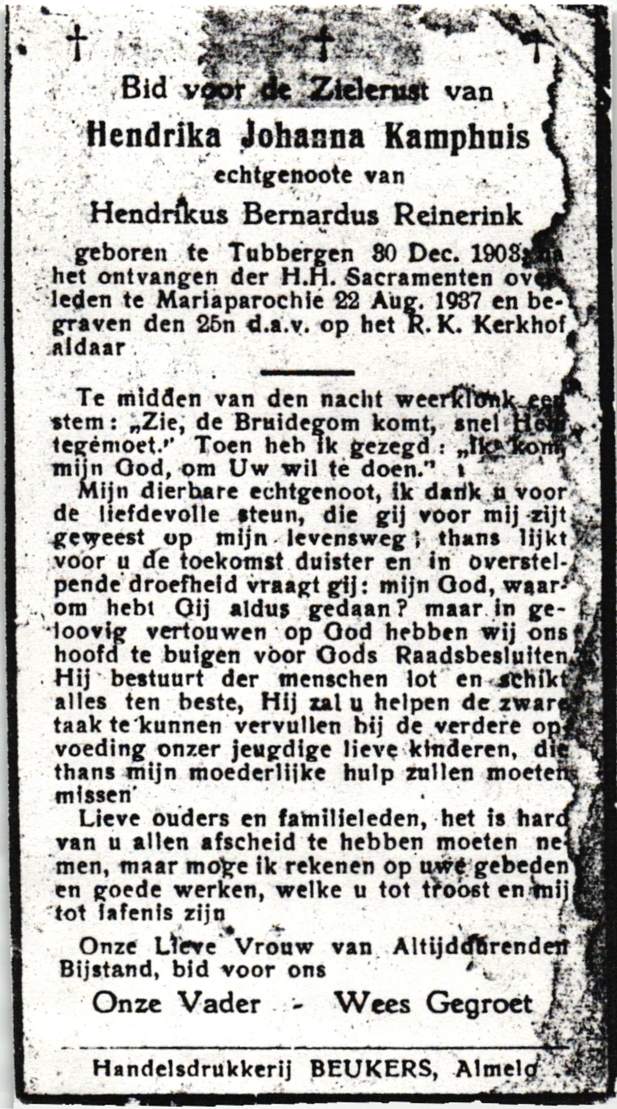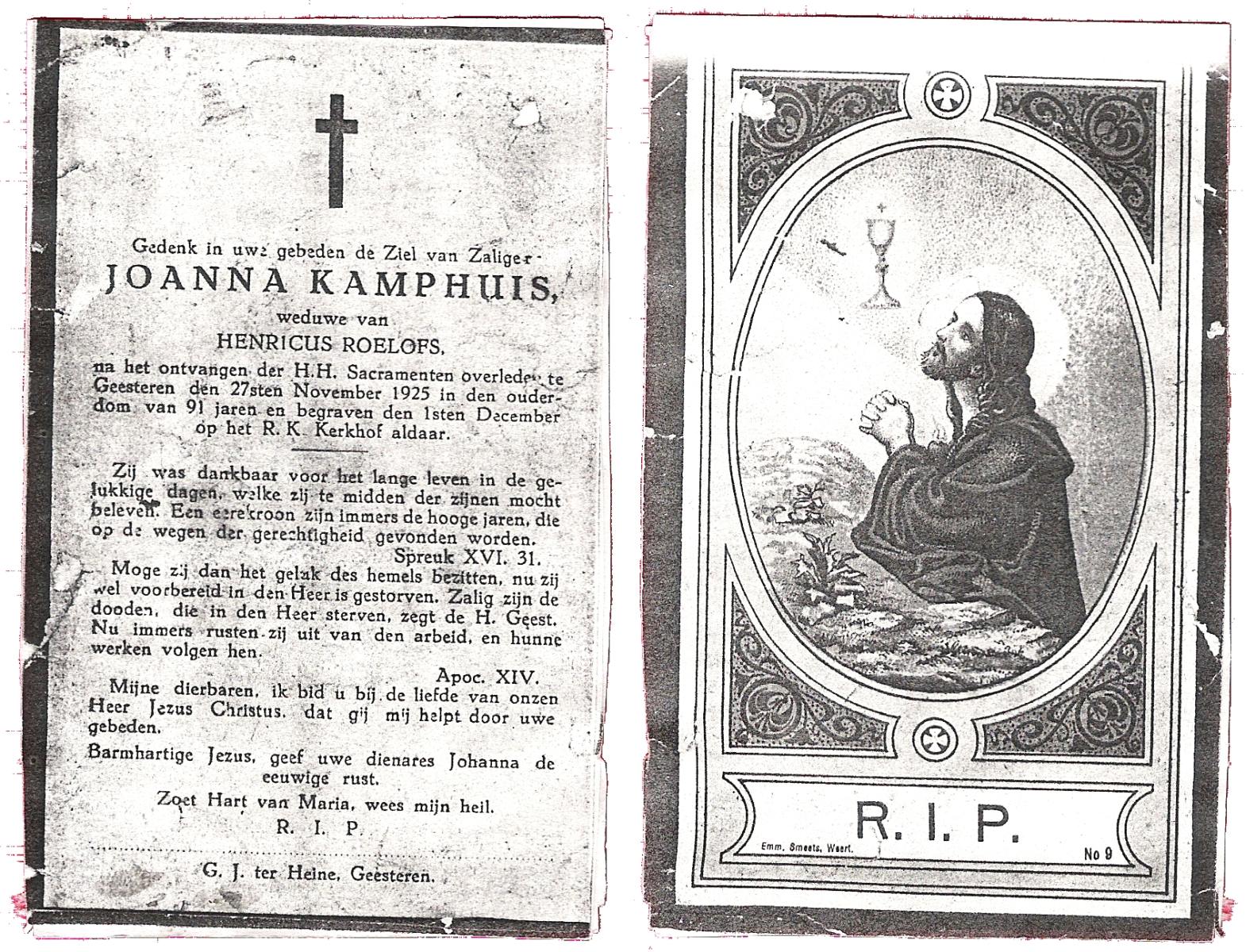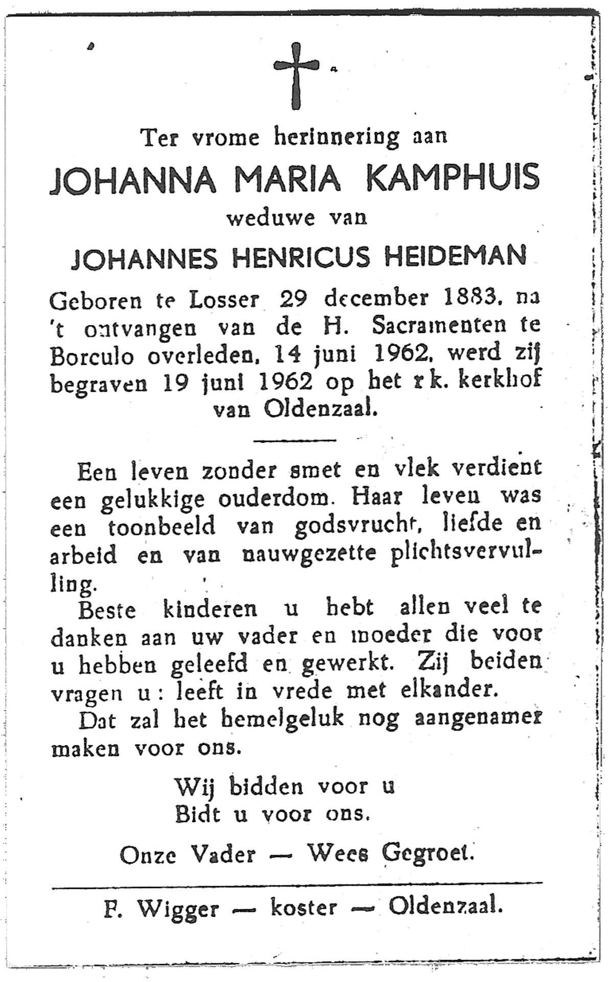 KAMPHUIS, , Johanna Hendrika, geboren op 14-04-1891 te Haarle, Reutum, overleden op 1-6-1977 op 86-jarige leeftijd, begraven op 4-6-1977 te Borne.