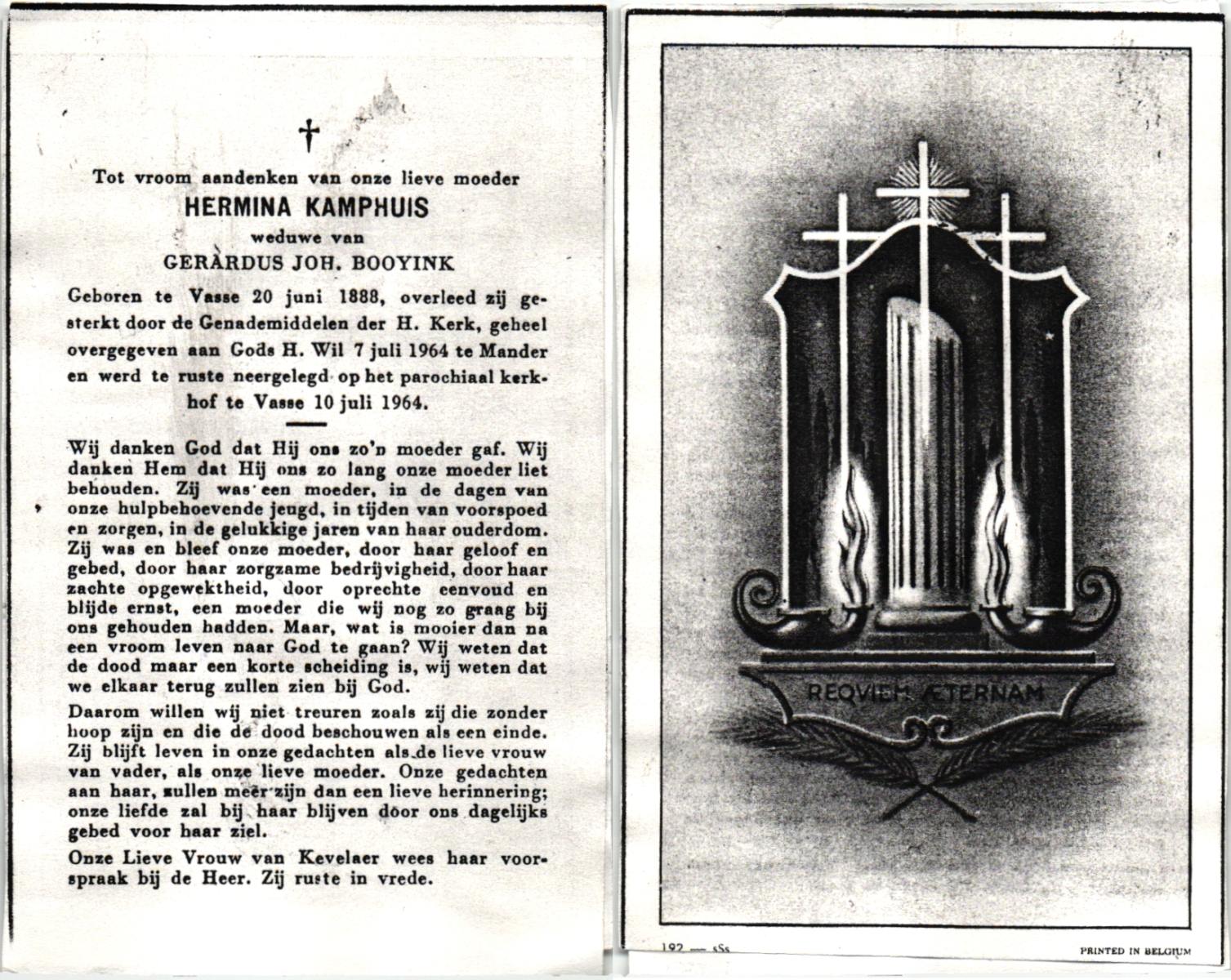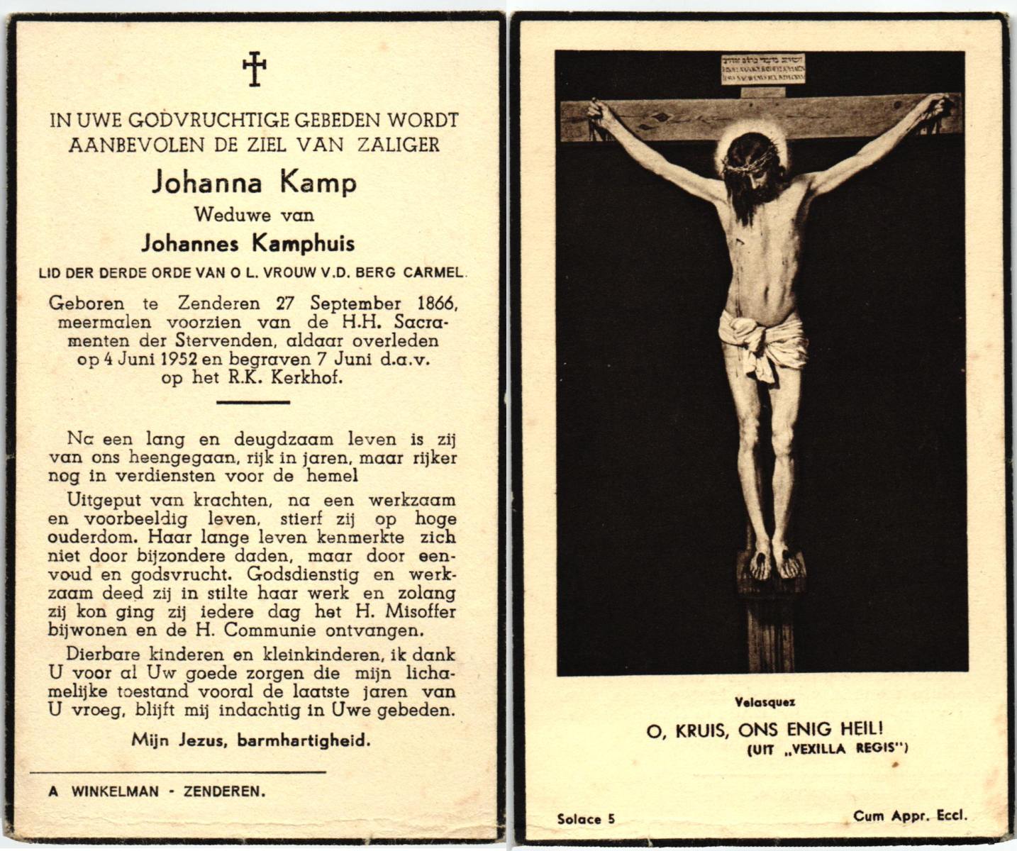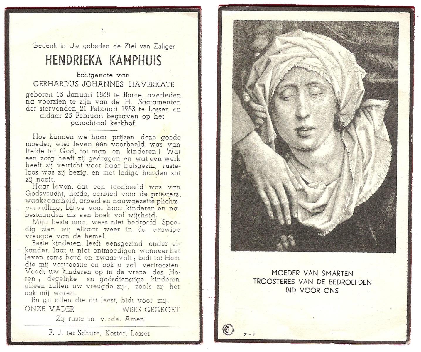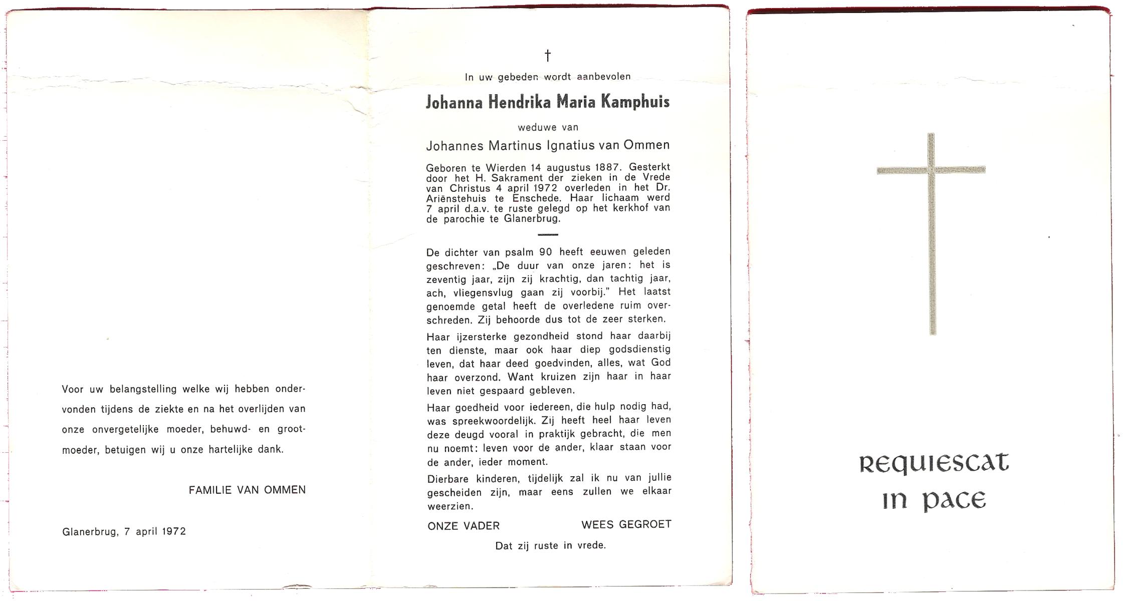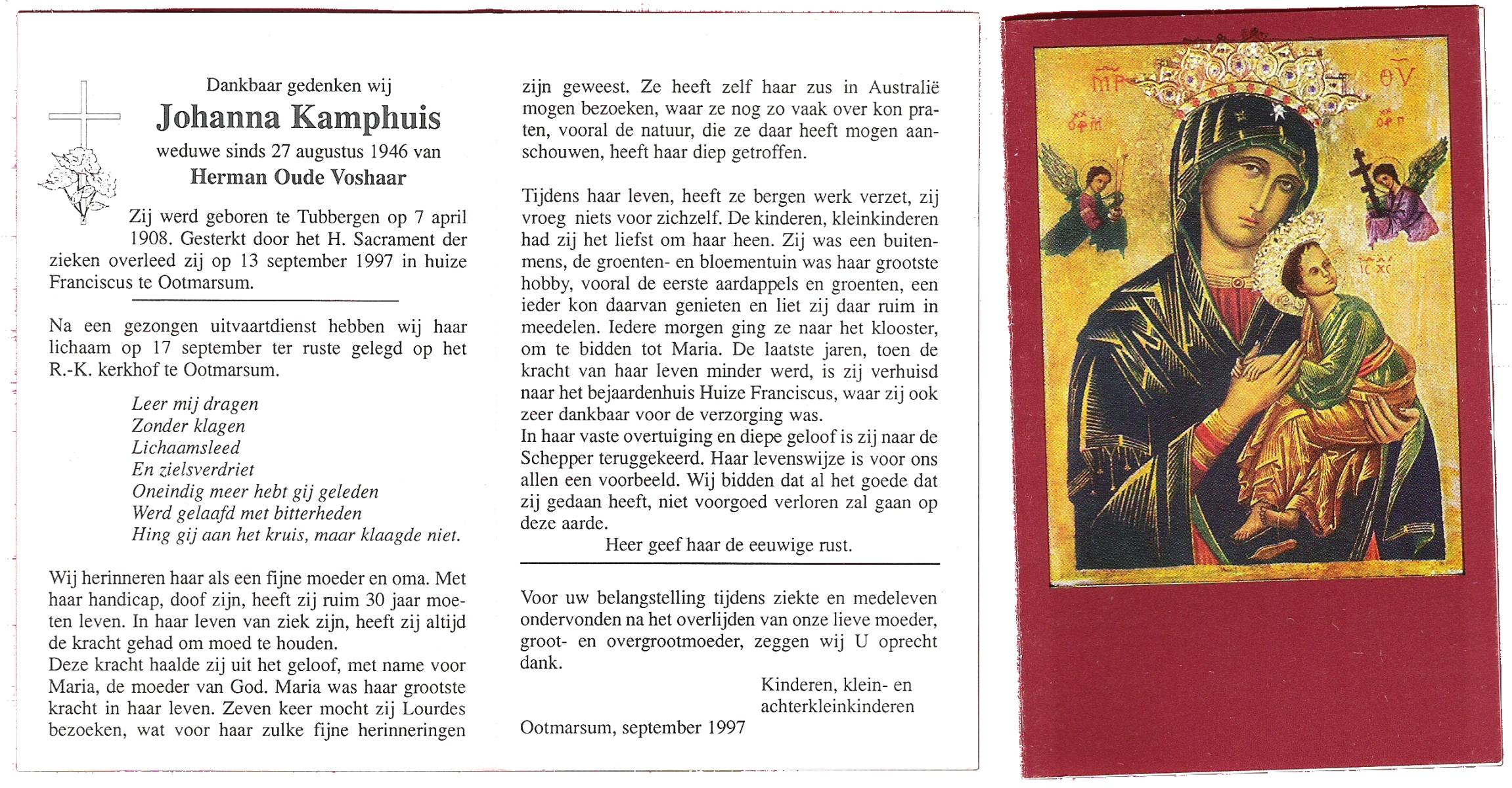 KAMPHUIS, , Johanna Hendrika, geboren op 14-04-1891 te Haarle, Reutum, overleden op 1-6-1977 op 86-jarige leeftijd, begraven op 4-6-1977 te Borne.