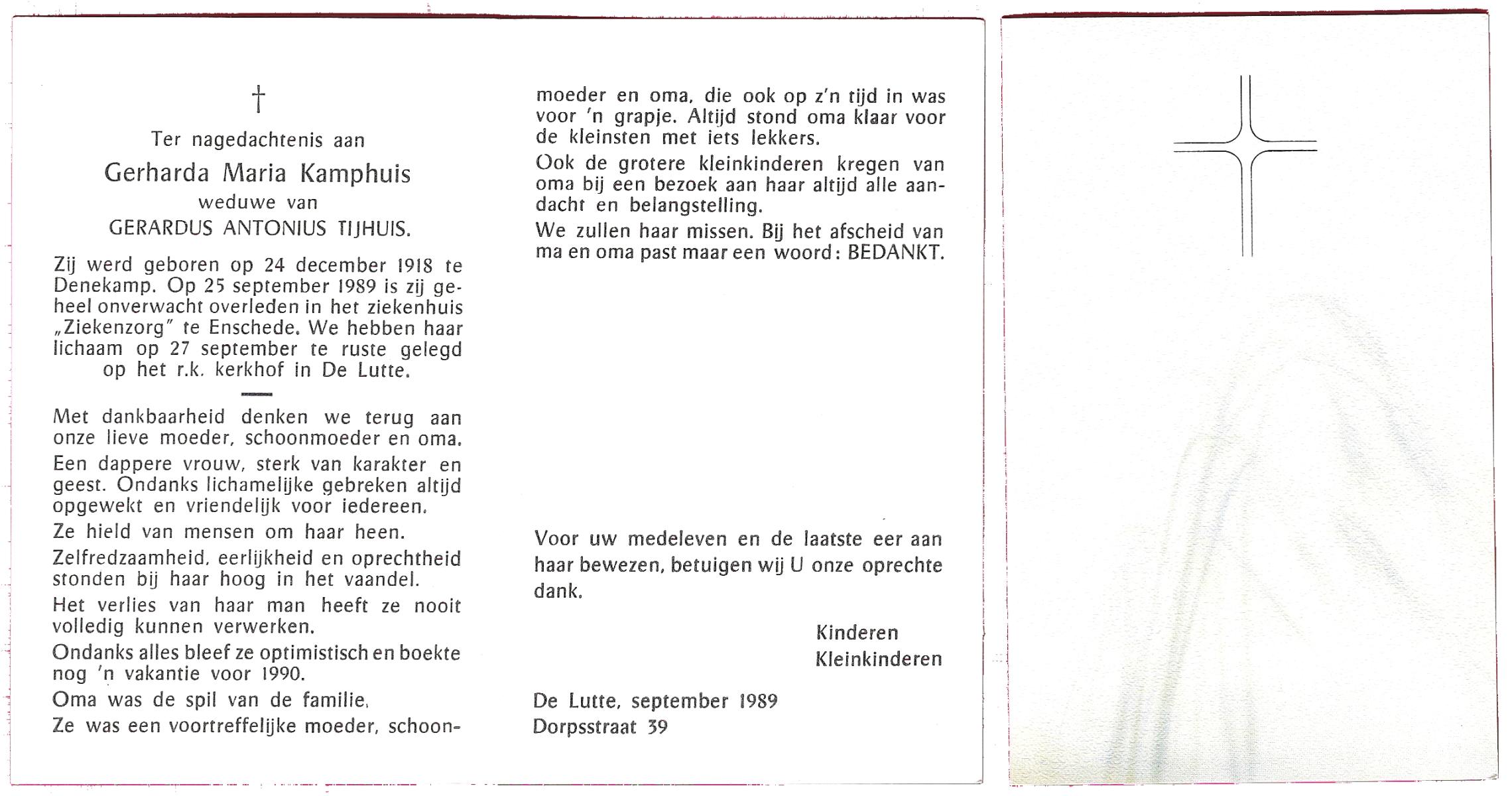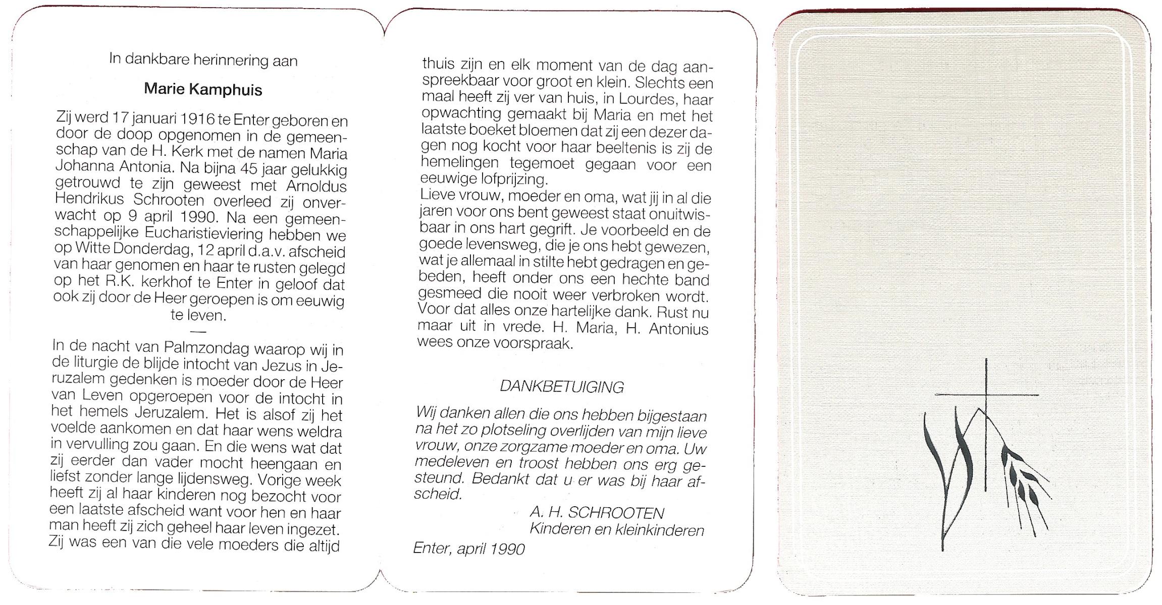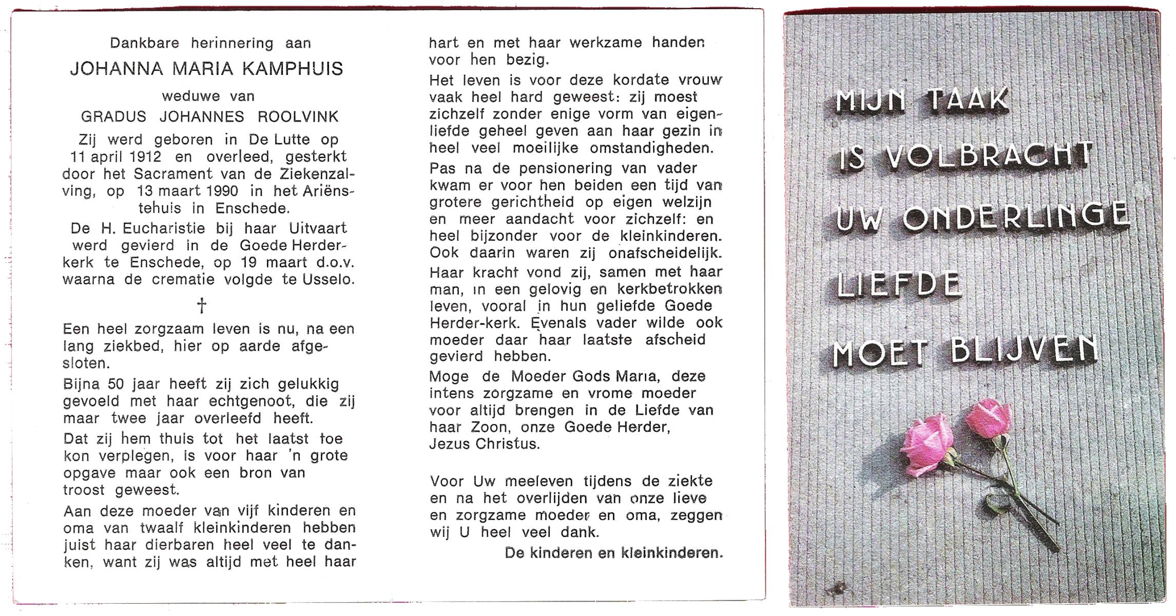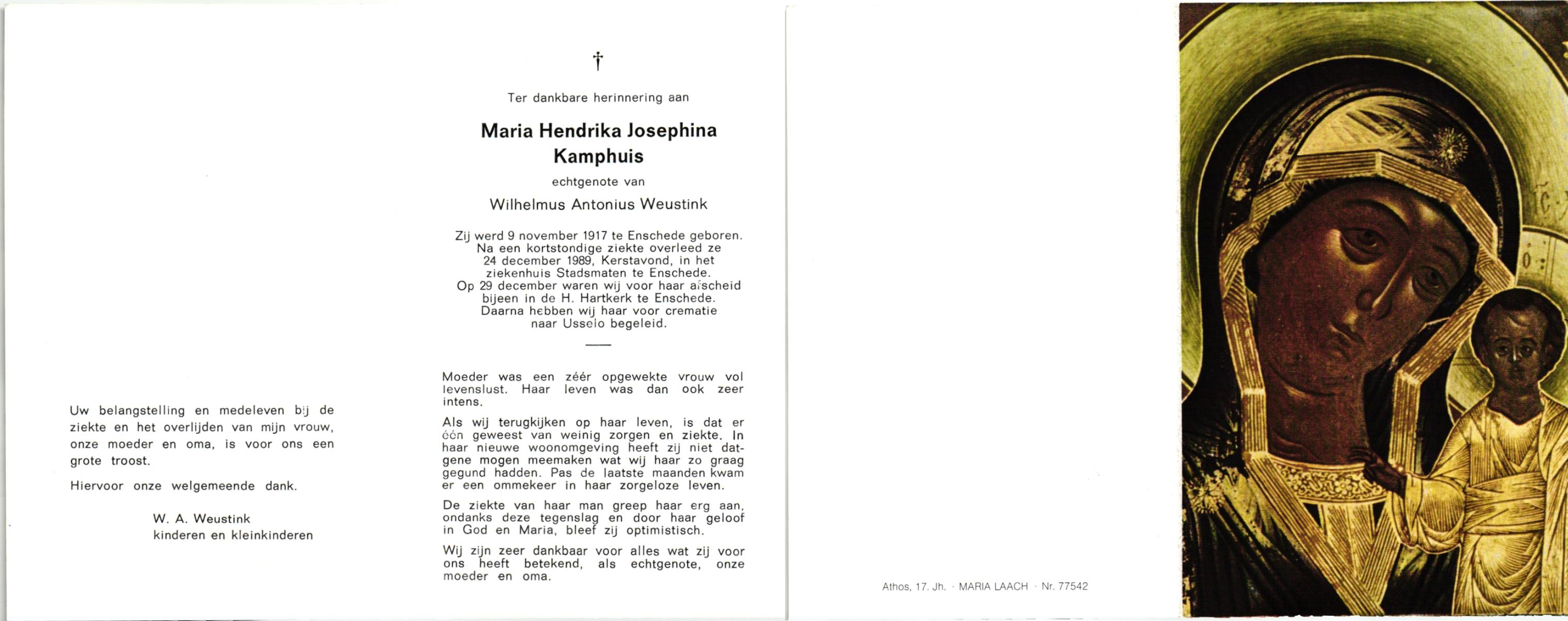 KAMPHUIS, , Maria Hendrika Josephina, geboren op 9-1-1917 te Enschede, overleden op 24-12-1989 te Enschede op 71-jarige leeftijd, gecremeerd op 29-12-1989 te Usselo.