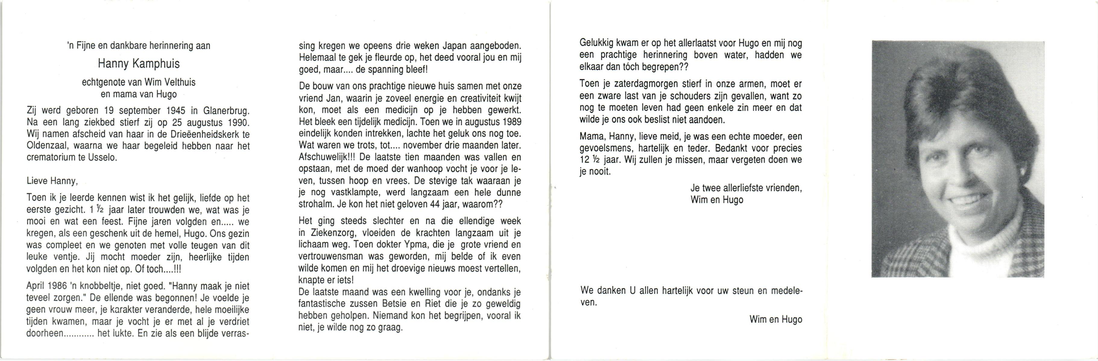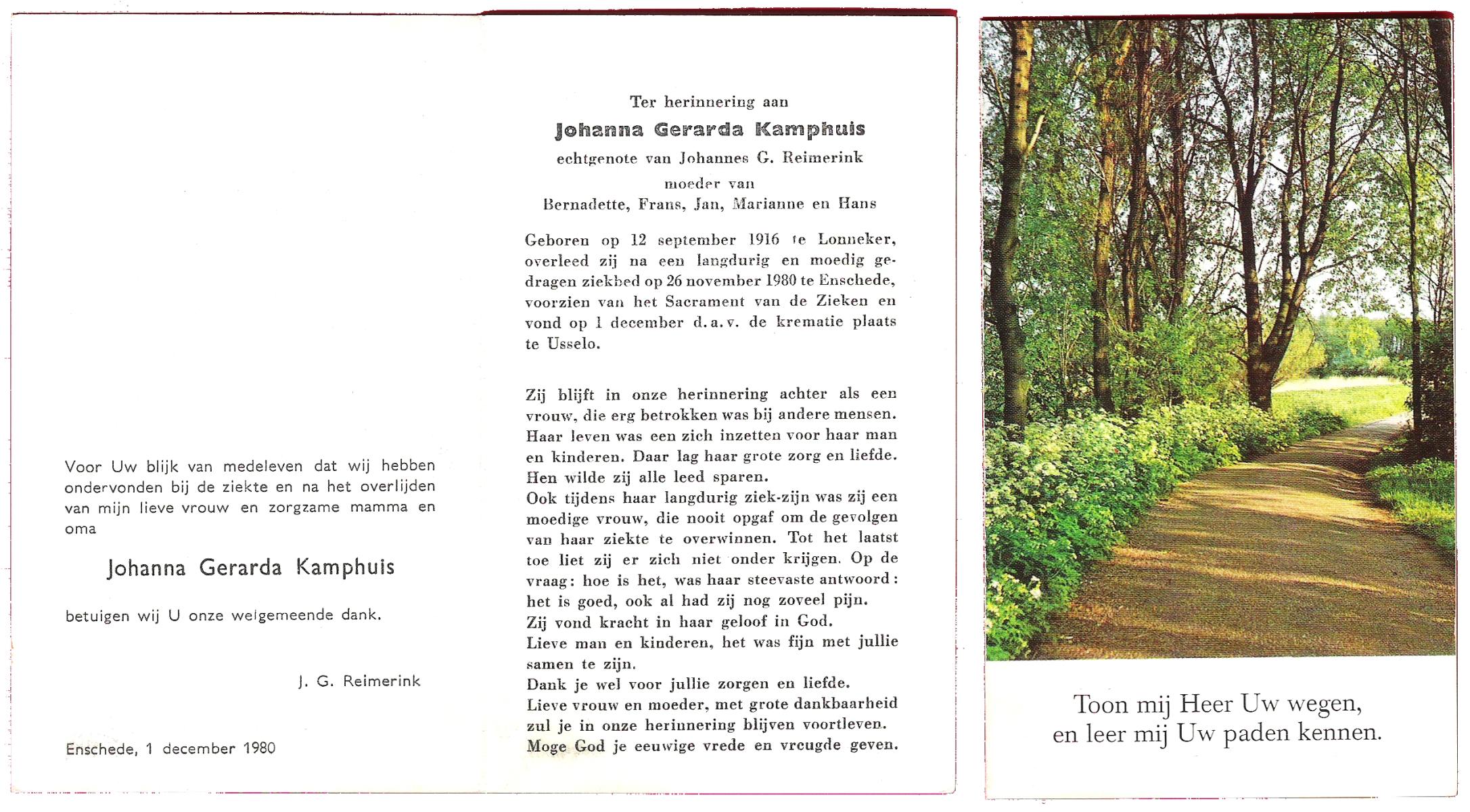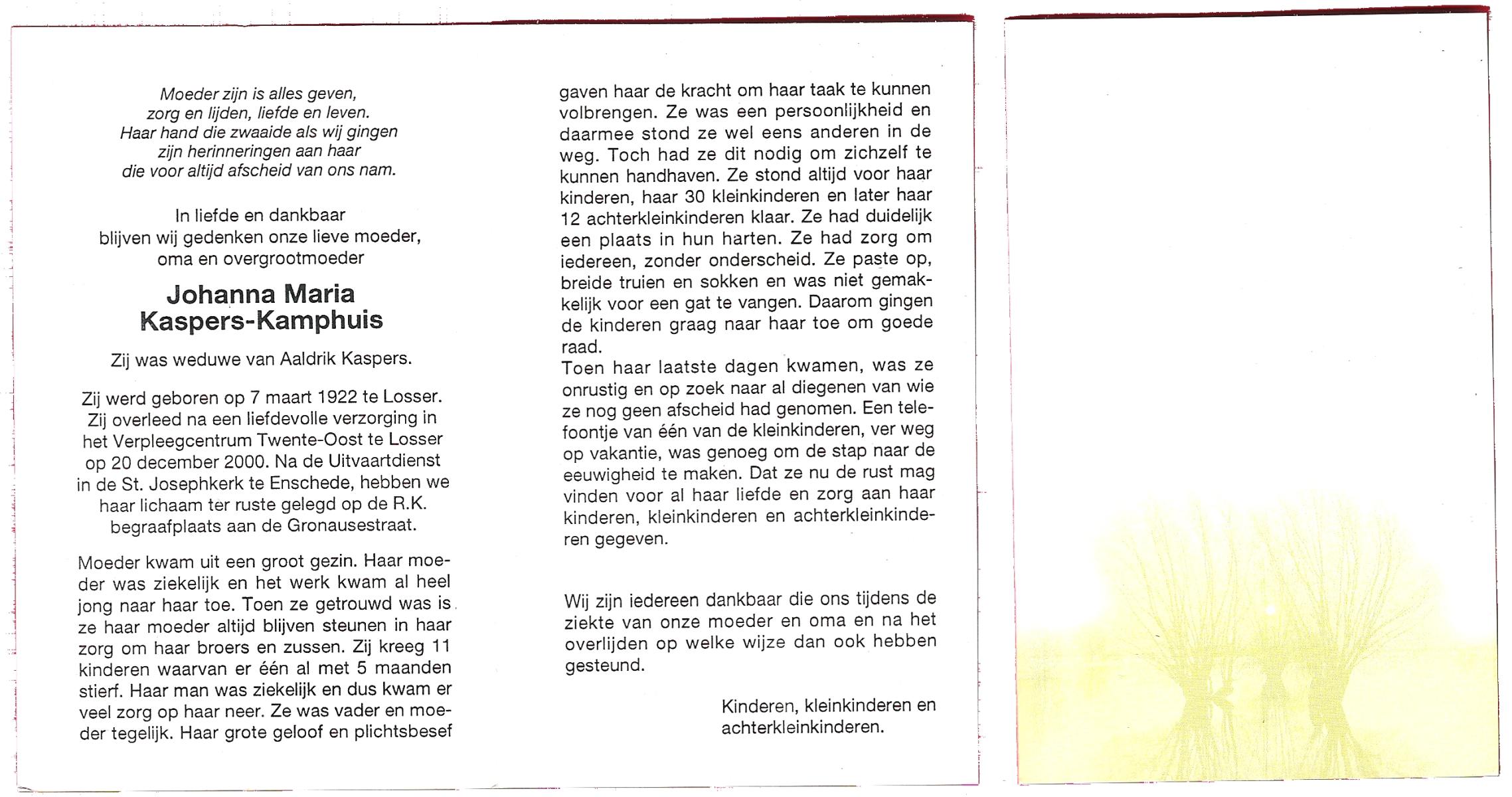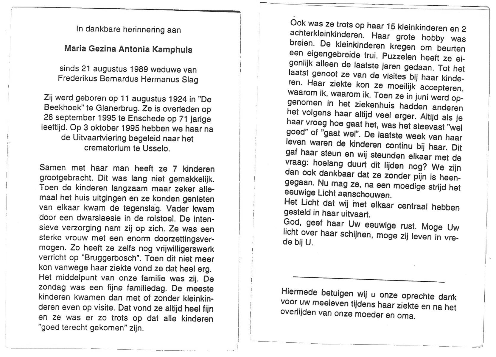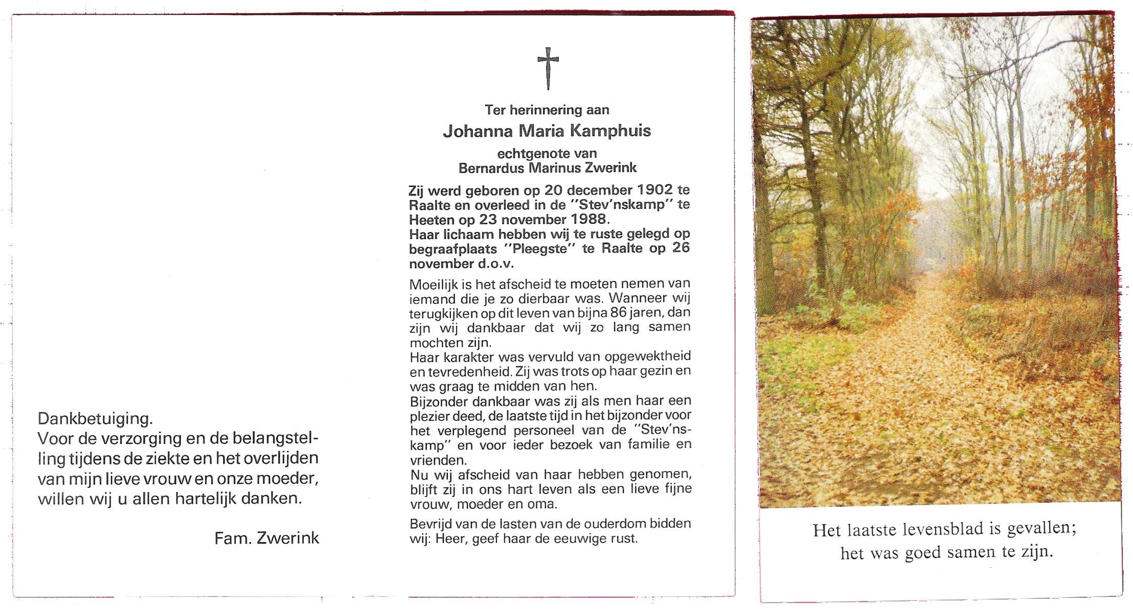 KAMPHUIS, , Maria Hendrika Josephina, geboren op 9-1-1917 te Enschede, overleden op 24-12-1989 te Enschede op 71-jarige leeftijd, gecremeerd op 29-12-1989 te Usselo.