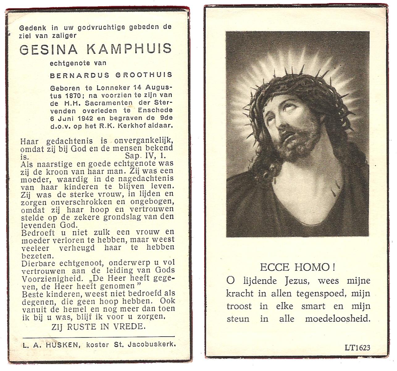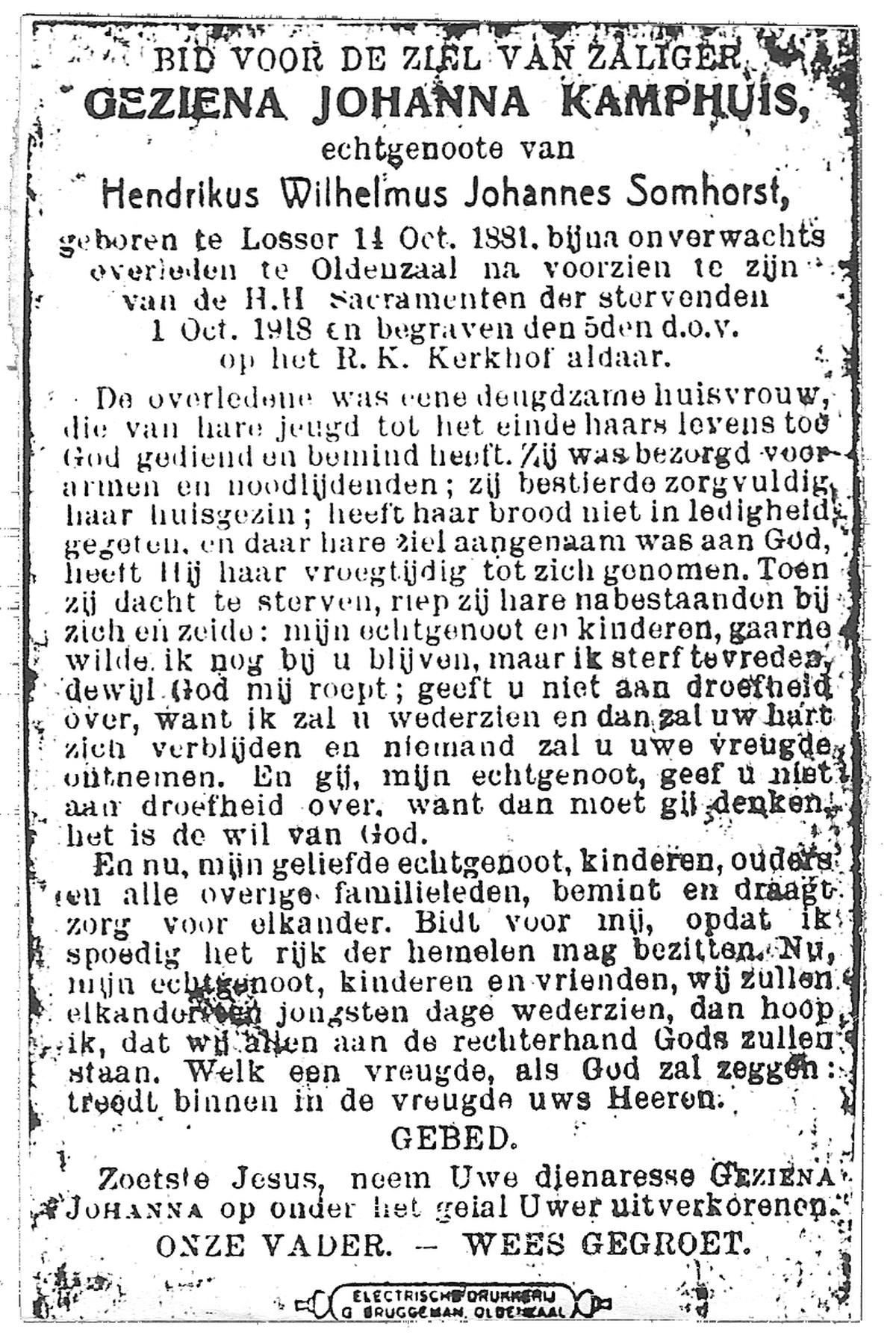 JANSINK, Geradus, geboren op 12-09-1870 te Lonneker, overleden op 5-9-1918 te Losser op 47-jarige leeftijd, begraven op 9-9-1918 te Losser.