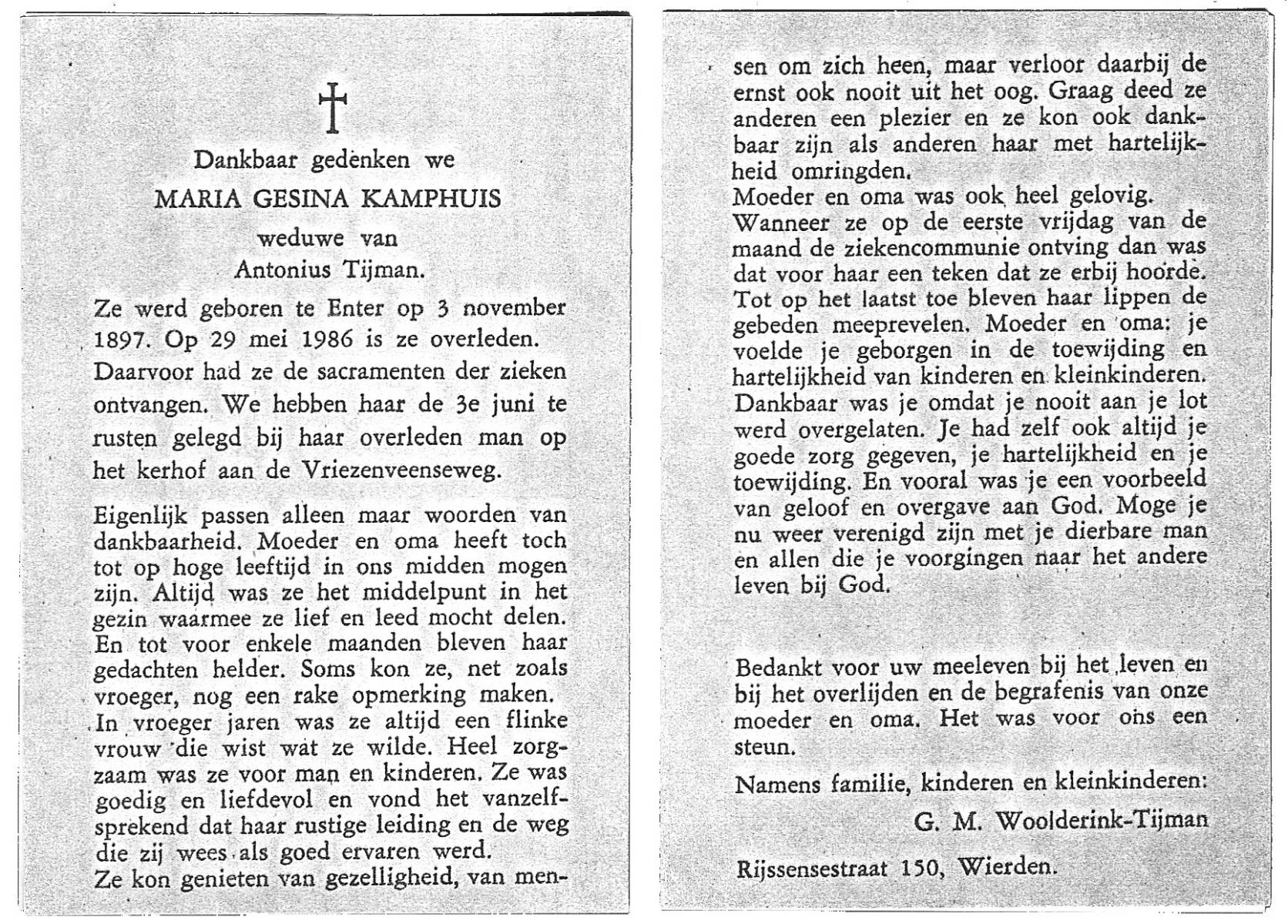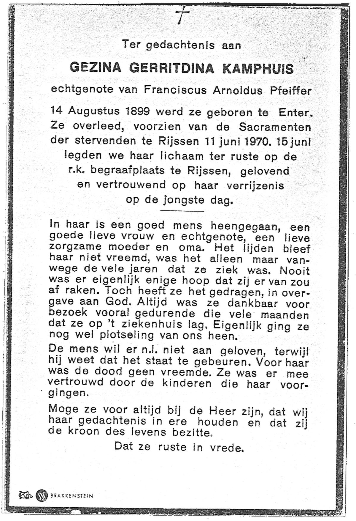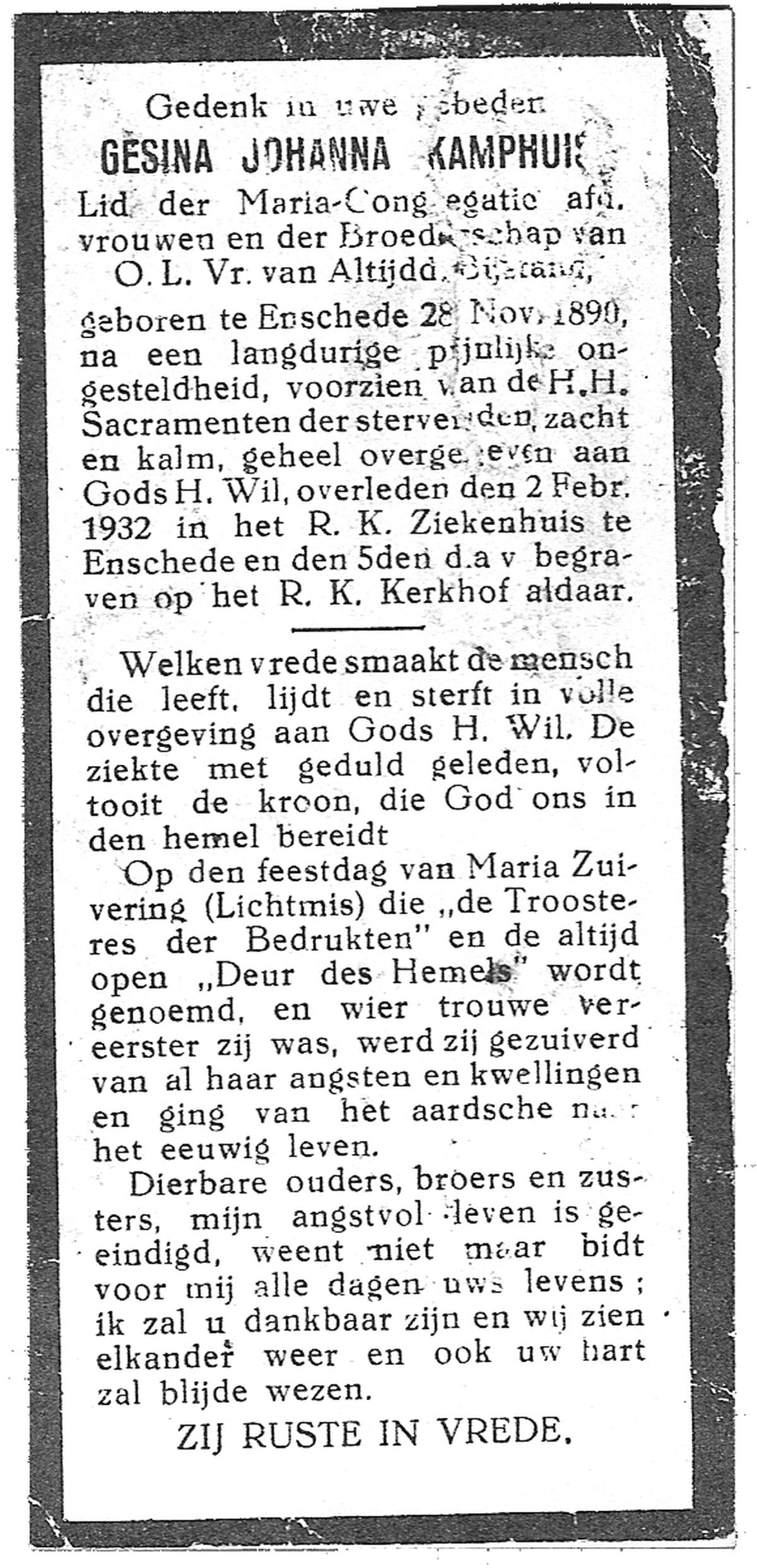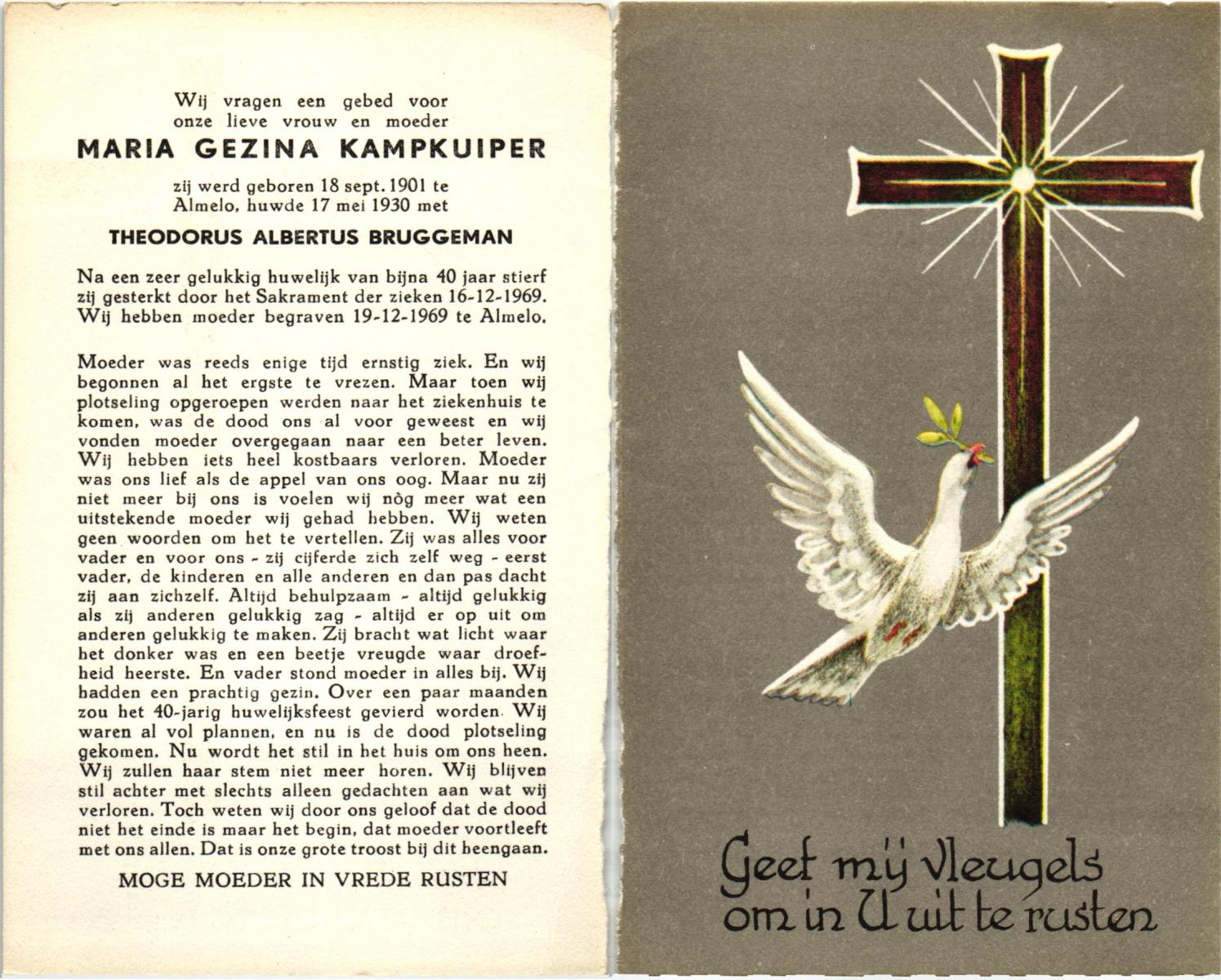KAMPKUIPER, Maria Gezina, geboren op 18-9-1901 te Almelo, overleden op 16-12-1969 te Almelo op 68-jarige leeftijd, begraven op 19-12-1969 te Almelo.
