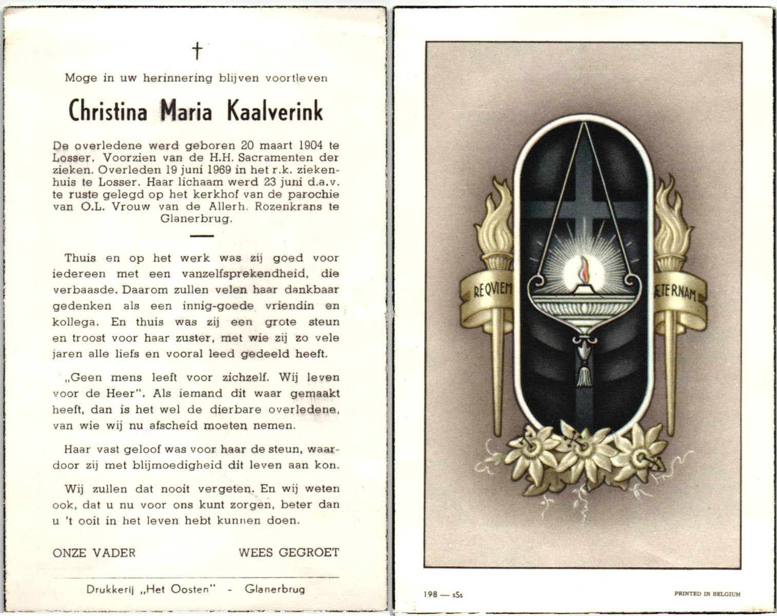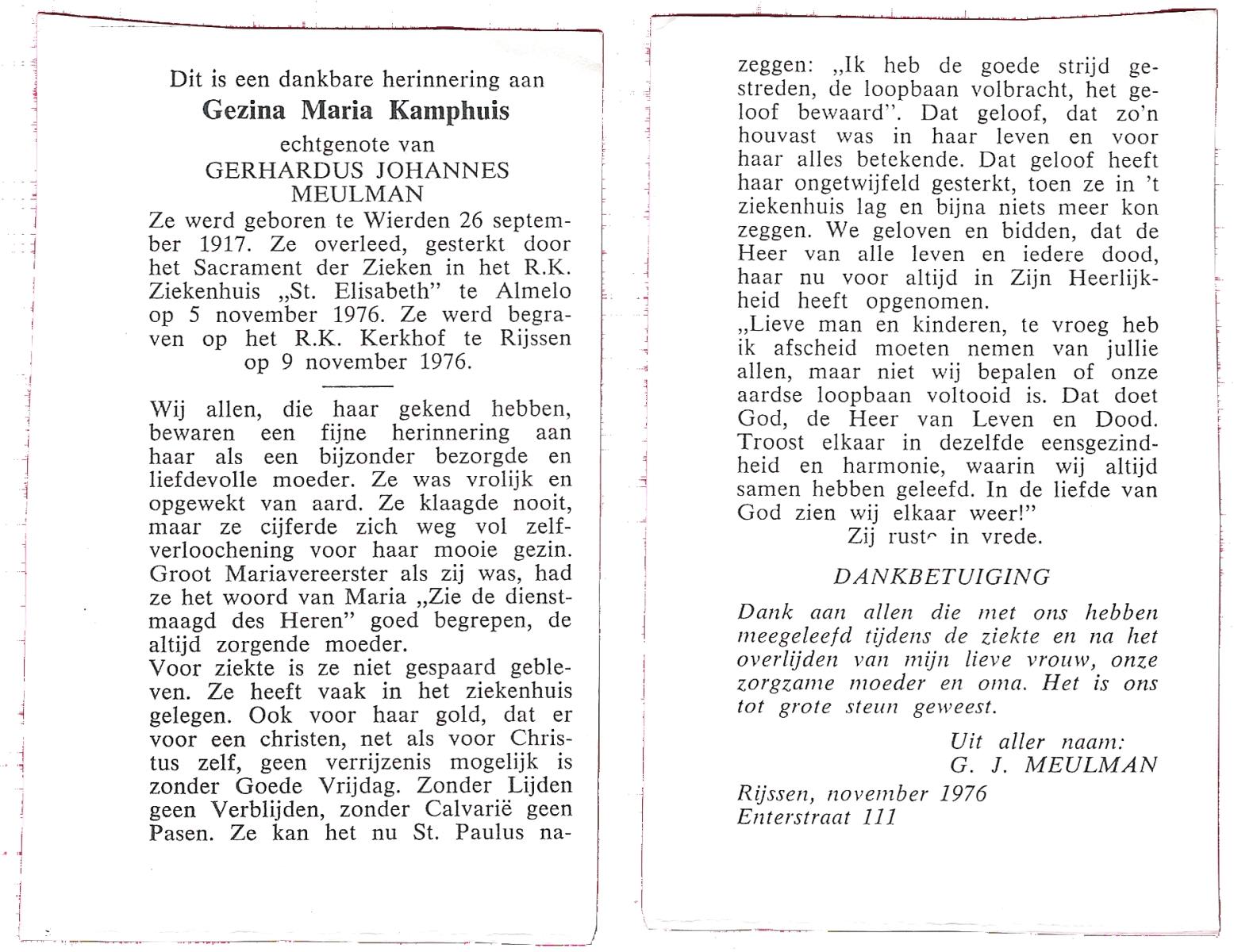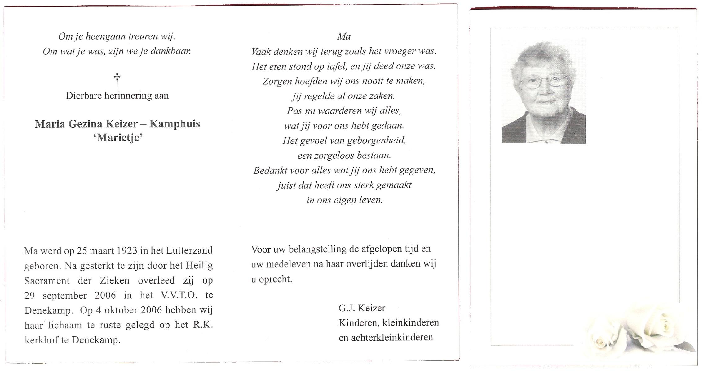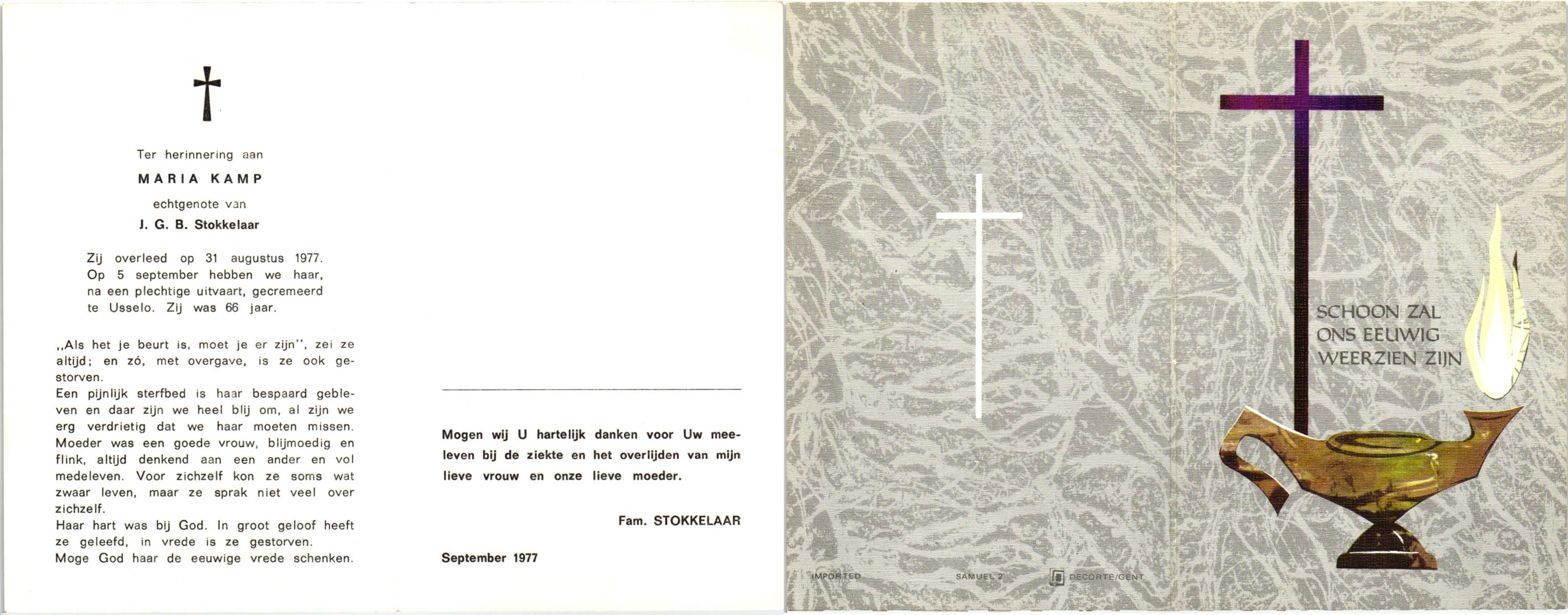 KAMPKUIPER, Maria Gezina, geboren op 18-9-1901 te Almelo, overleden op 16-12-1969 te Almelo op 68-jarige leeftijd, begraven op 19-12-1969 te Almelo.
