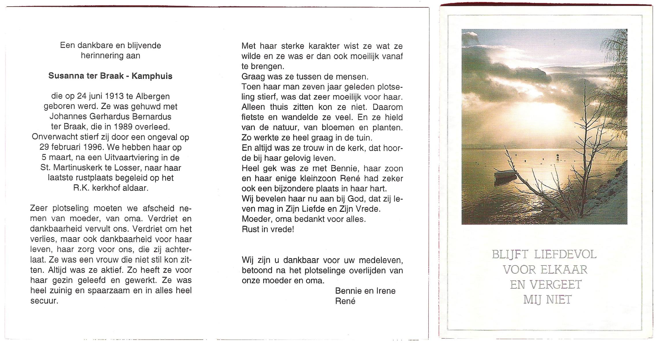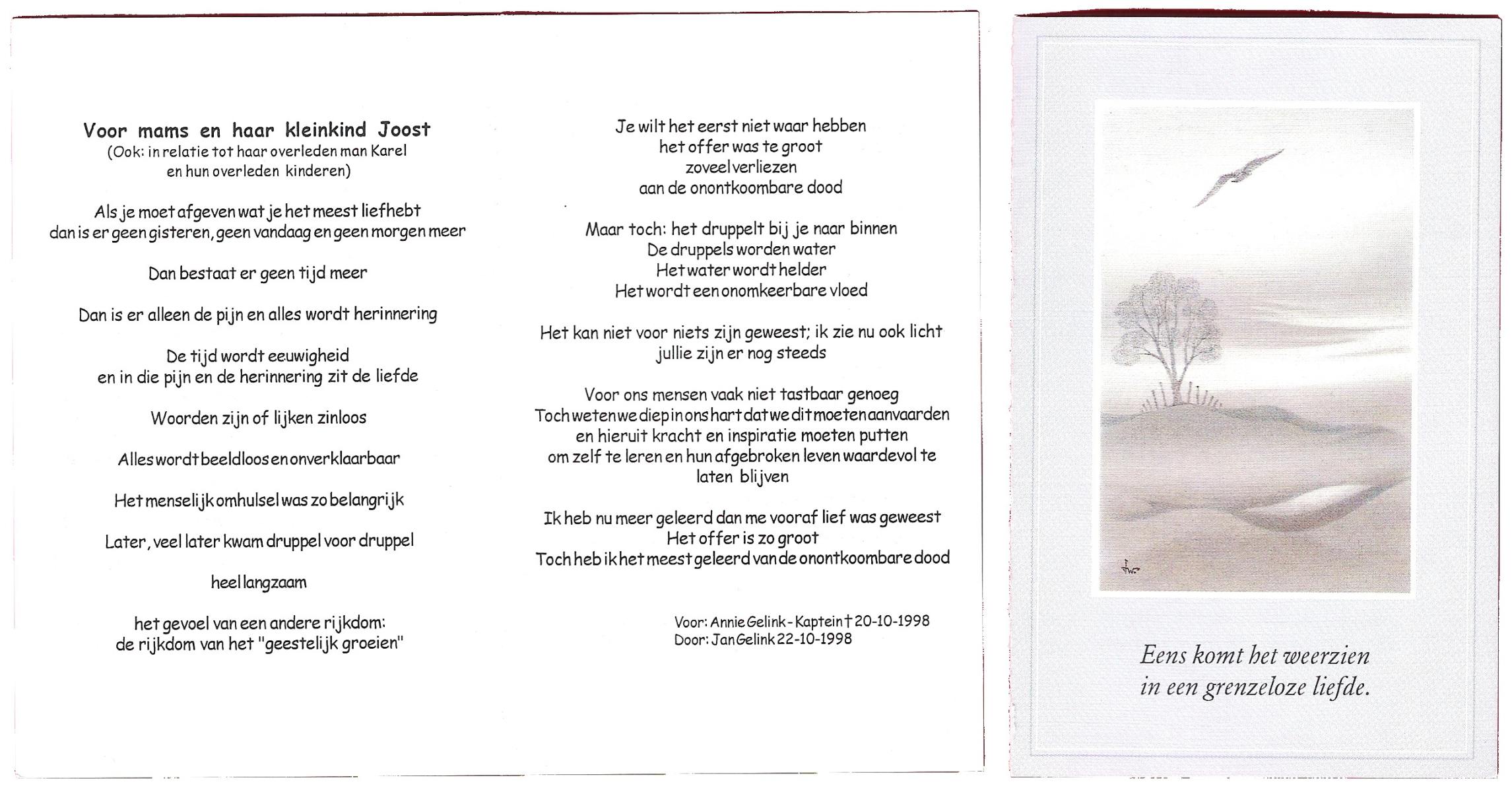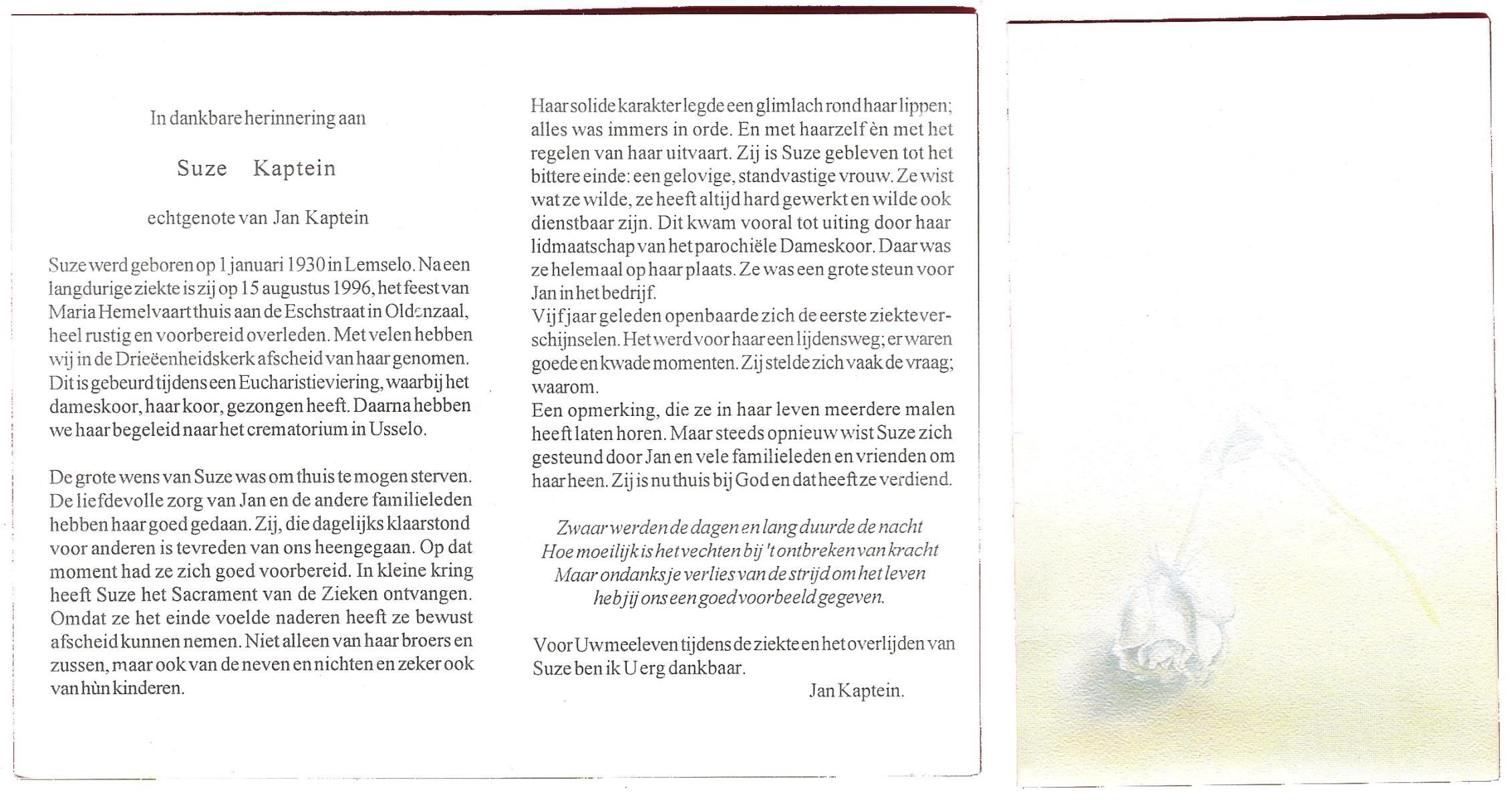 KAPTEIN, Suze, geboren op 1-1-1930 te Lemselo, overleden op 15-8-1996 te Oldenzaal op 66-jarige leeftijd, gecremeerd te Usselo.