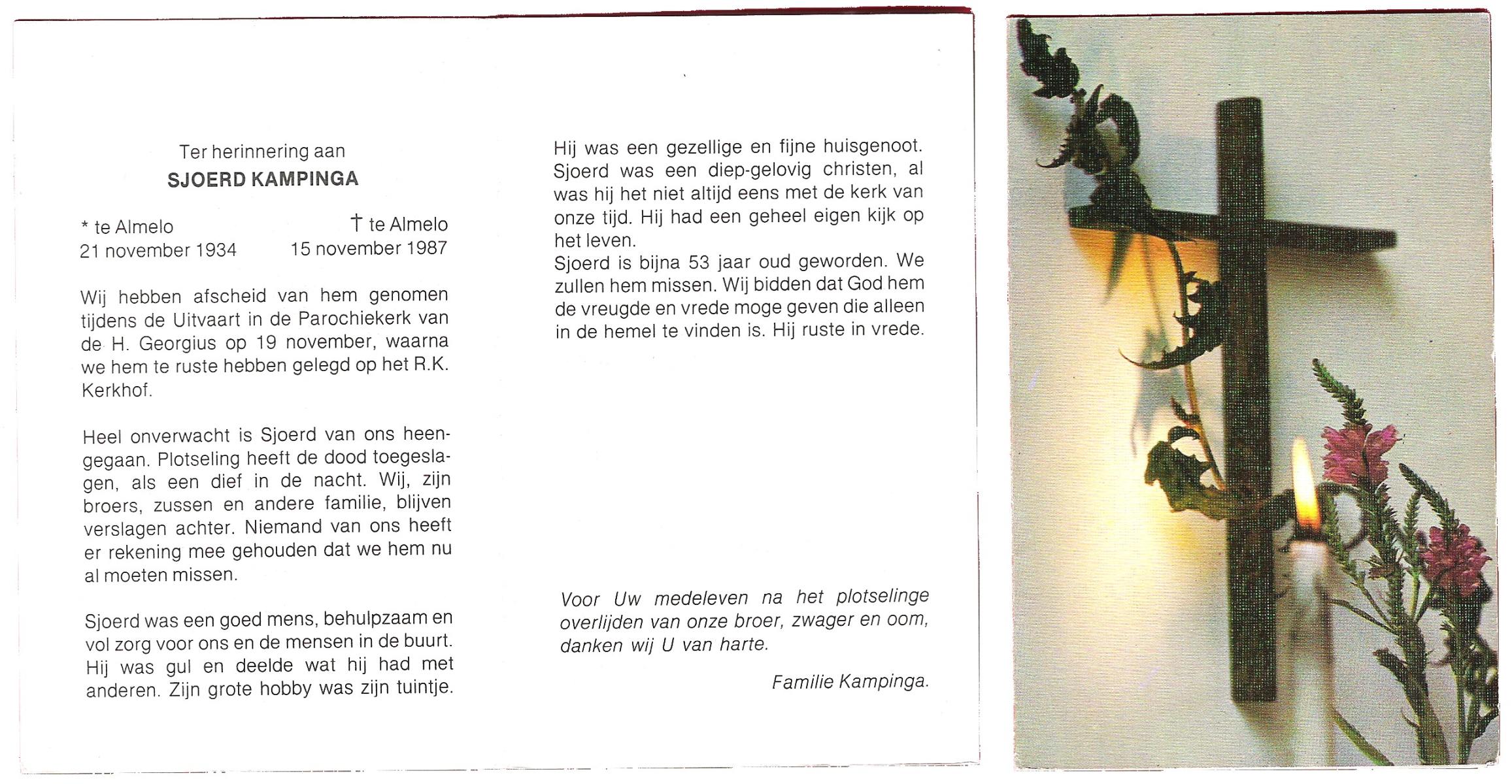 KAMPINGA, Sjoerd, geboren op 21-11-1934 te Almelo, overleden op 15-11-1987 te Almelo op 53-jarige leeftijd, begraven op 19-11-1987 te Almelo R.K.Kerkhof.