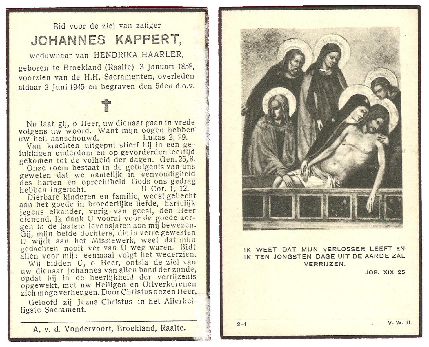 KAPPERT, Johannes, geboren op 03-01-1858 te Broekland, overleden op 2-6-1945 te Broekland op 87-jarige leeftijd, begraven op 5-6-1945 te Raalte.