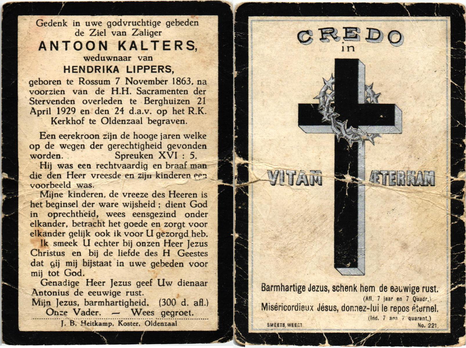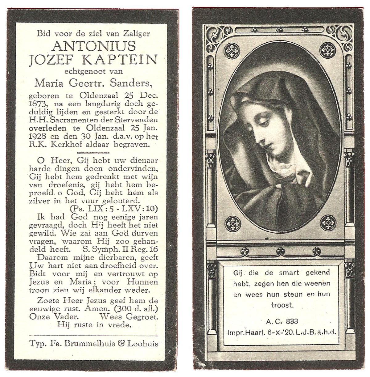 KAPTEIN, Antonius Jozef, geboren op 25-12-1873 te Oldenzaal, overleden op 25-1-1928 te Oldenzaal op 55-jarige leeftijd, begraven op 30-1-1928 te Oldenzaal.