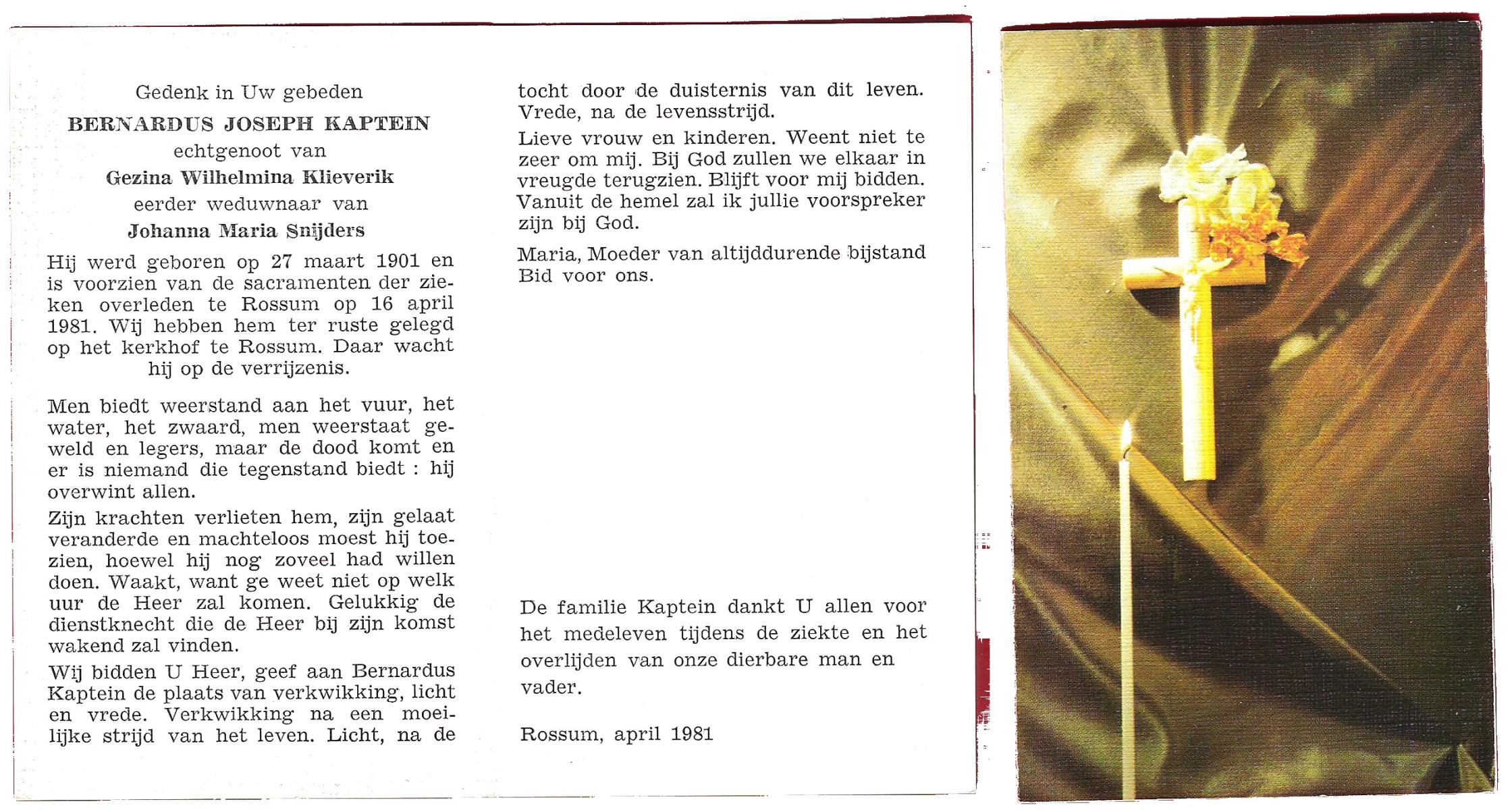 KAPTEIN, Bernardus Joseph, geboren op 27-3-1901, overleden op 16-4-1981 te Rossum op 80-jarige leeftijd, begraven te Rossum.
