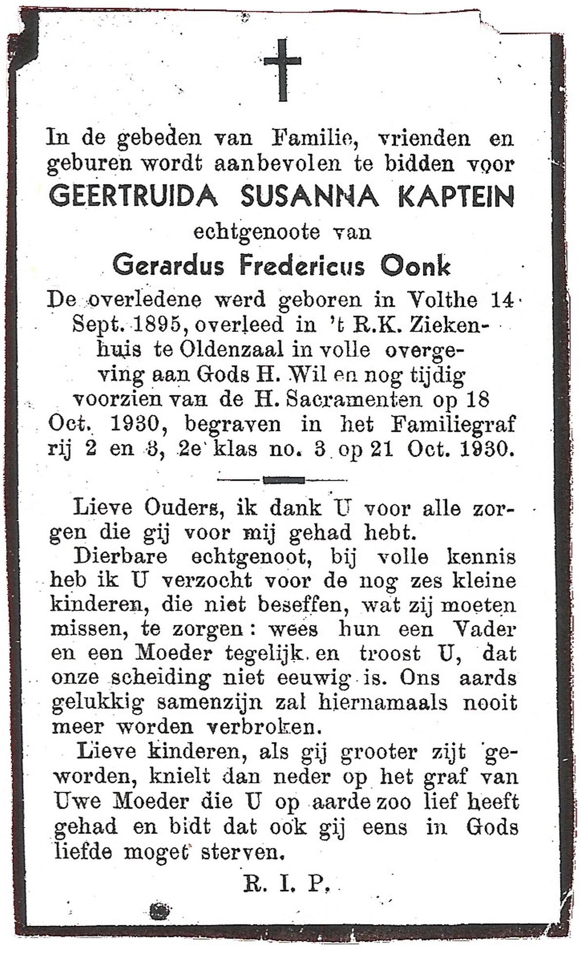 KAPTEIN, Geertruida Susanna, geboren op 14-09-1895 te Volthe, overleden op 18-10-1930 te Oldenzaal op 35-jarige leeftijd, begraven op 21-10-1930.