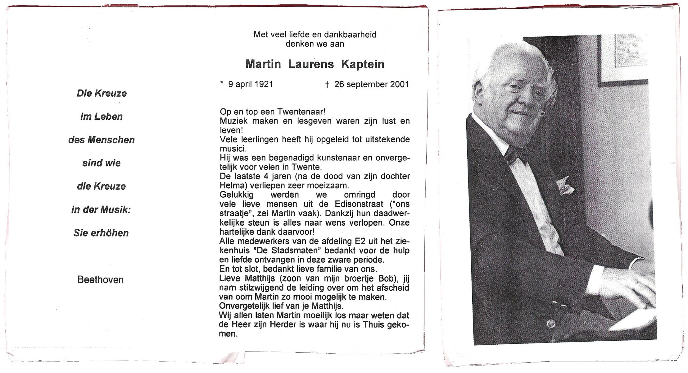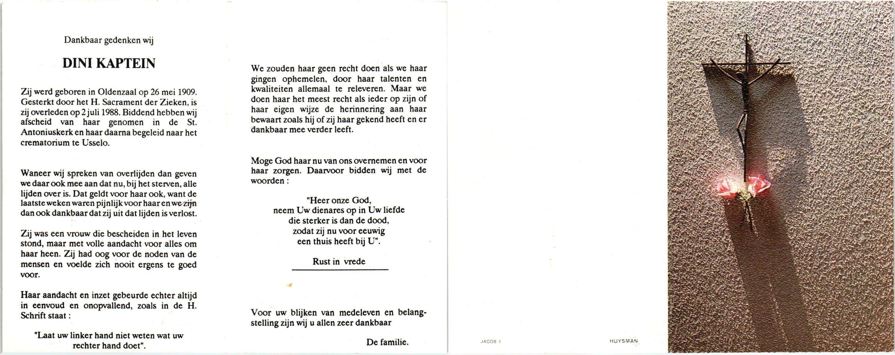 KAPTEIN, Dini, geboren op 26-5-1909 te Oldenzaal, overleden op 2-7-1988 op 79-jarige leeftijd, gecremeerd te Usselo.