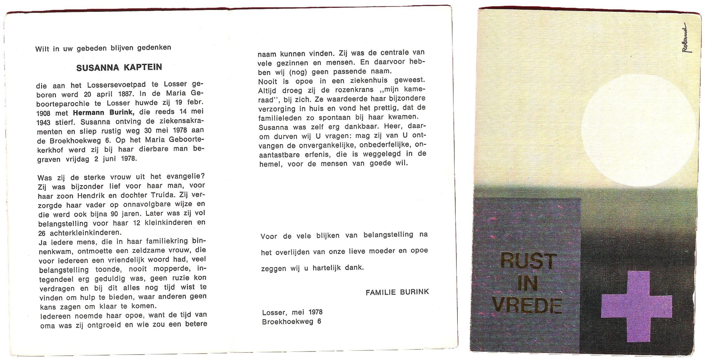 KAPTEIN, Susanna, geboren op 20-04-1887 te Losser, overleden op 30-5-1978 te Losser op 91-jarige leeftijd, begraven op 2-6-1978 te Losser.